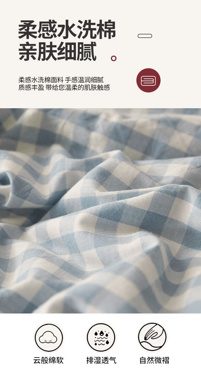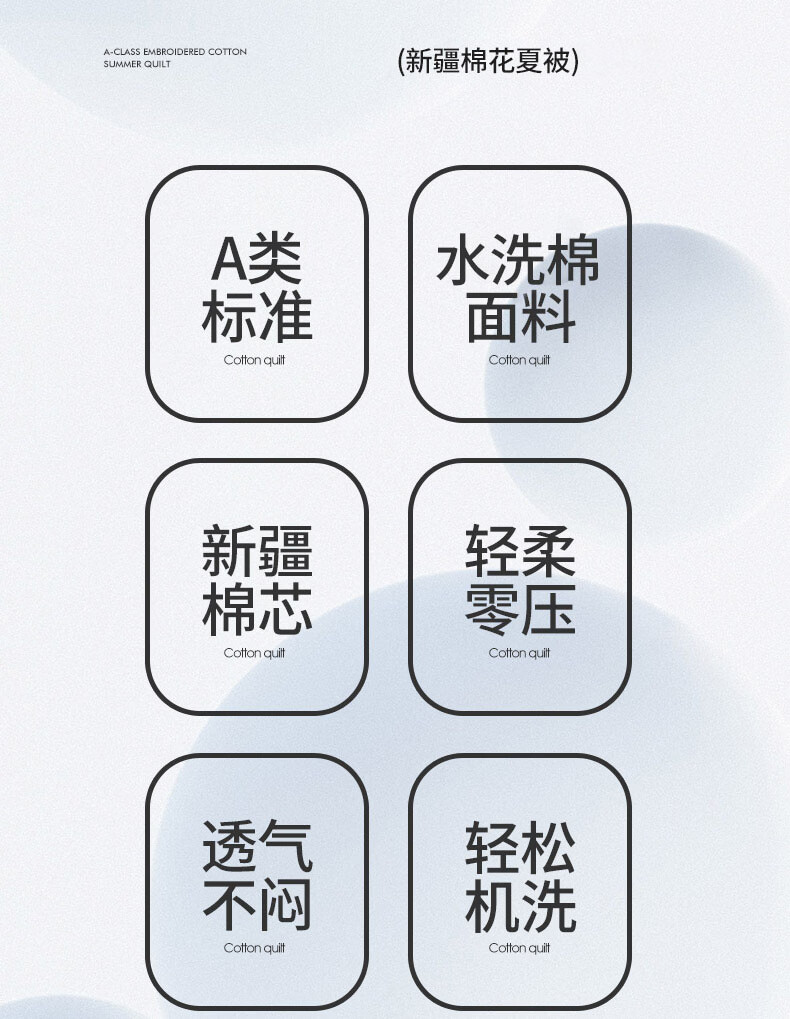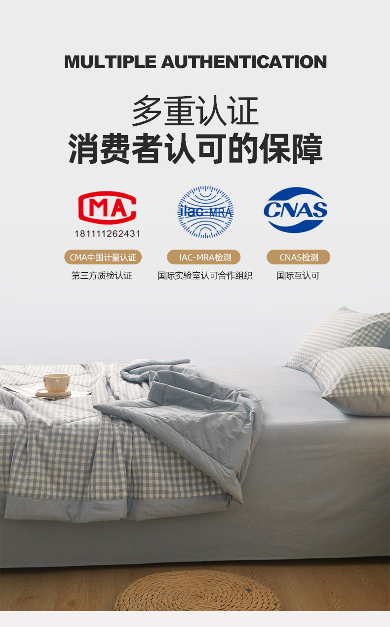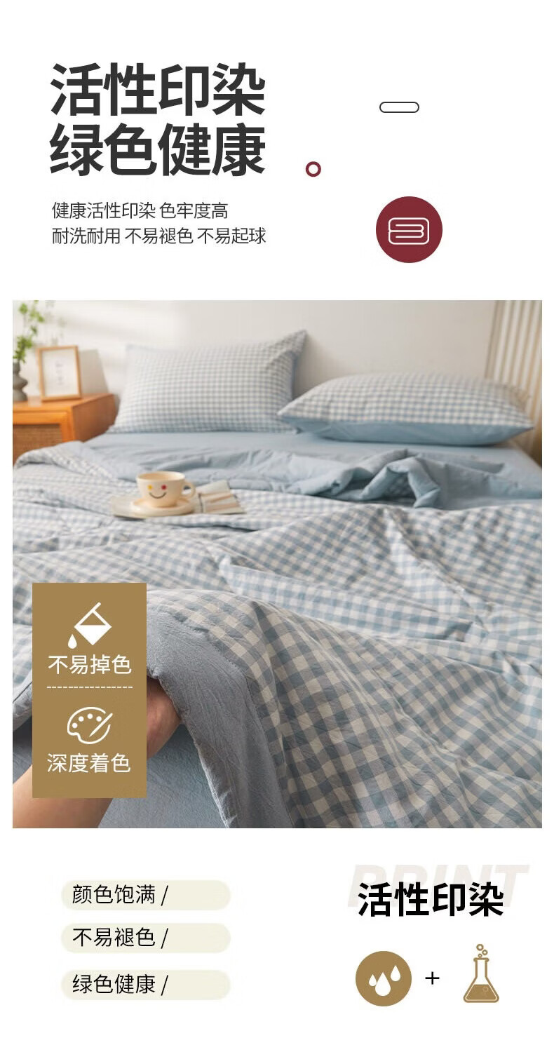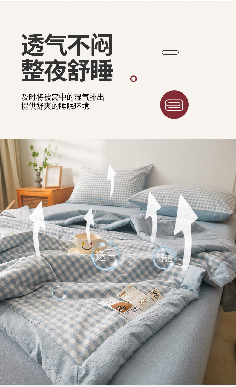甄选A类水洗棉面料,无荧光等有害物质,呵护安心睡眠;填充整张100%新疆棉花,蓬松性好,亲肤细腻;新一代活性印染工艺,颜色靓丽,不易起球,不易褪色