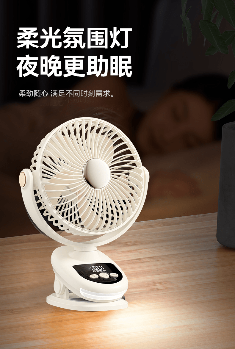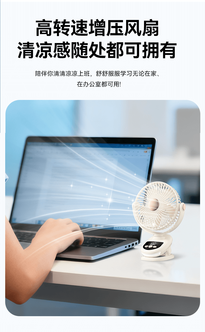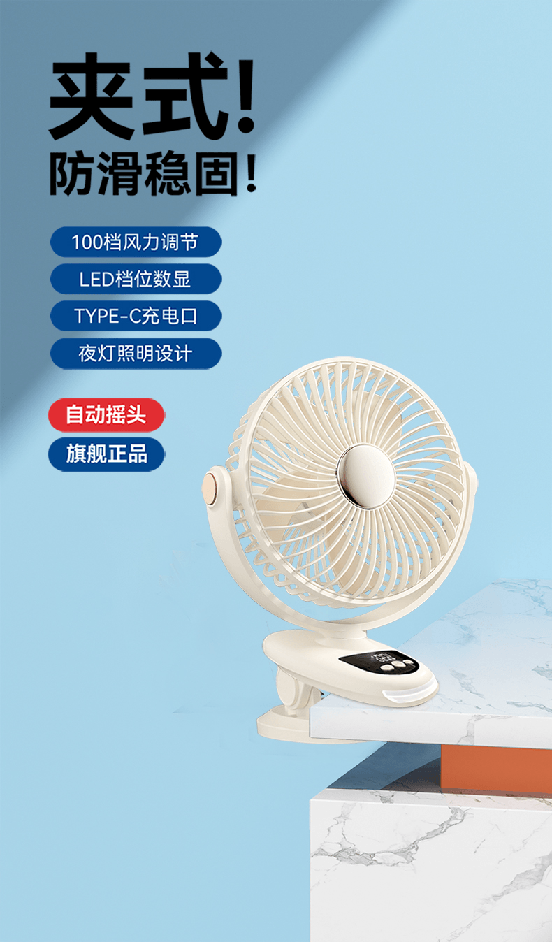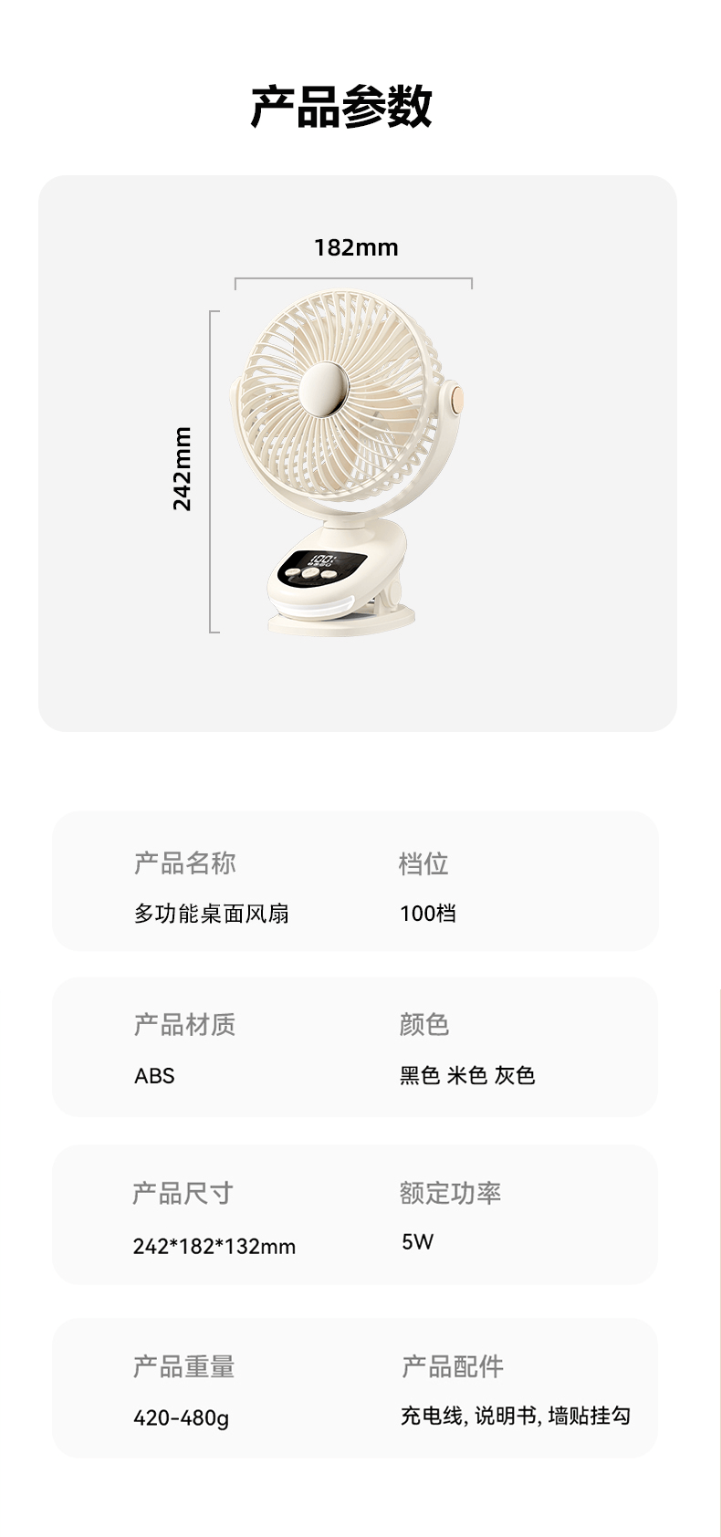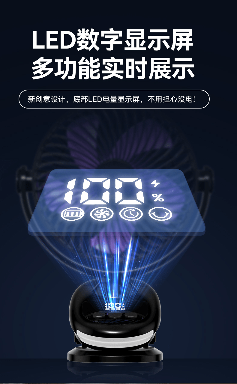 品风量100档可调,超强风力、左右可遥头;内置电芯3000mAh 桌面夹子两用;定时,数显电量、手机通用Type-c充电接口