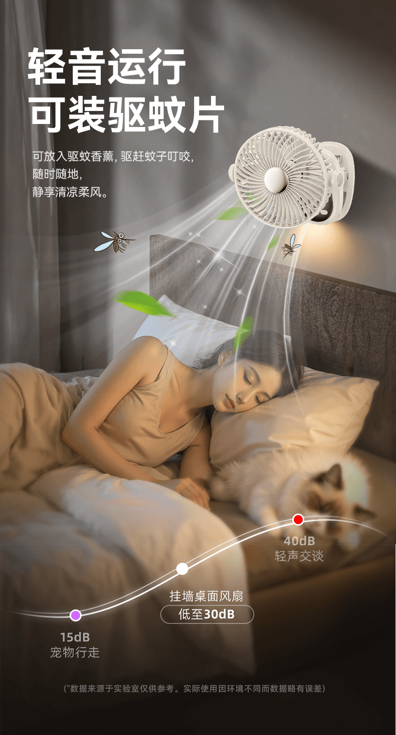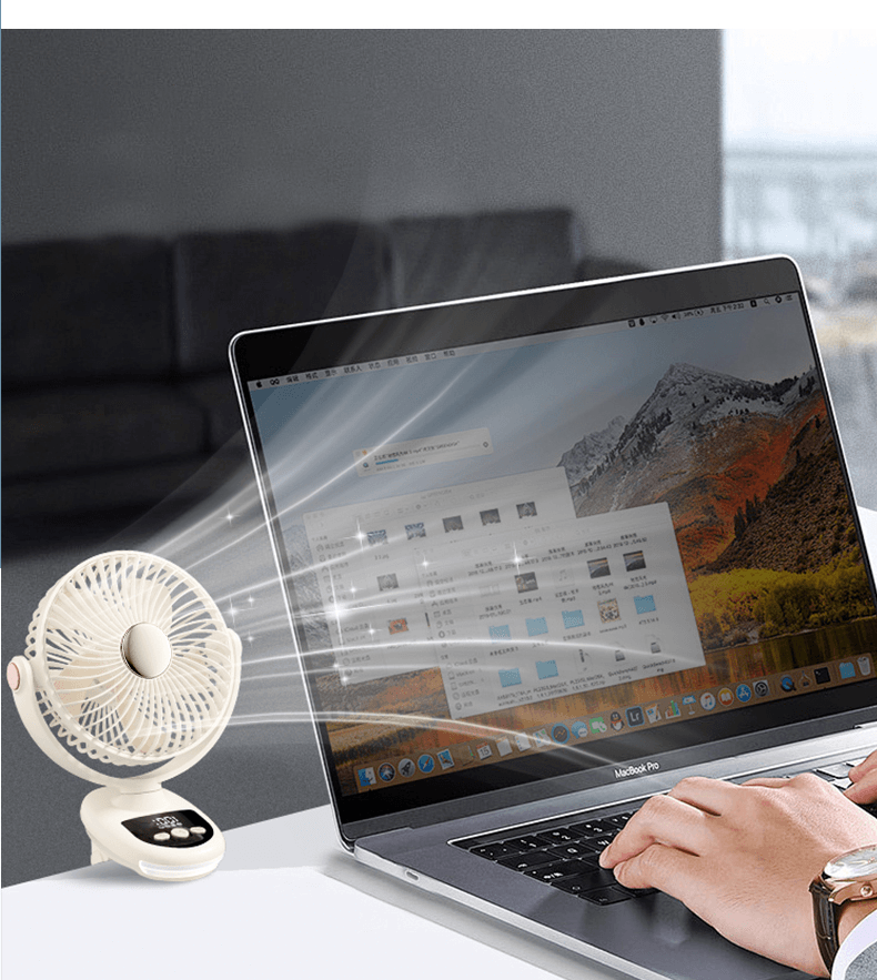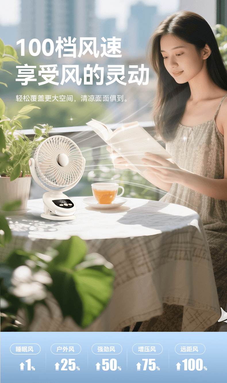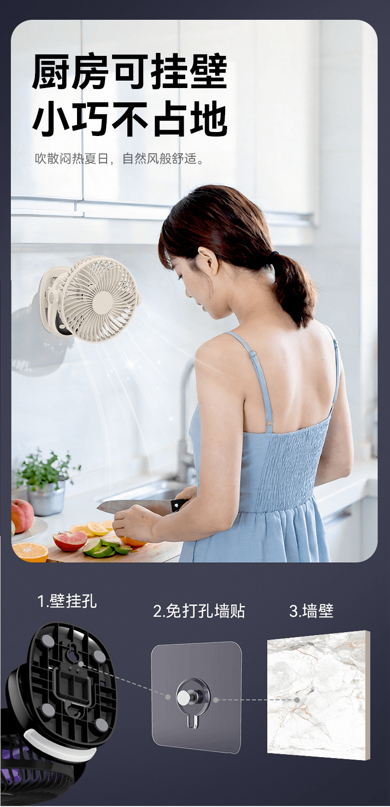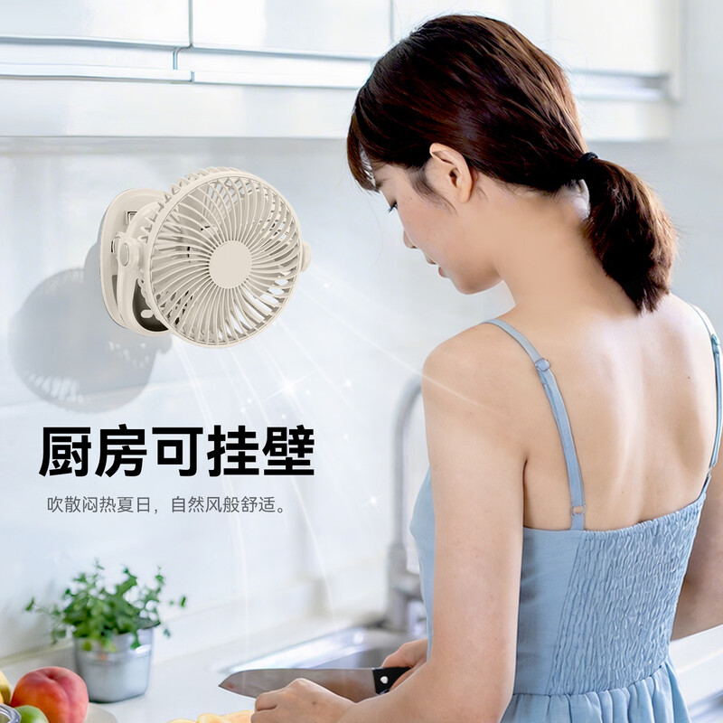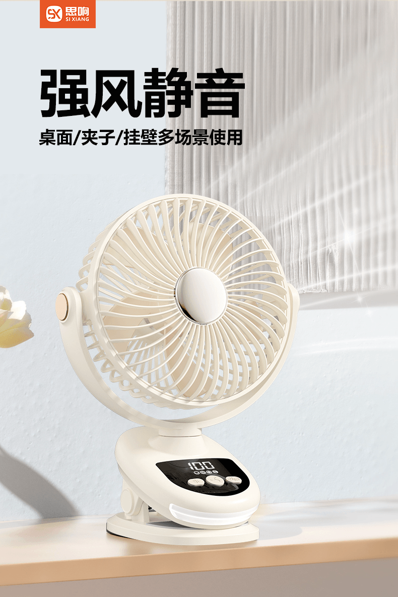 品风量100档可调,超强风力、左右可遥头;内置电芯3000mAh 桌面夹子两用;定时,数显电量、手机通用Type-c充电接口