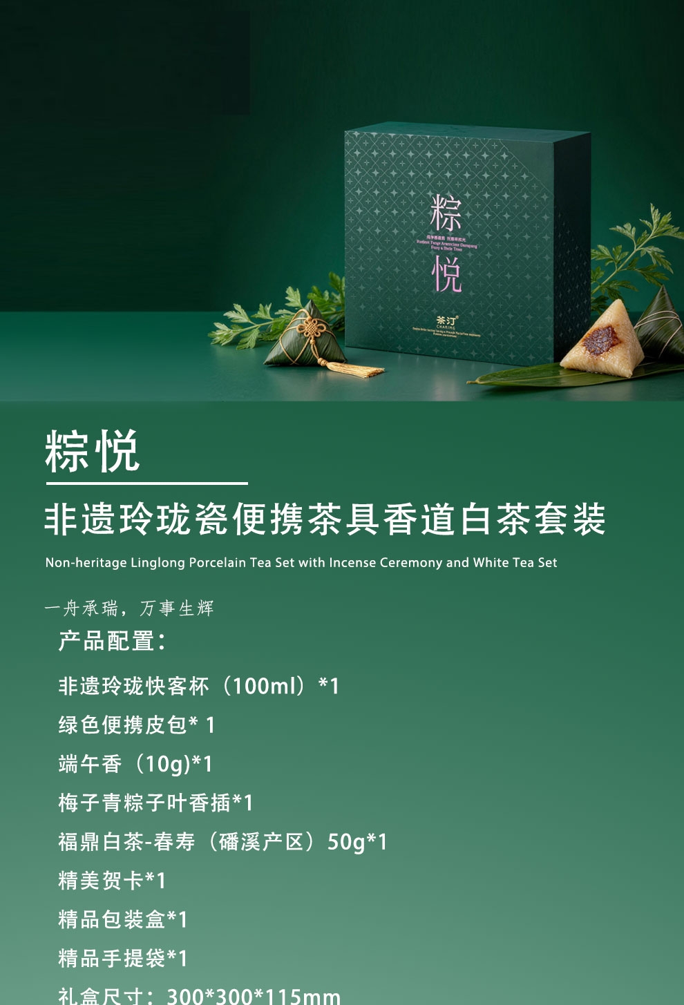 配置清单:非遗玲珑快客杯(100ml)*1绿色便携皮包*1端午香(10g)*1梅子青粽子叶香插*1 福鼎白茶一 福鼎白茶-春寿(磻溪产区)50g*1精美贺卡*1精品包装盒*1 精品手提袋*1