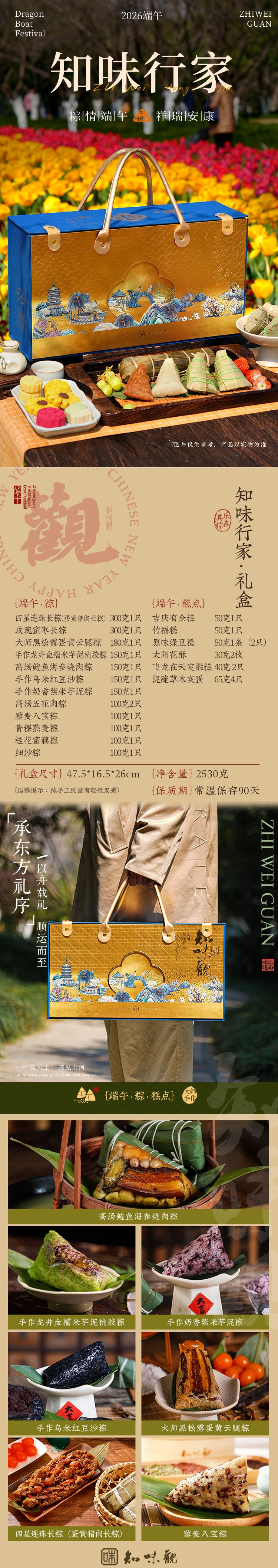 配置清单:300克四星连珠长粽(蛋黄猪肉长粽)*1 300克玫瑰蜜枣长粽*1 180克大师黑松露蛋黄云腿粽*1只 150克手作龙井血糯米芋泥桃胶粽*1 150克高汤鲍鱼海参烧肉粽*1只 150克手作乌饭红豆沙粽*1只 150克手作奶香紫米芋泥粽*1只 100克高汤五花肉粽*2 100克藜麦八宝粽*1 100克青稞燕麦粽*1 100克桂花蜜藕粽*1 100克细沙粽*1 50克吉庆有余*1 只 50克竹福糕*1只 50克原味绿豆糕*1条(2只) 30克太阳花酥*2枚 40克飞龙在天定胜糕 2只 65克泥腌草木灰蛋*4只