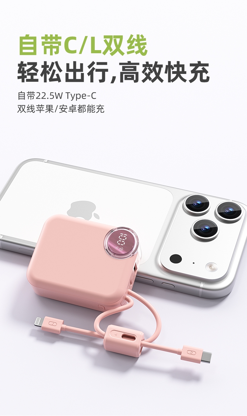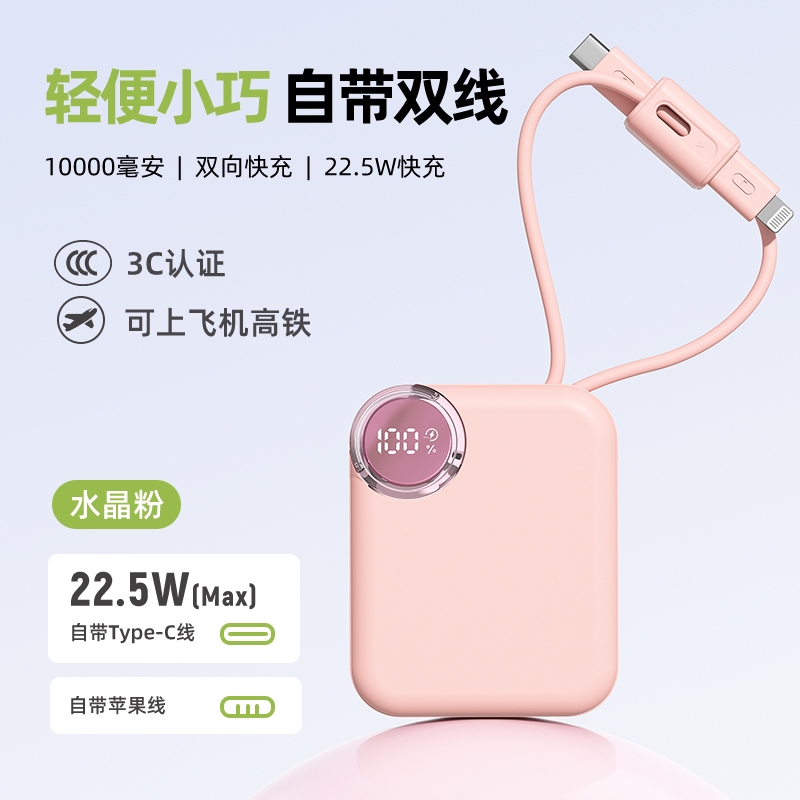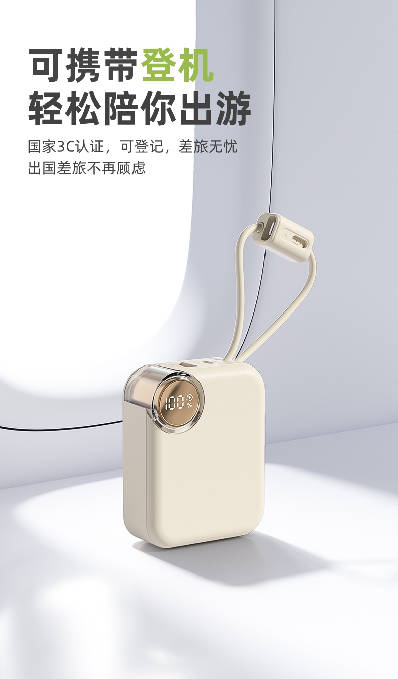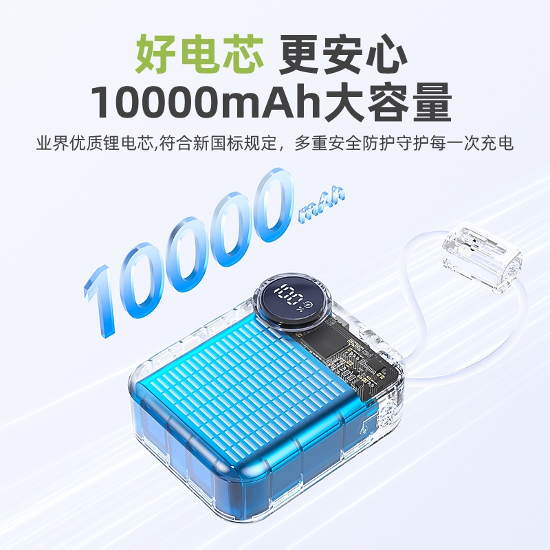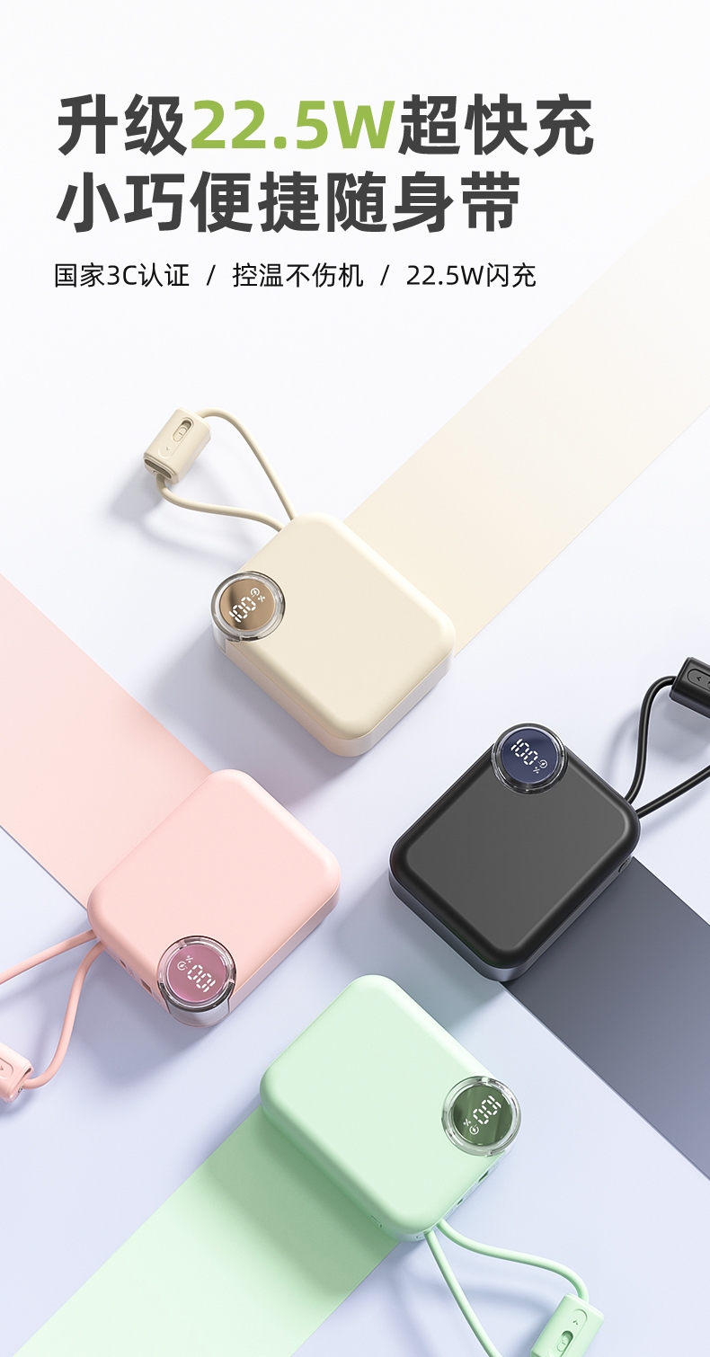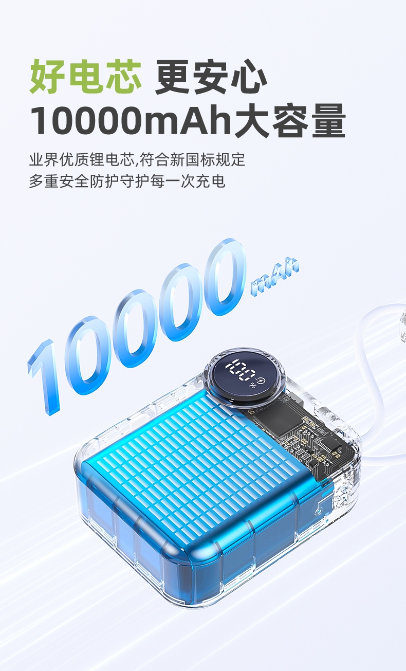 10000毫安,体积超小;数字电量精准显示;22.5W超级快充,兼容PD20W;内置苹果/Type-C接口满足各种手机充电;符合民航局标准,可随身携带