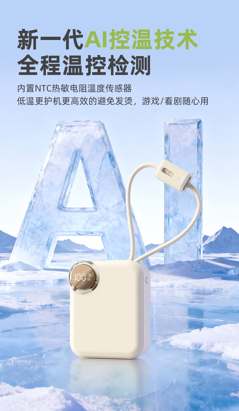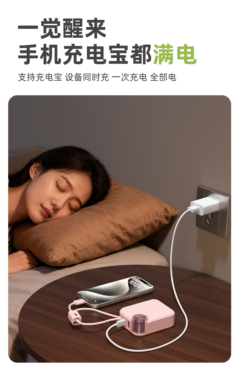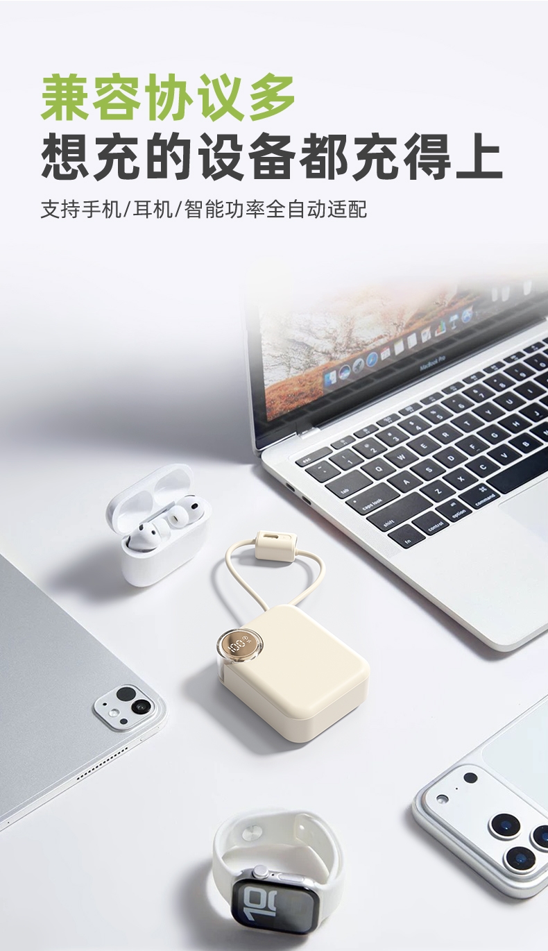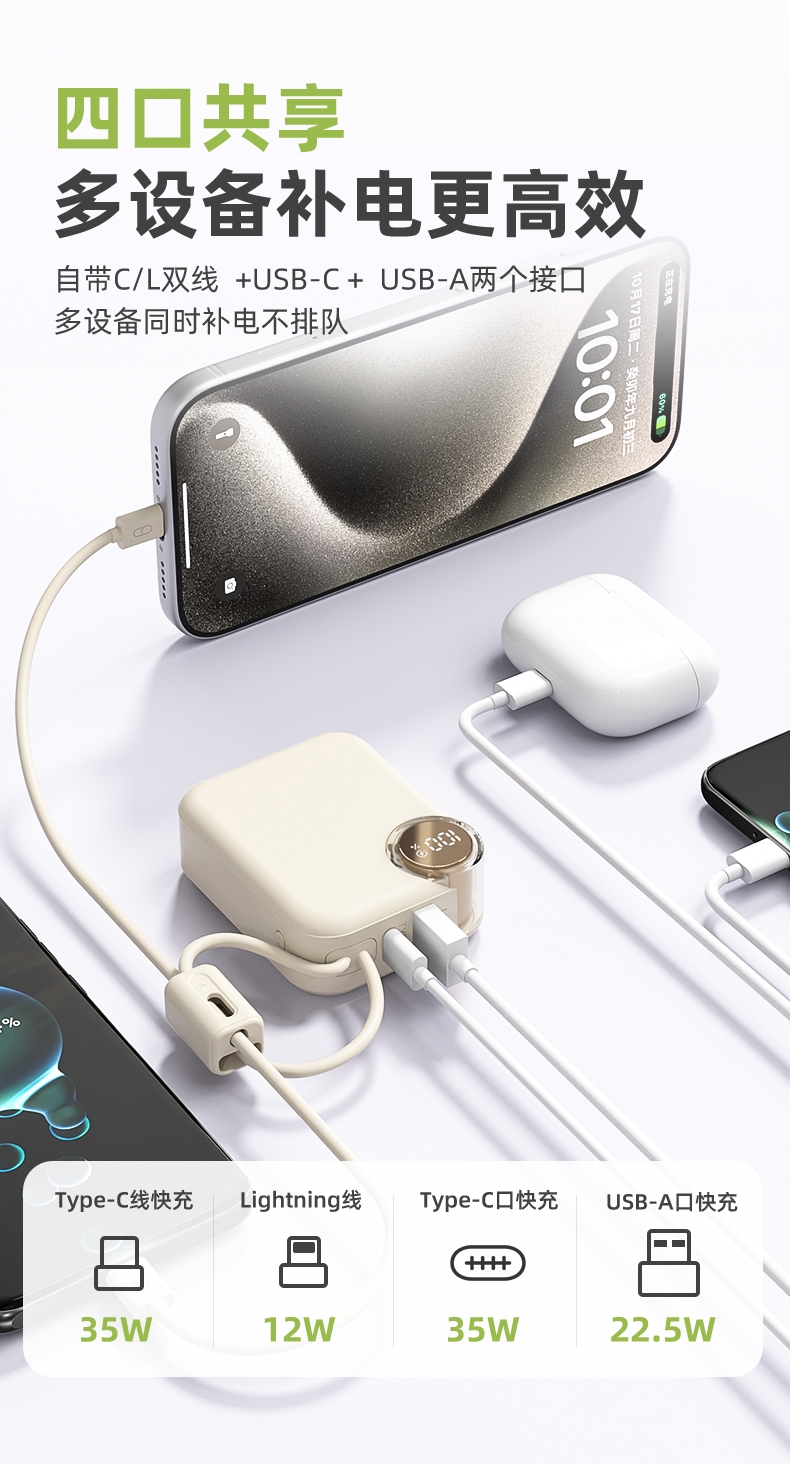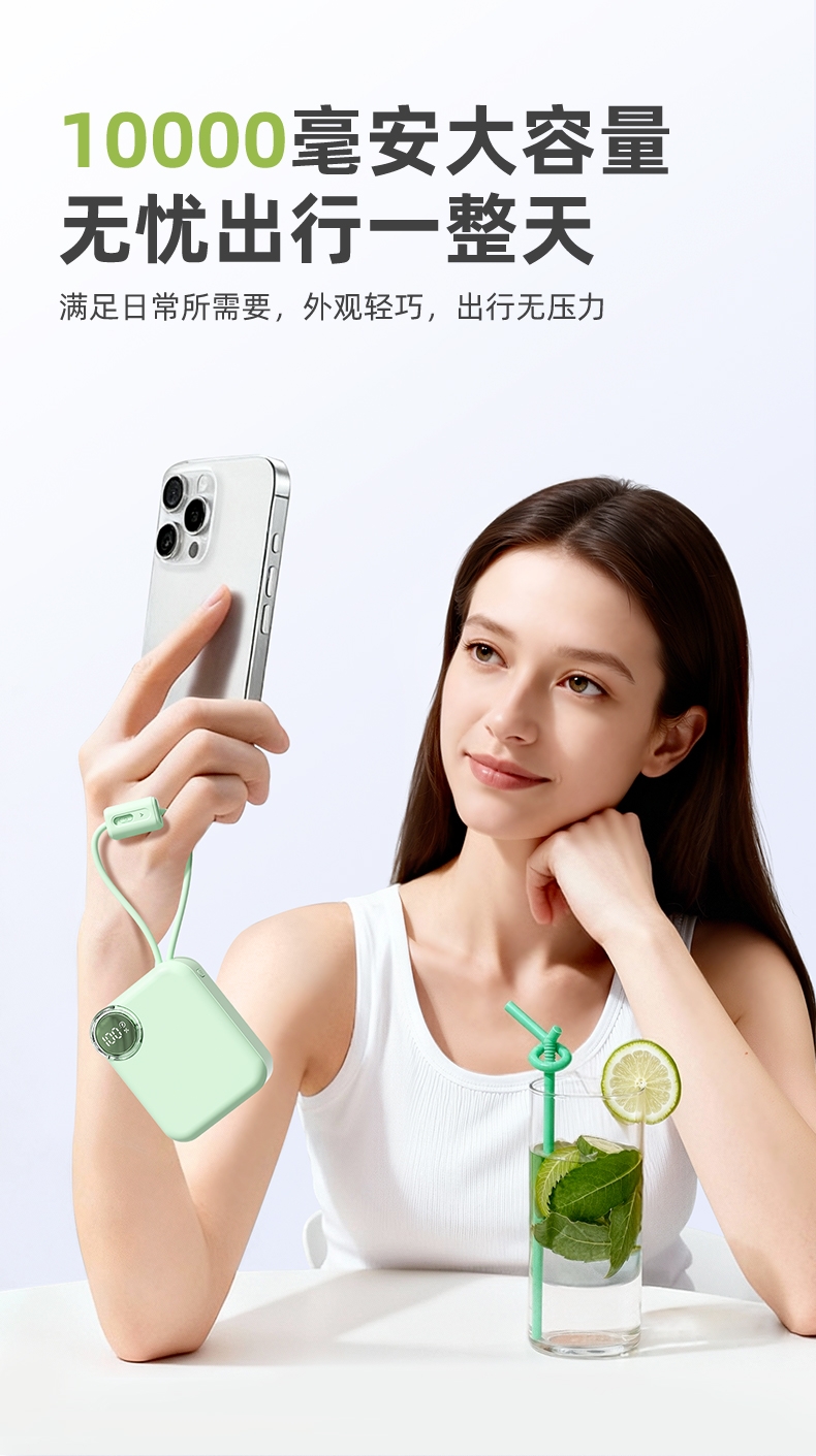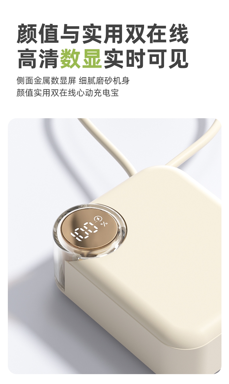 10000毫安,体积超小;数字电量精准显示;22.5W超级快充,兼容PD20W;内置苹果/Type-C接口满足各种手机充电;符合民航局标准,可随身携带