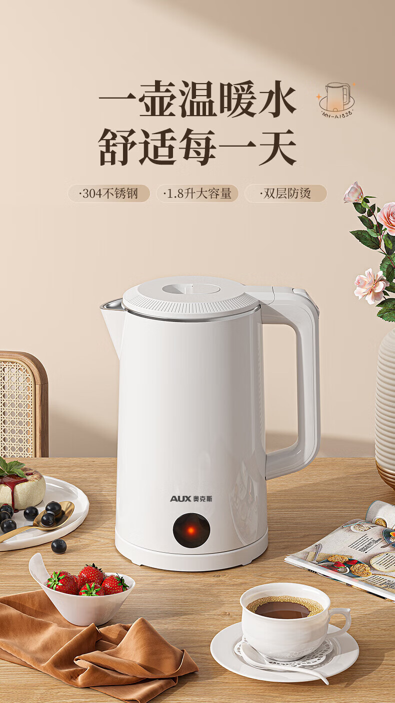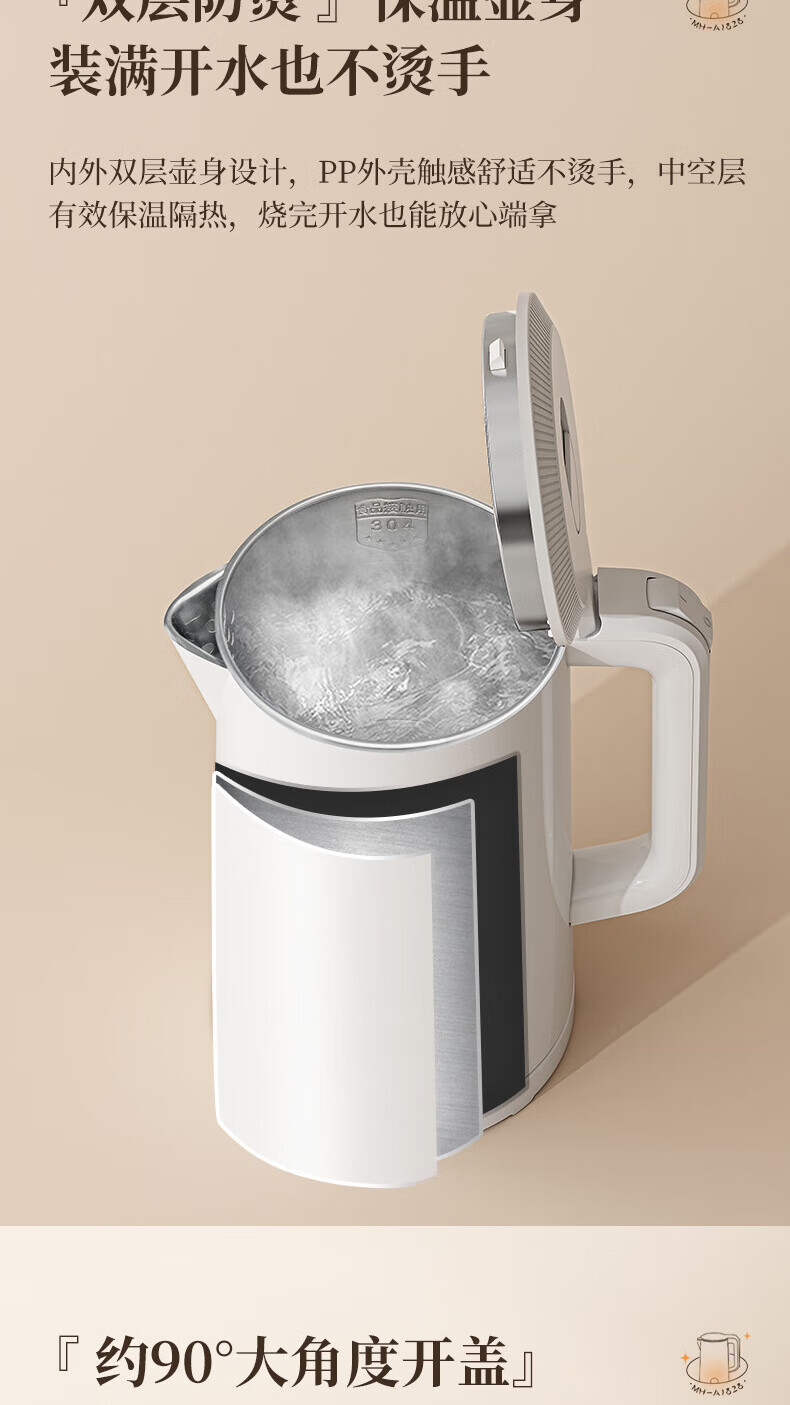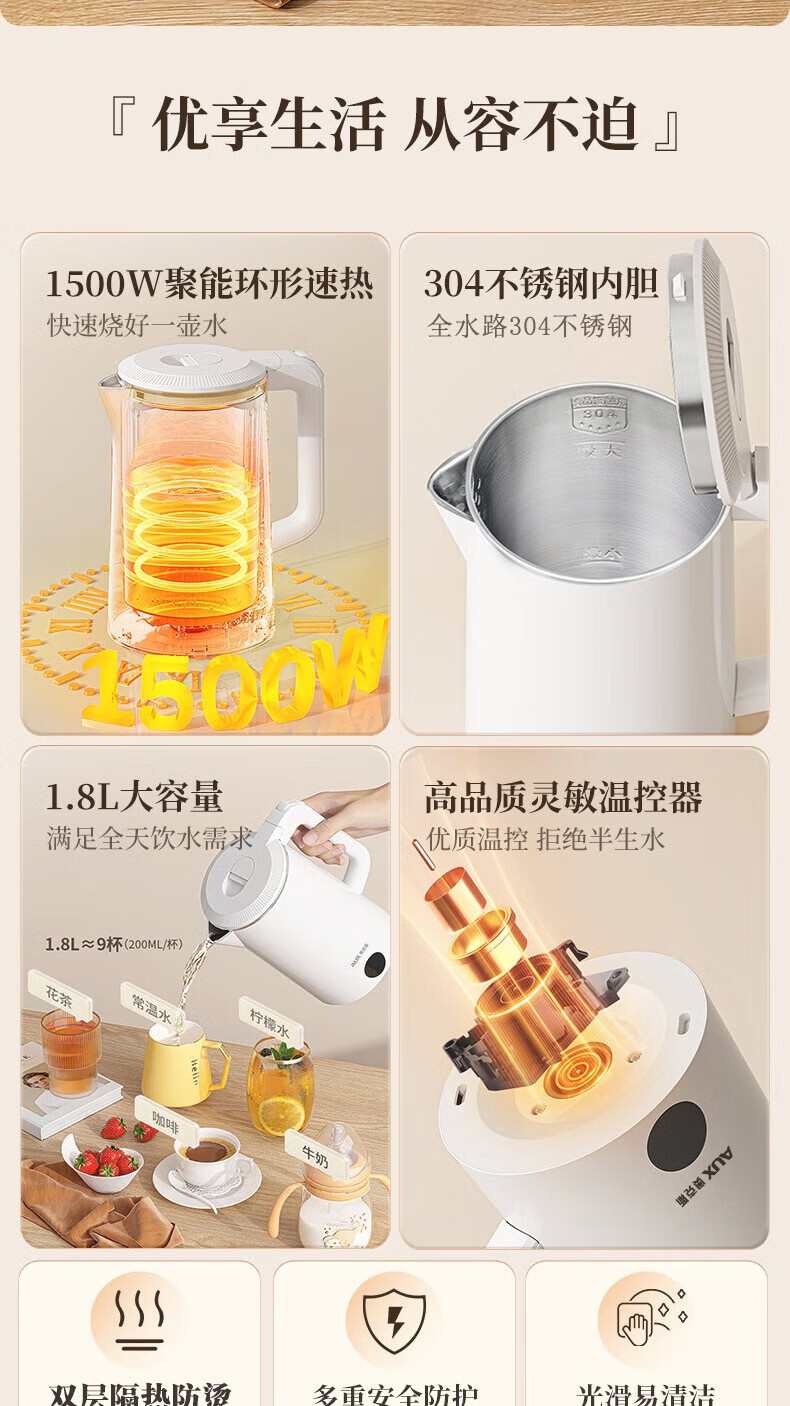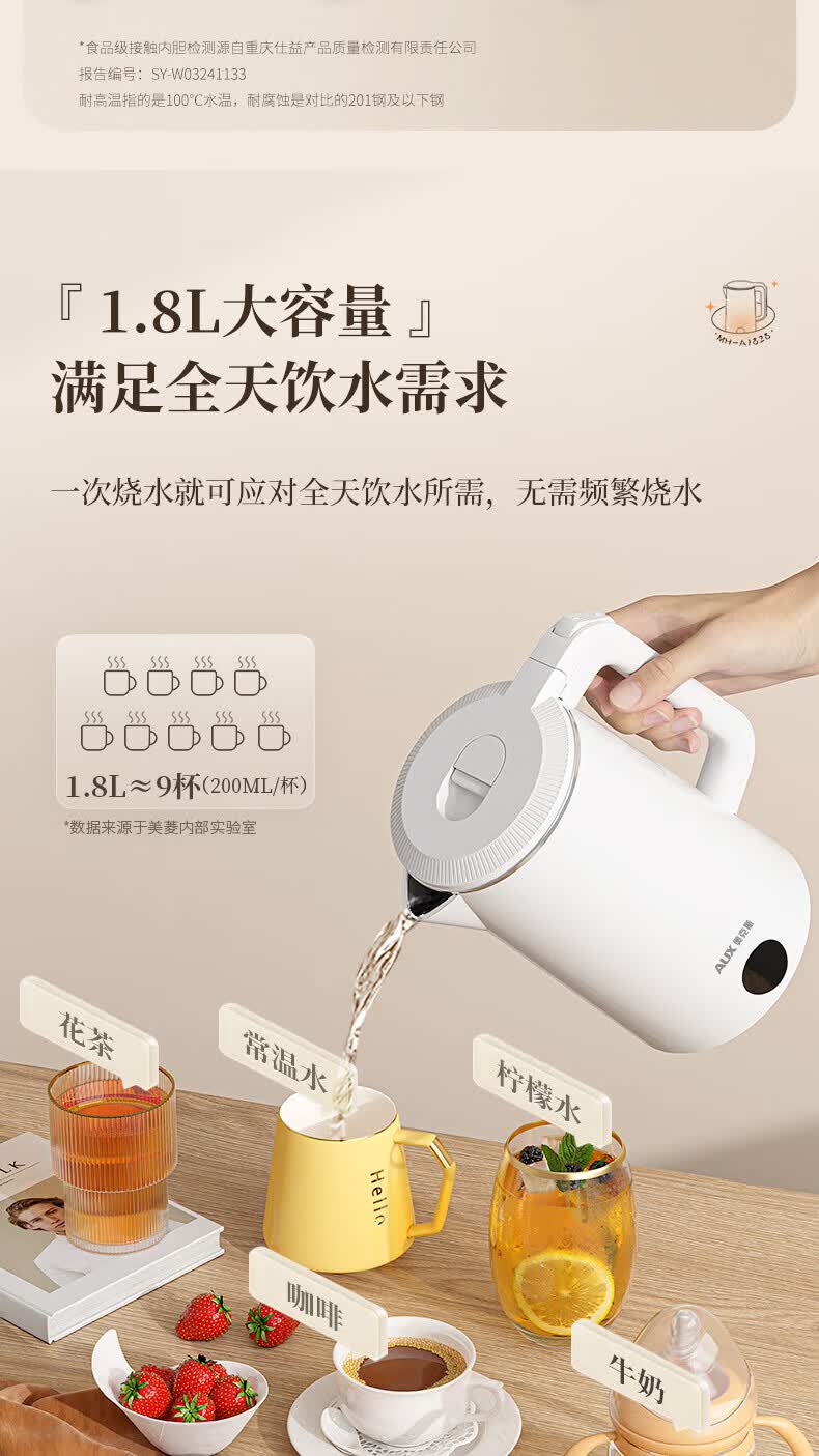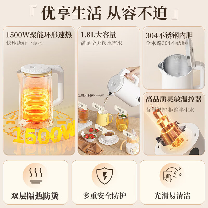 全水路304不锈钢内身,喝水放心;1.8L大容量,满足一天饮水需求;双层防烫,保温壶身