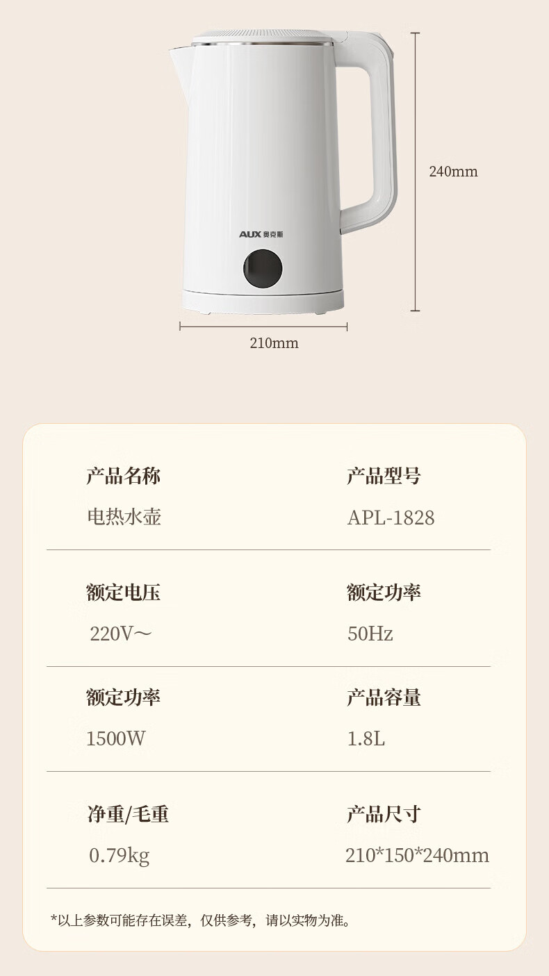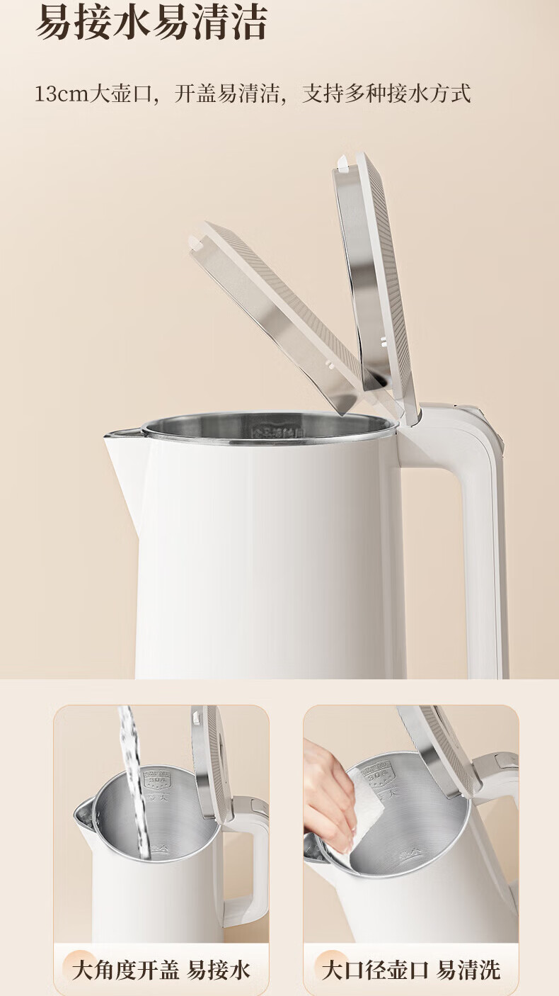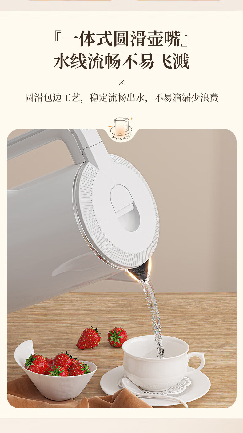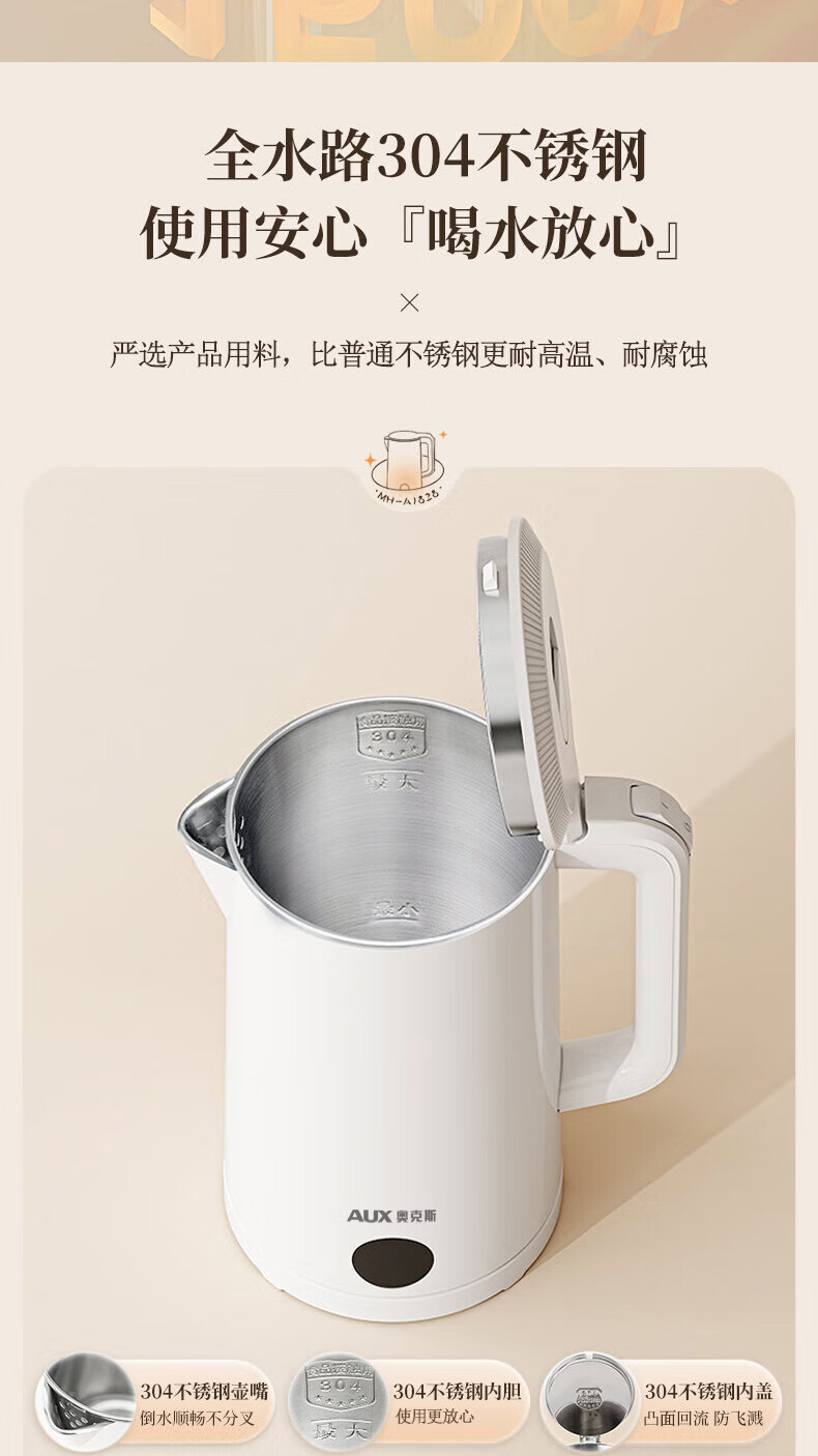 全水路304不锈钢内身,喝水放心;1.8L大容量,满足一天饮水需求;双层防烫,保温壶身
