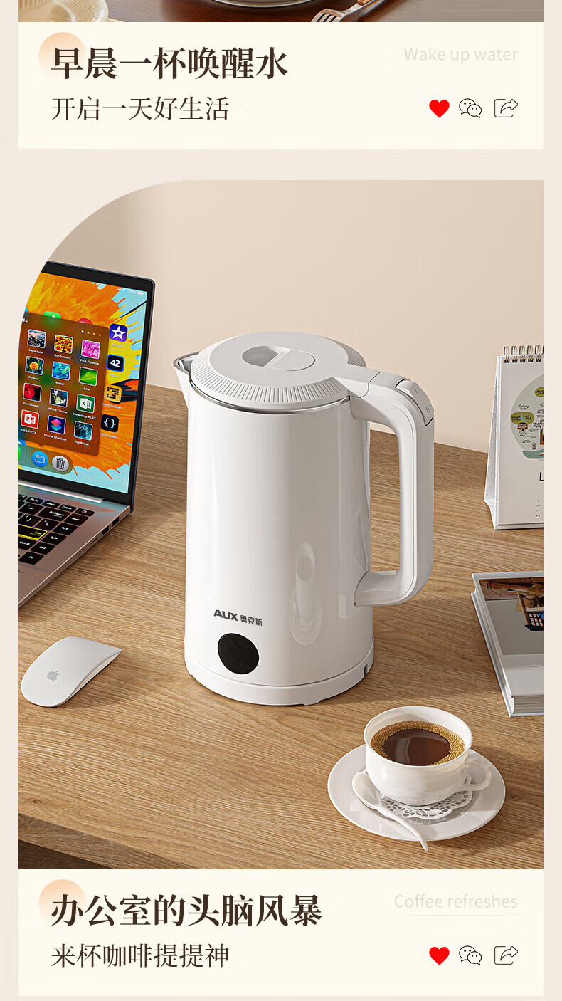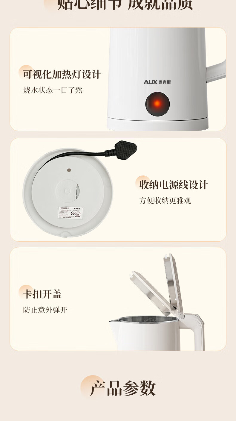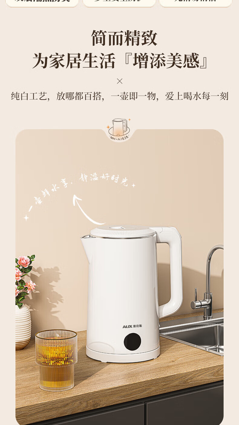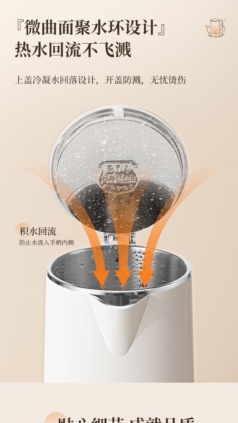 全水路304不锈钢内身,喝水放心;1.8L大容量,满足一天饮水需求;双层防烫,保温壶身