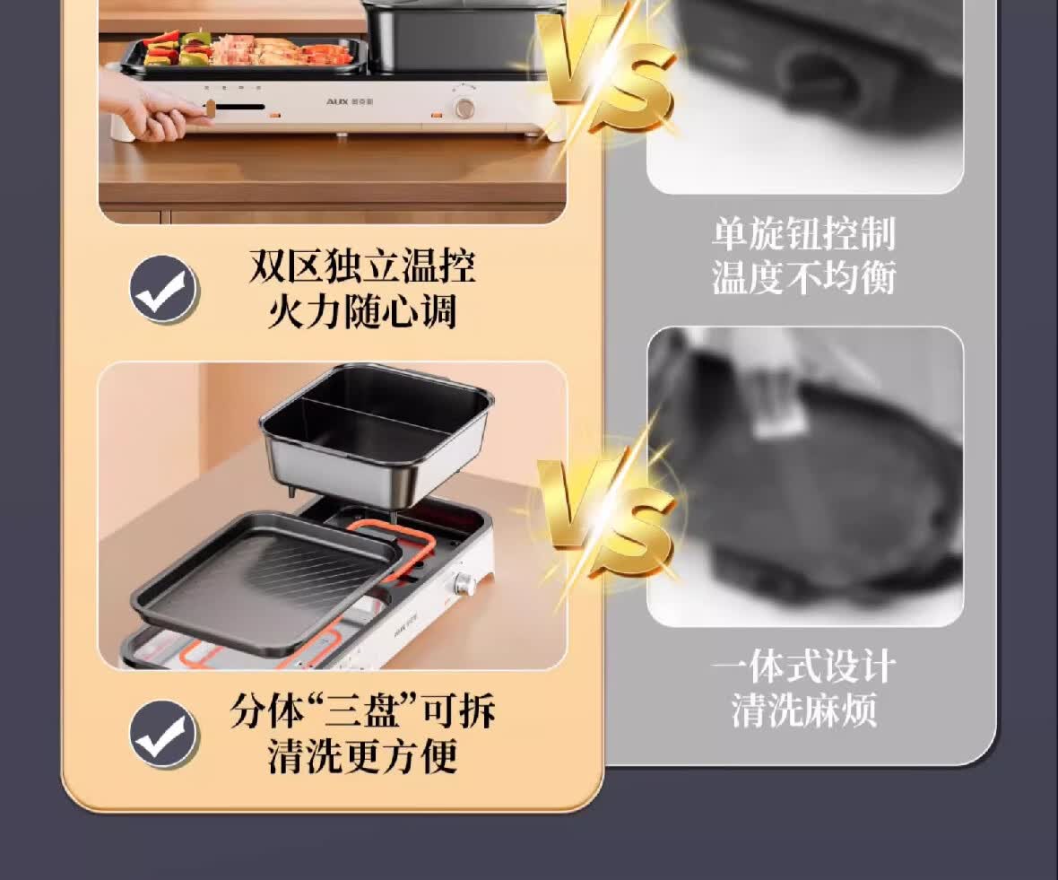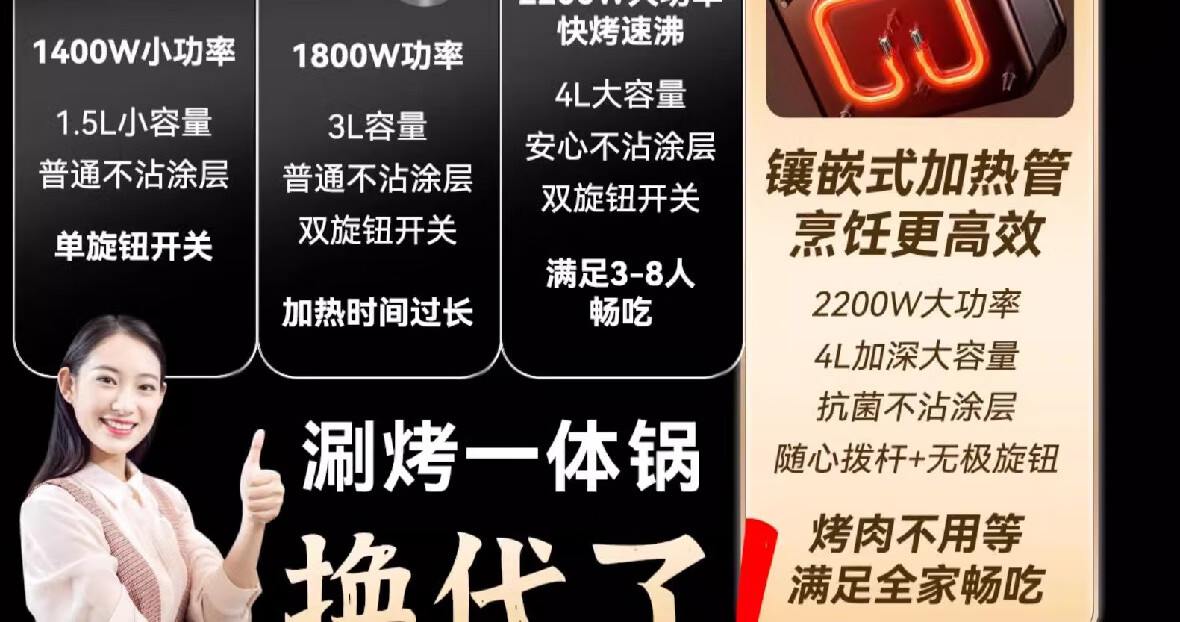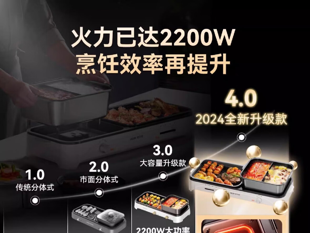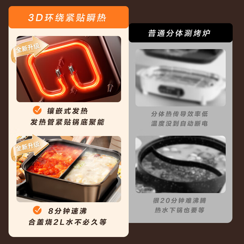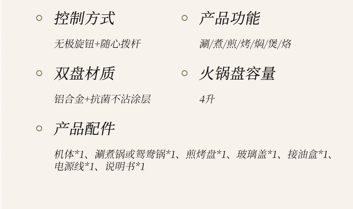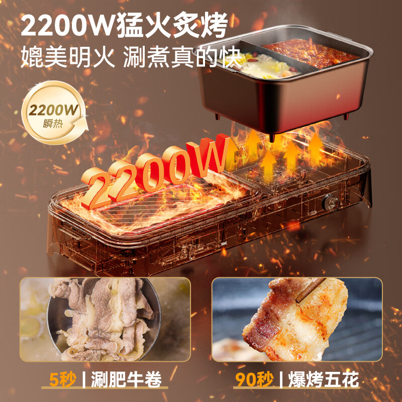 烤涮一体锅,煎/炒/焖/煮/炖/涮;精致容量,可4-8人使用;2200W总功率,拨杆+旋钮 双区控温;升级加厚一体压铸烤盘,不粘耐磨;食品接触级不粘涂层,双盘可拆洗,易清洁不粘锅