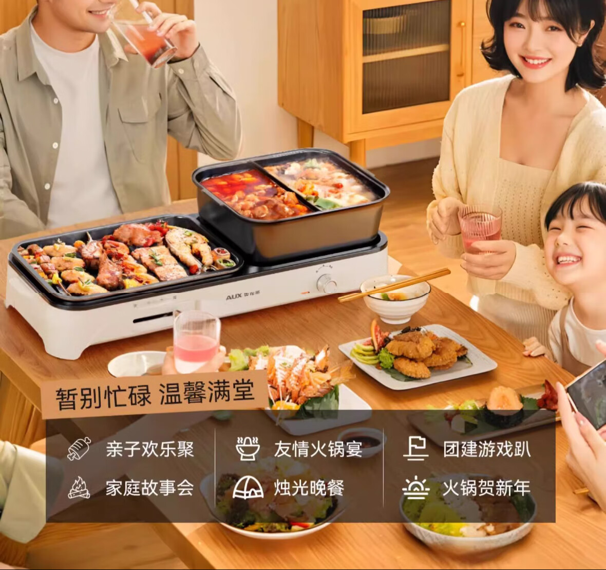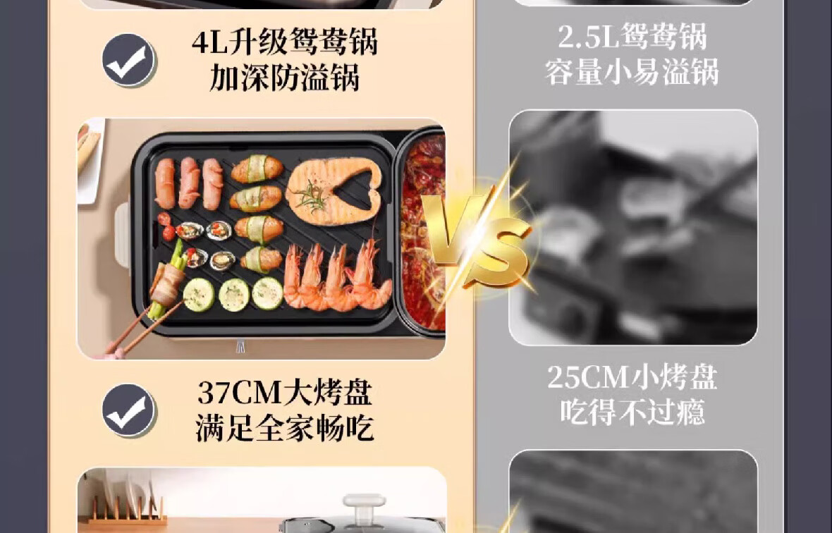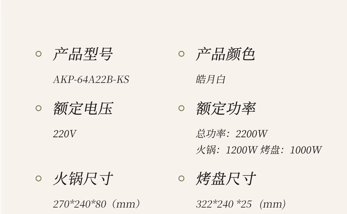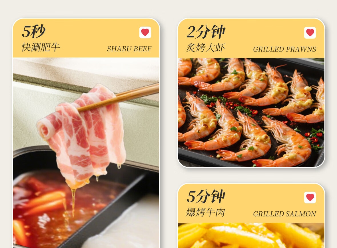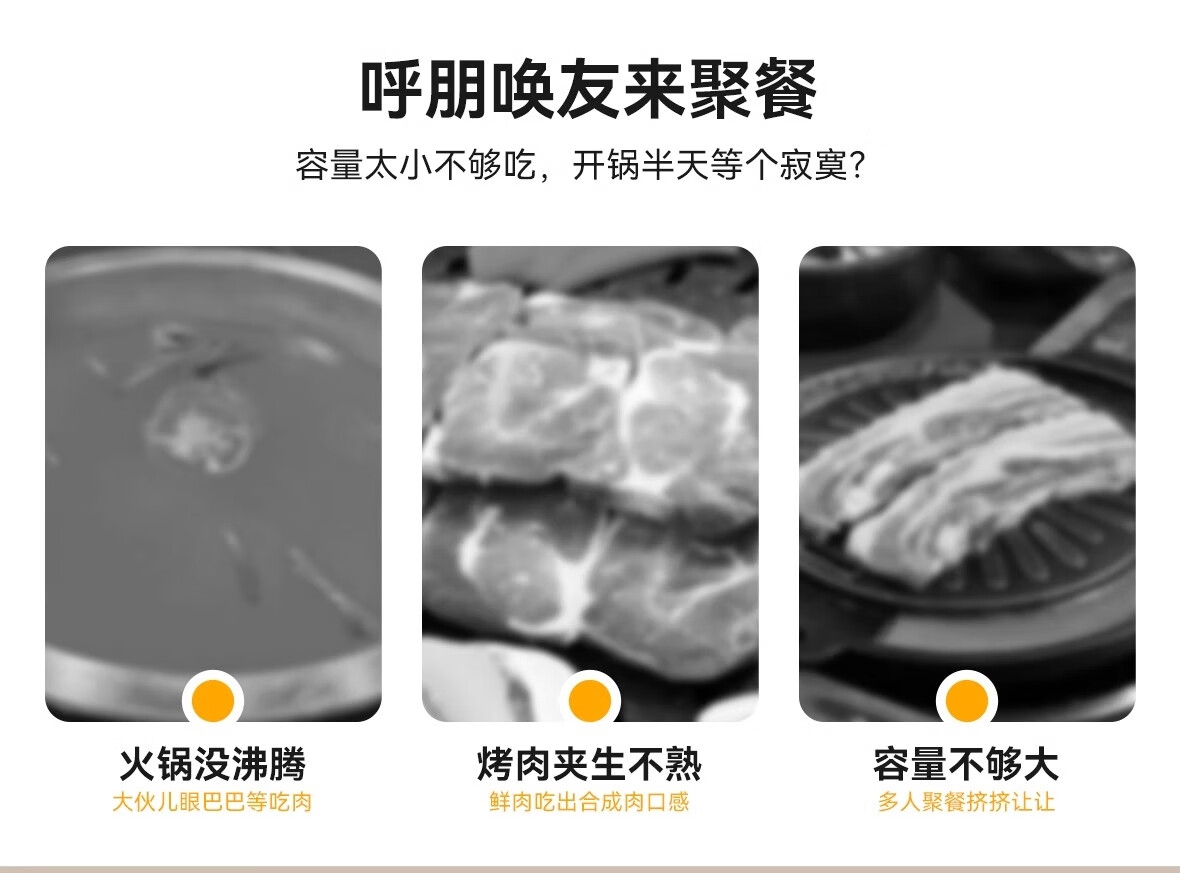 烤涮一体锅,煎/炒/焖/煮/炖/涮;精致容量,可4-8人使用;2200W总功率,拨杆+旋钮 双区控温;升级加厚一体压铸烤盘,不粘耐磨;食品接触级不粘涂层,双盘可拆洗,易清洁不粘锅