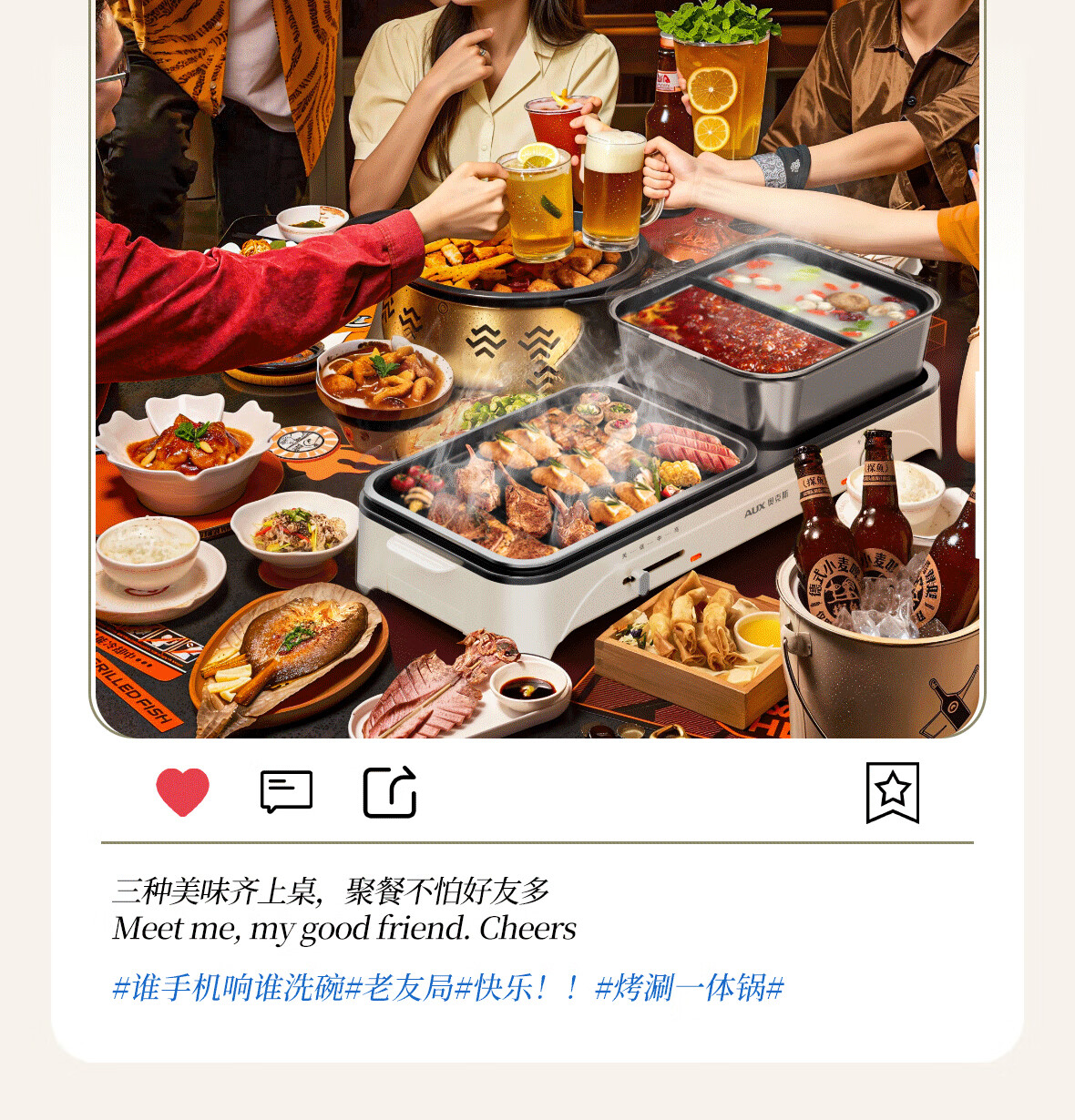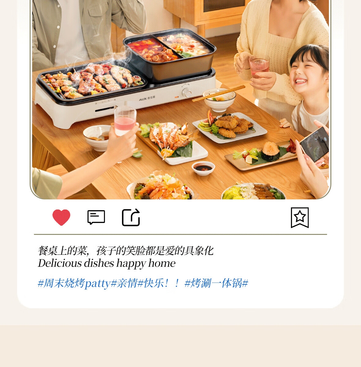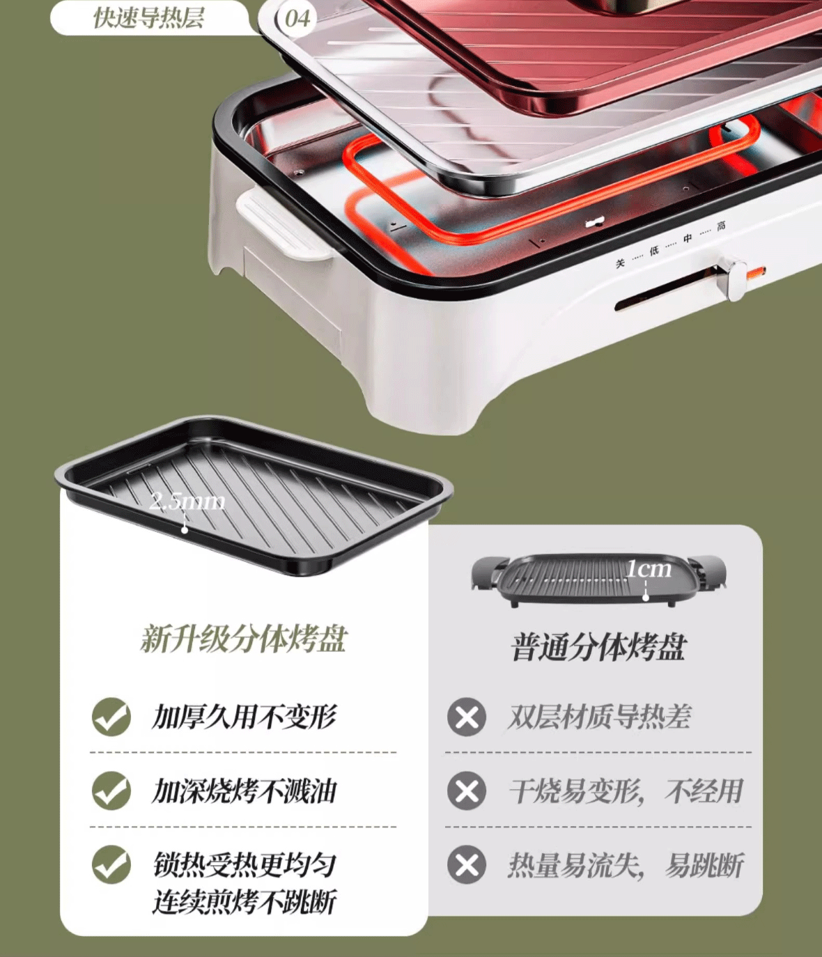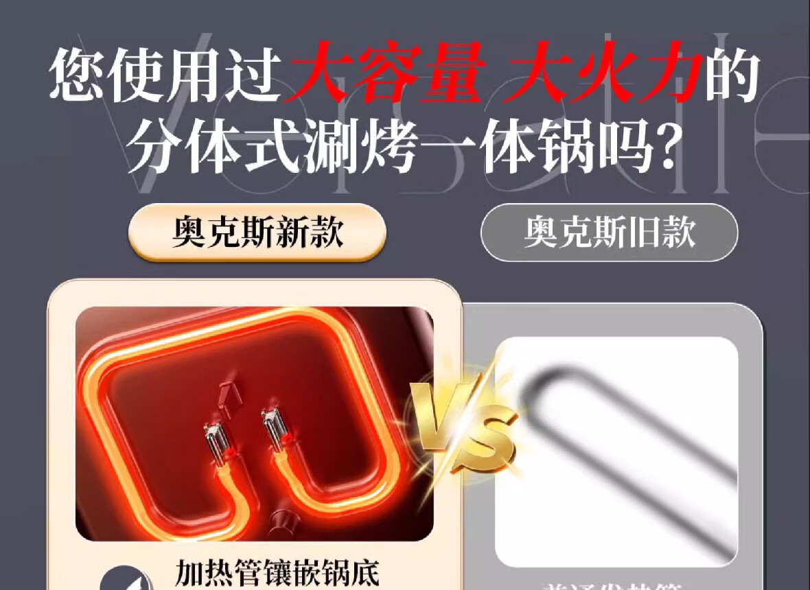 烤涮一体锅,煎/炒/焖/煮/炖/涮;精致容量,可4-8人使用;2200W总功率,拨杆+旋钮 双区控温;升级加厚一体压铸烤盘,不粘耐磨;食品接触级不粘涂层,双盘可拆洗,易清洁不粘锅