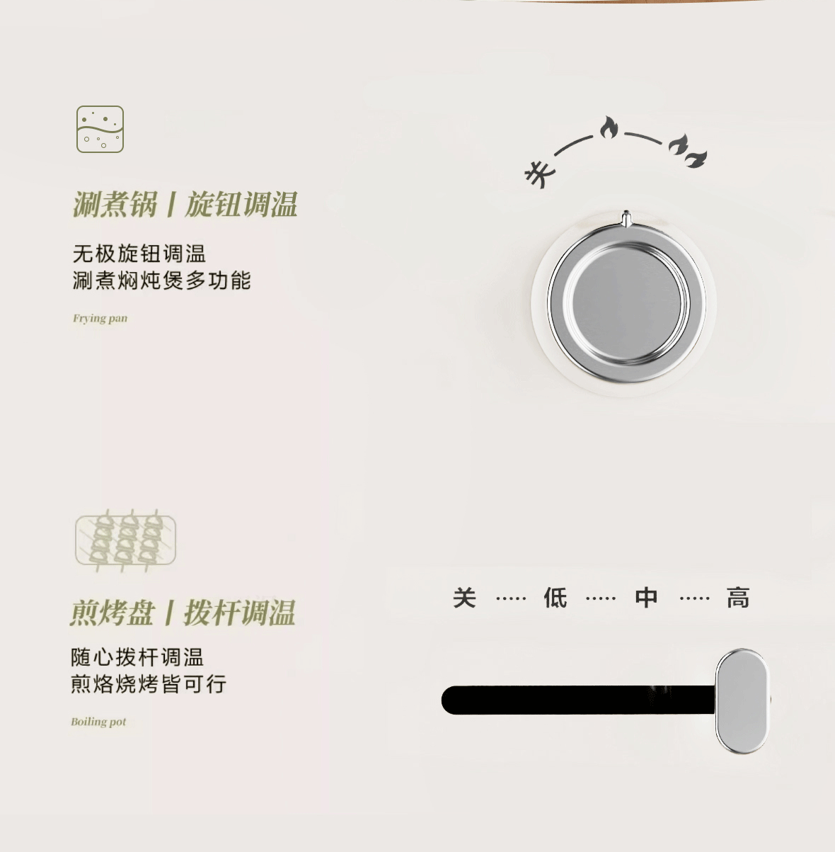 电热火锅功能:炒,炸,煎,煮,炖,焖,火锅,铁板烧,烤