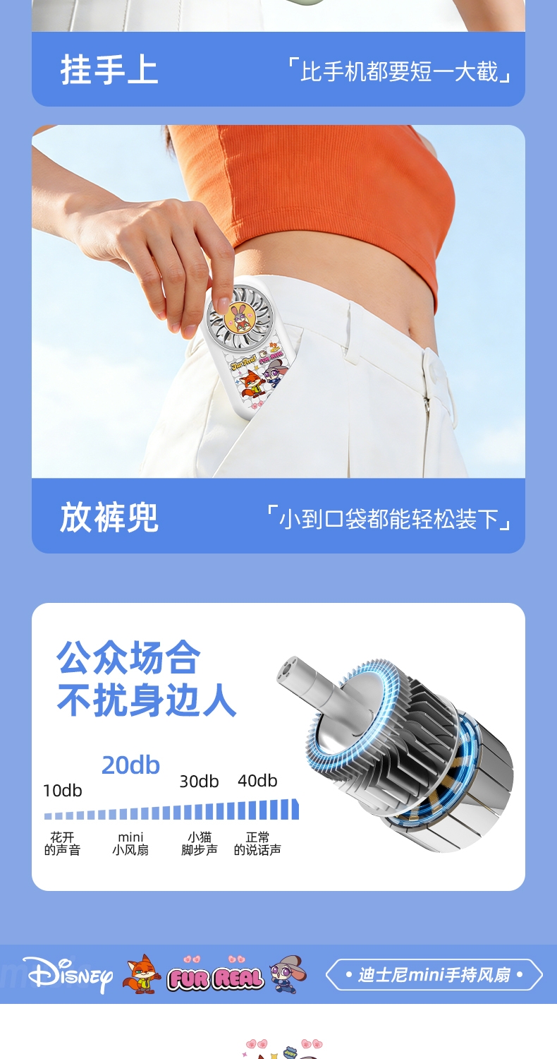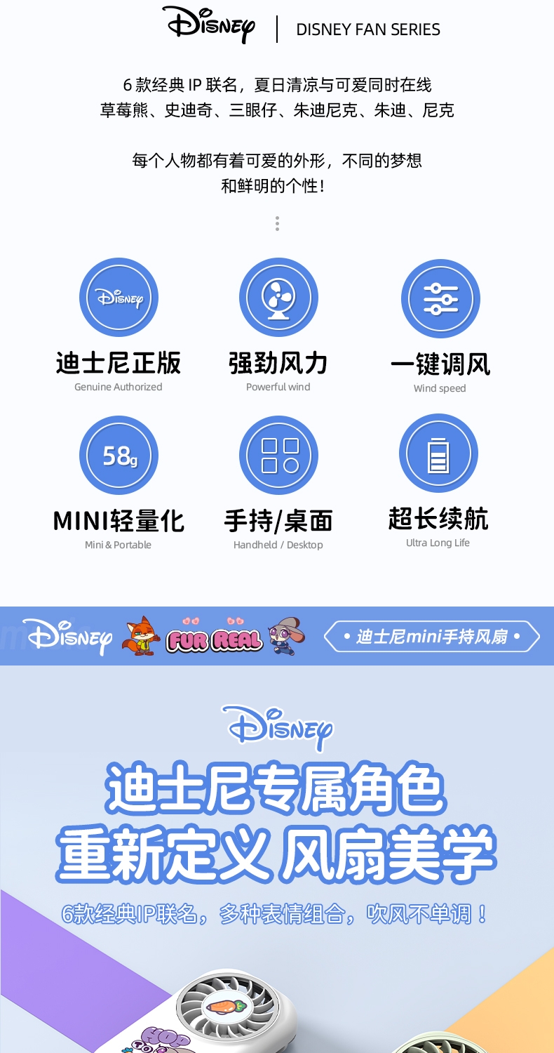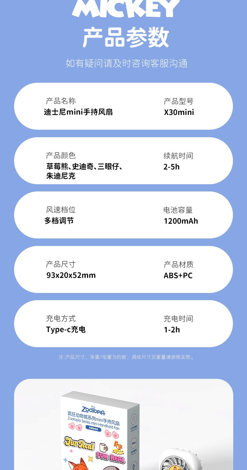 迪士尼正版授权:官方 IP 联名;强劲大风力,小体积大能量;仅重 58g,mini 尺寸,口袋包包轻松收纳