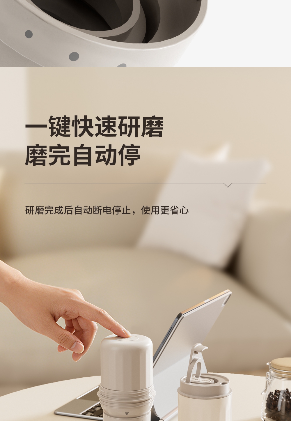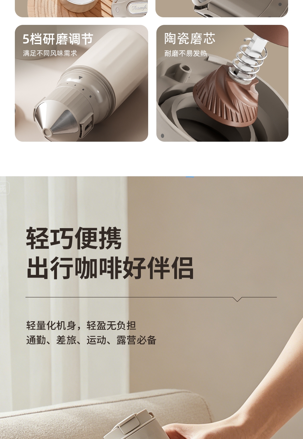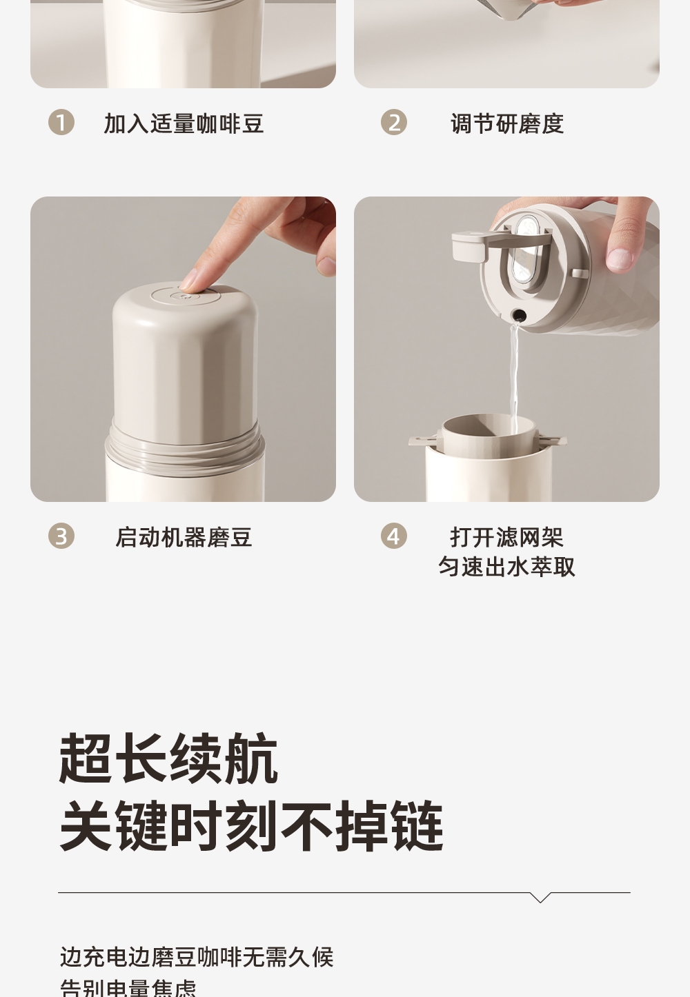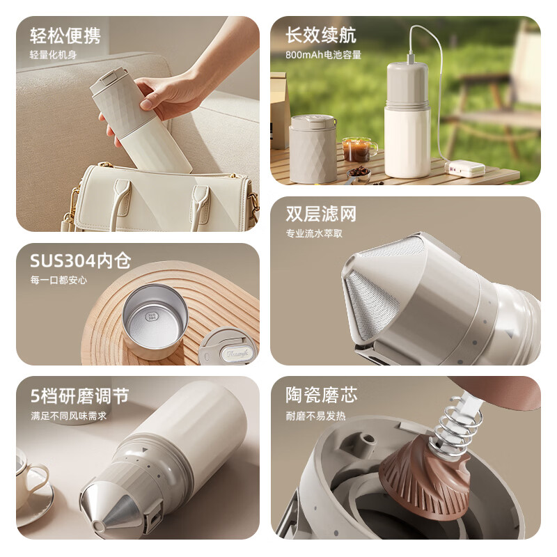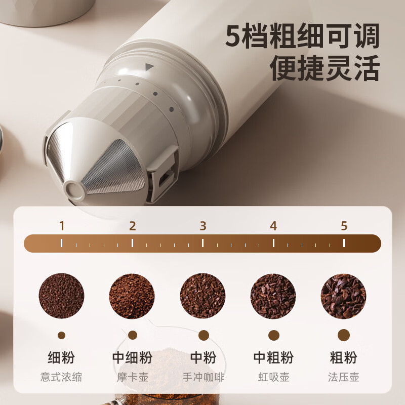 无线便携,出差旅行使用场景不受限;5档粗细可调,专业把控口感;一键磨豆,完成自动断电;1600毫安大容量电池持久续航,续杯无压力
