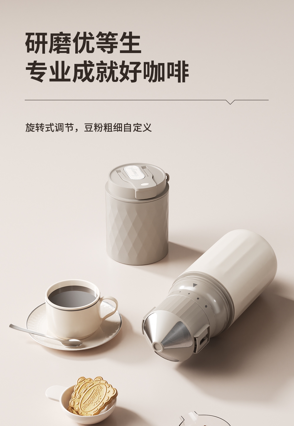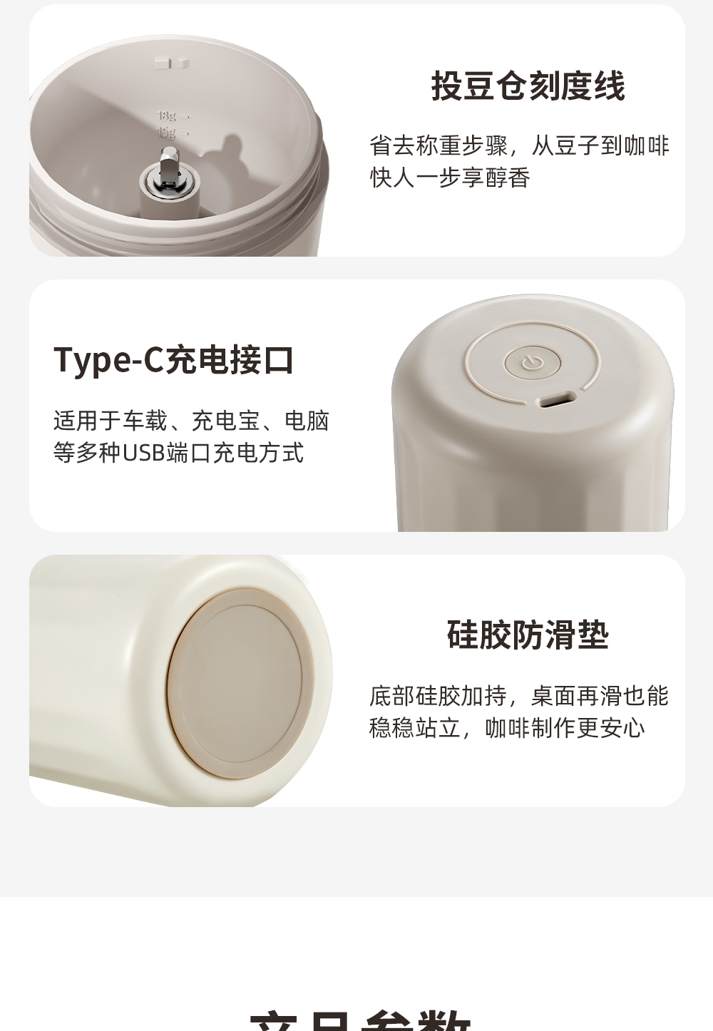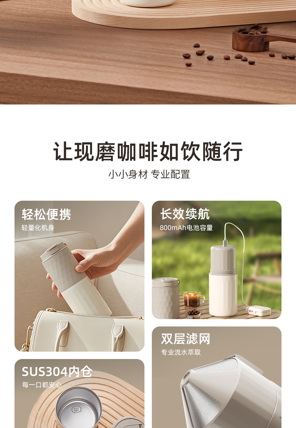 无线便携,出差旅行使用场景不受限;5档粗细可调,专业把控口感;一键磨豆,完成自动断电;1600毫安大容量电池持久续航,续杯无压力