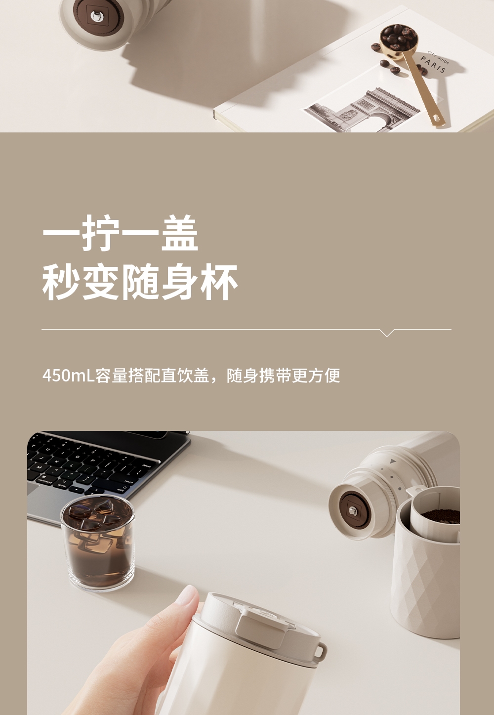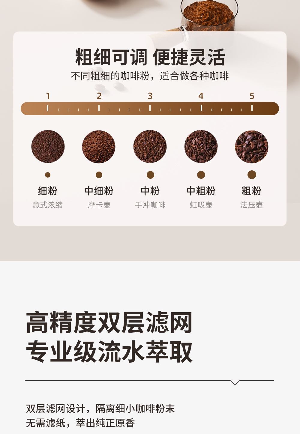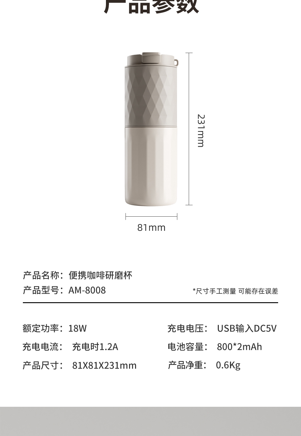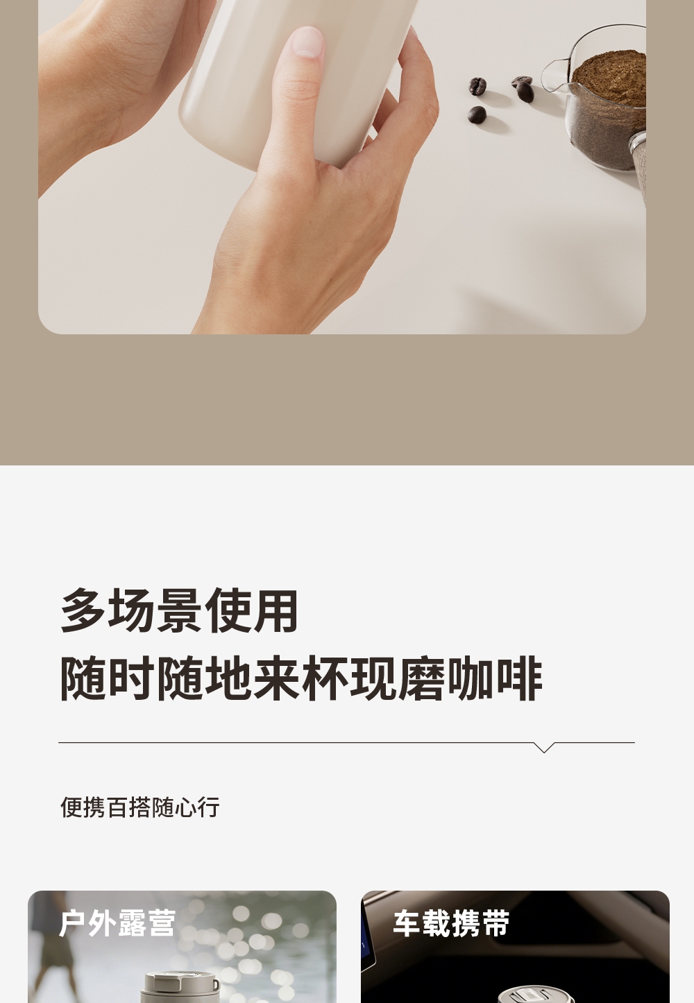 无线便携,出差旅行使用场景不受限;5档粗细可调,专业把控口感;一键磨豆,完成自动断电;1600毫安大容量电池持久续航,续杯无压力
