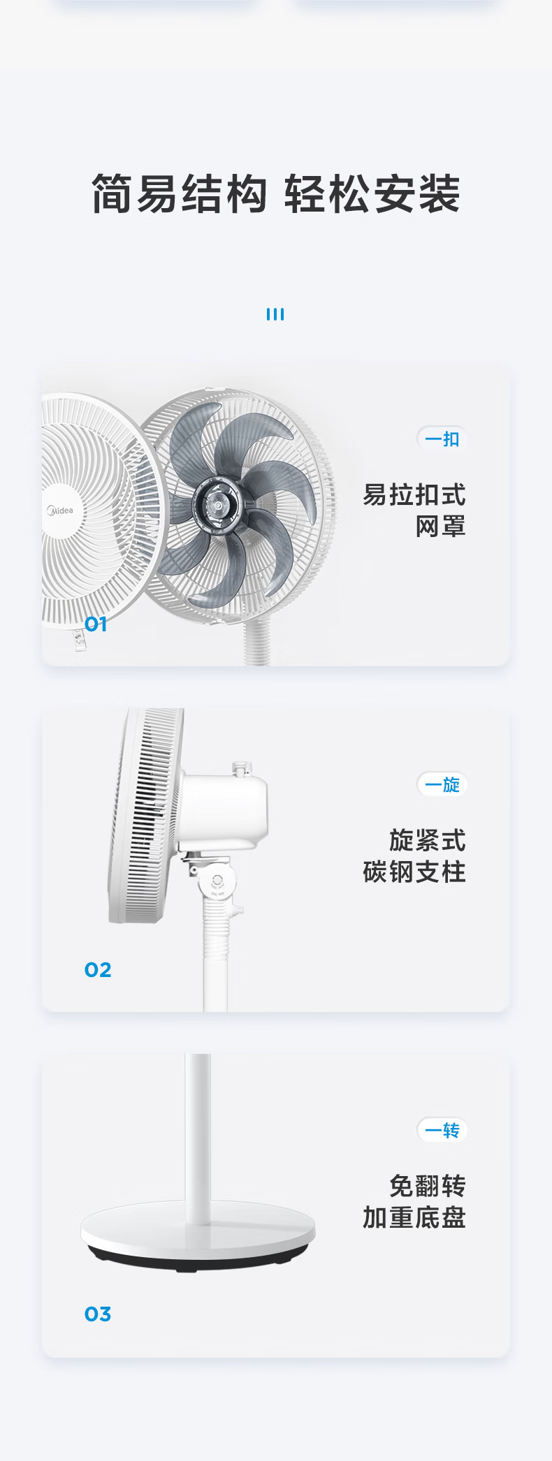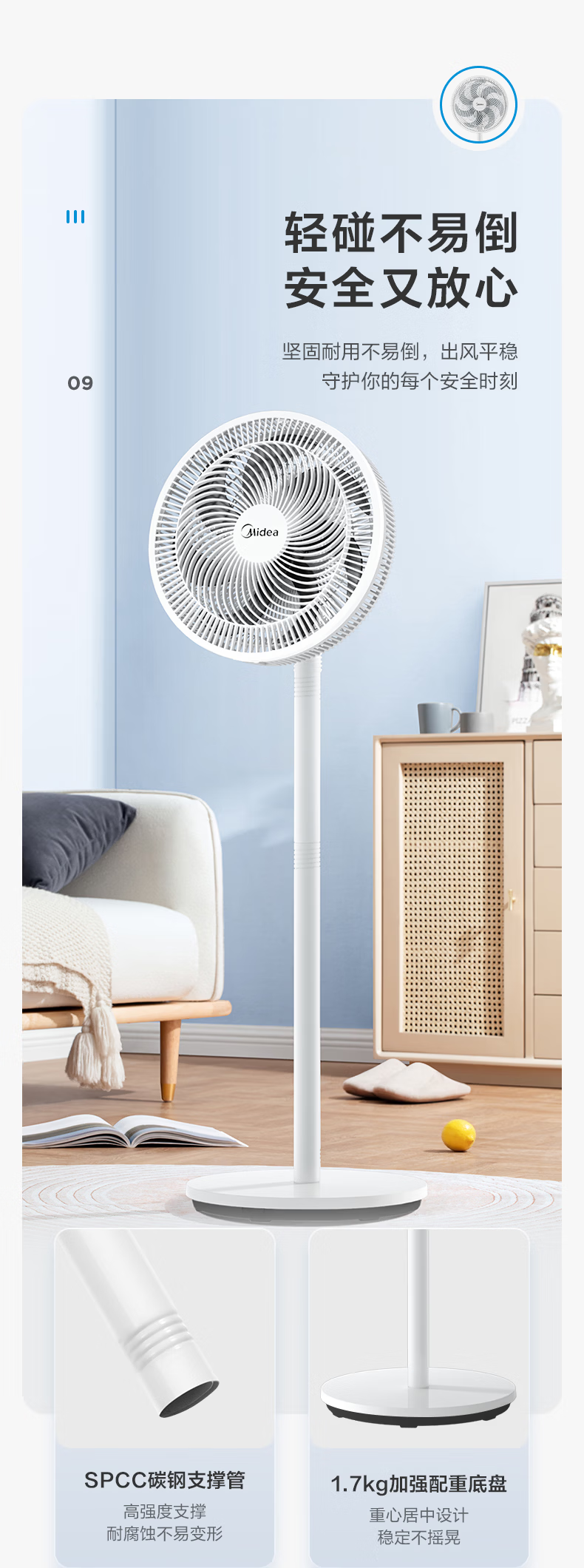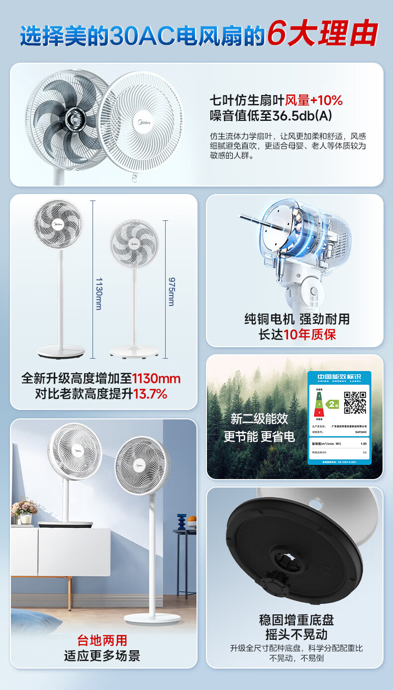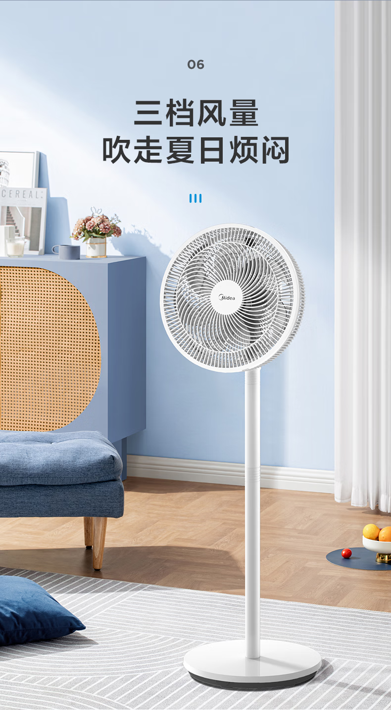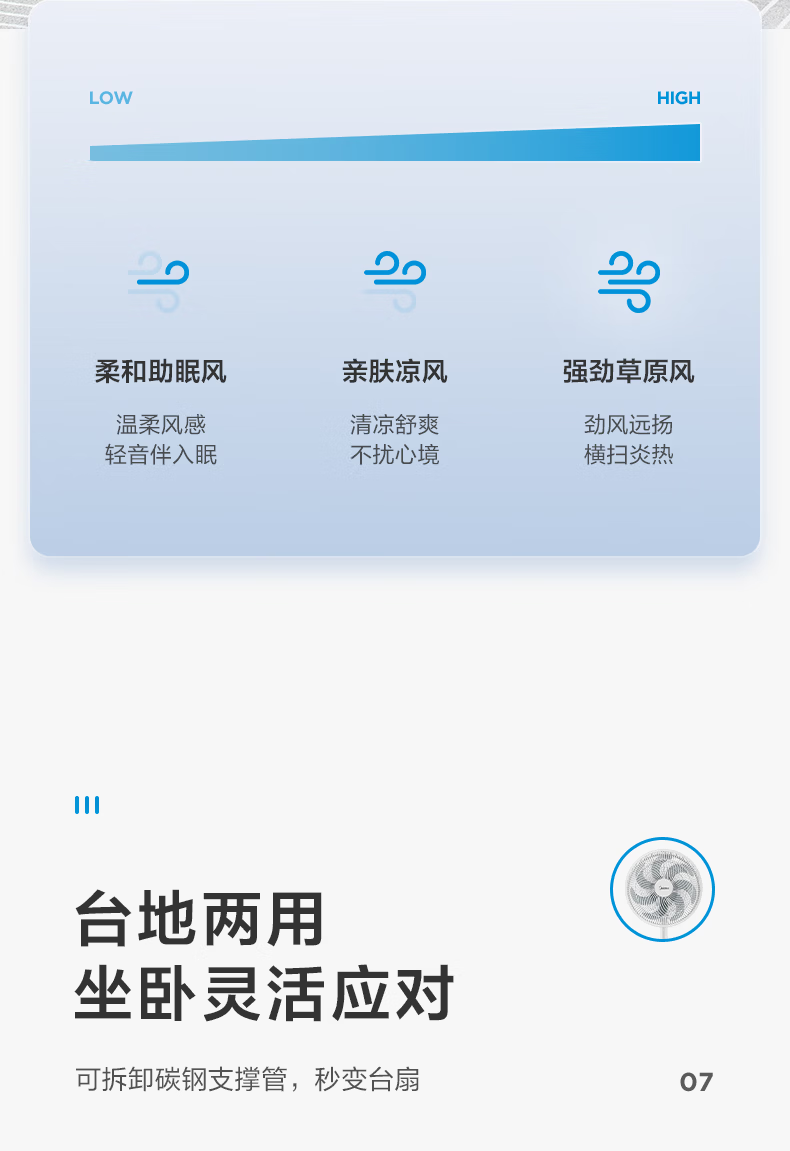 七片风叶,三档风速;;电机10年质保,品质可靠;立柱可自由拼接,台地两用