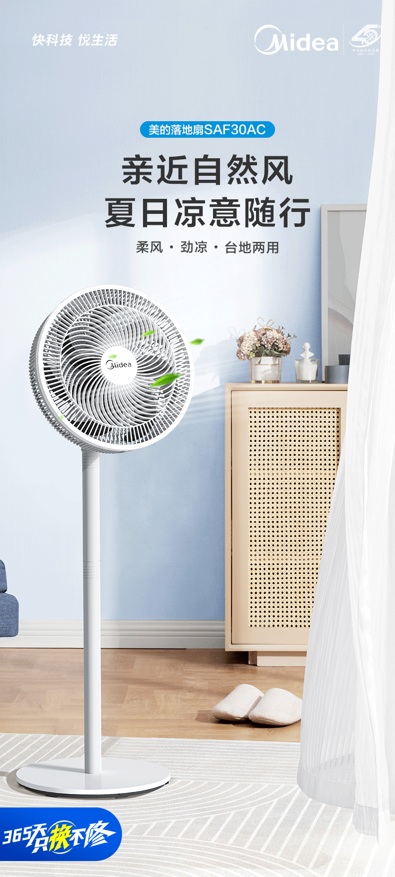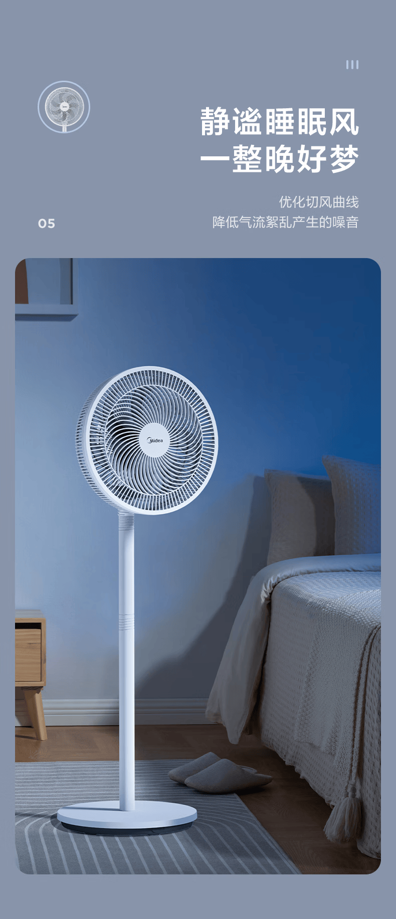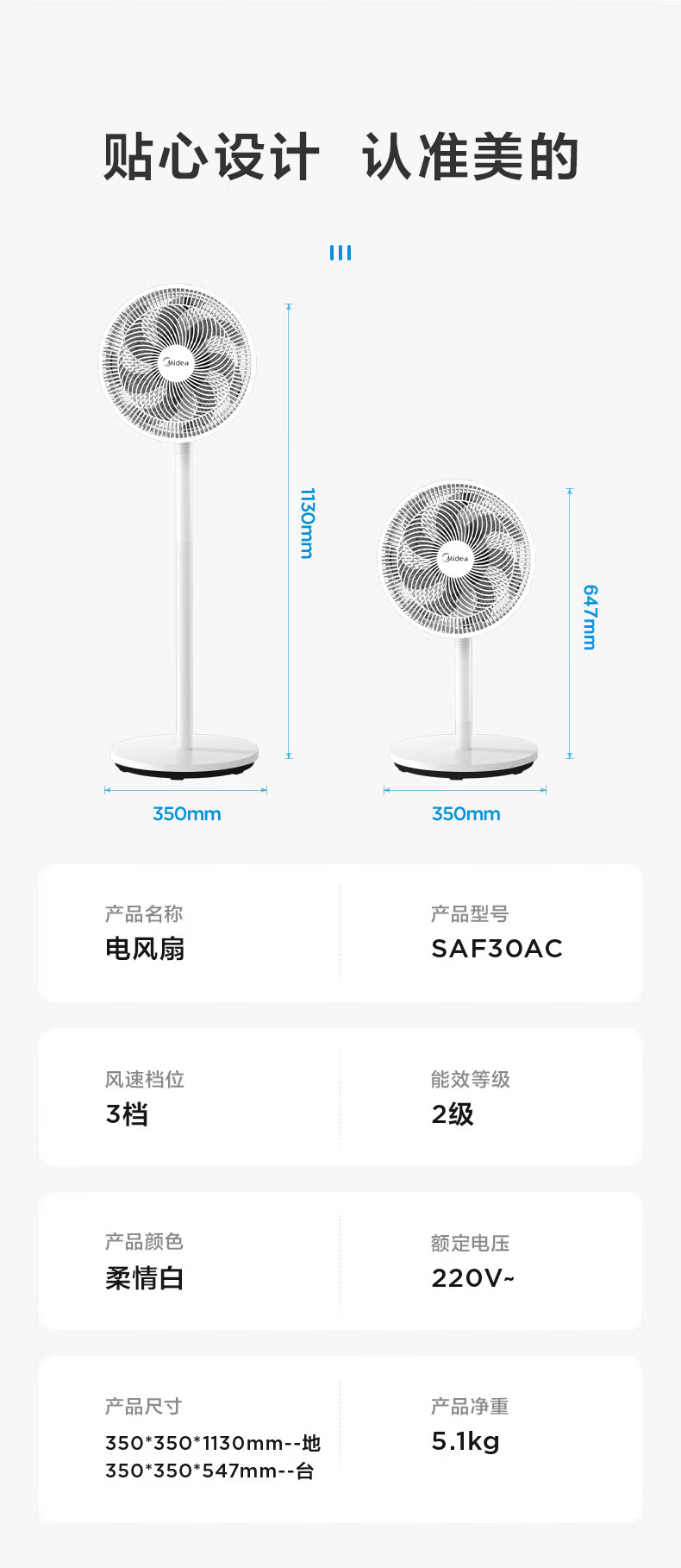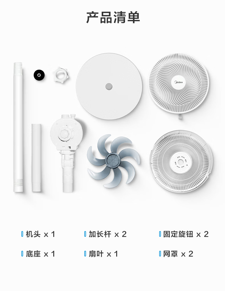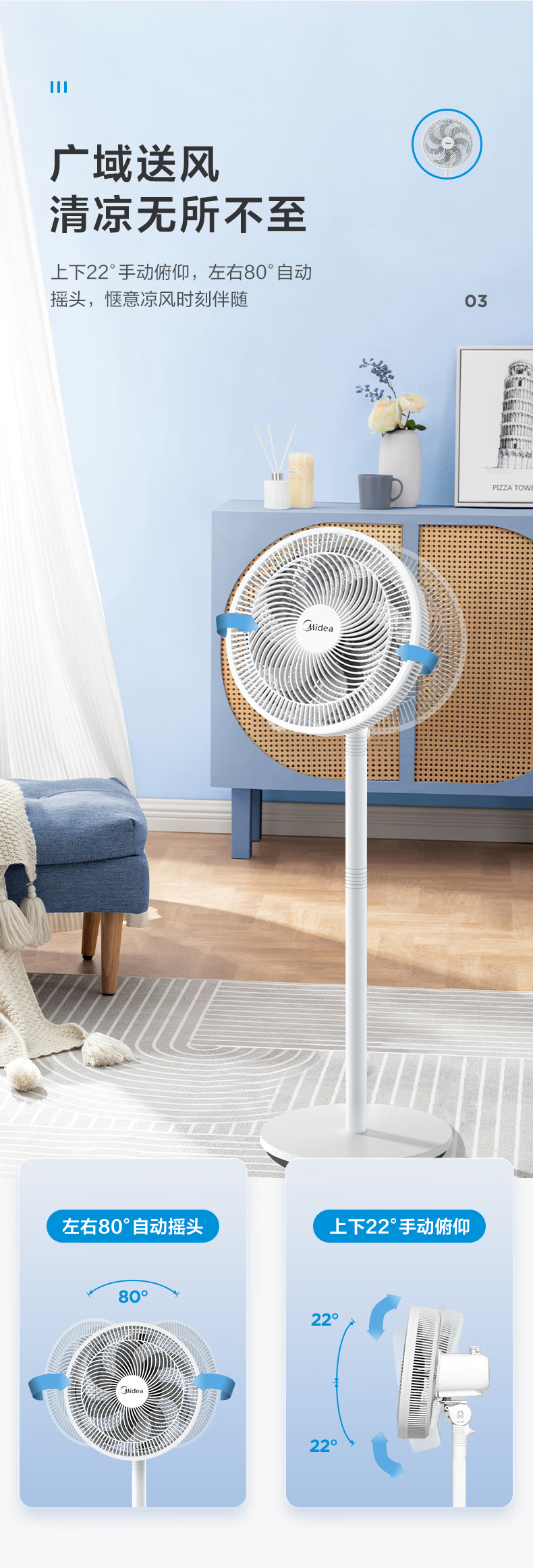 七片风叶,三档风速;;电机10年质保,品质可靠;立柱可自由拼接,台地两用