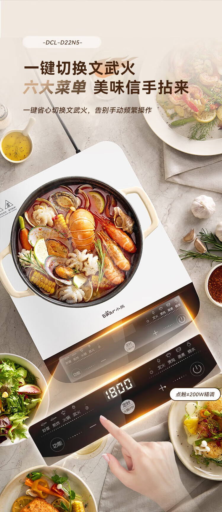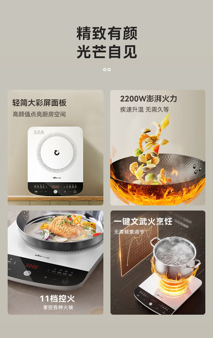 2200W大火力,猛火爆炒;6大烹饪功能,轻松选择,支持24h定时;支持11档火力自由调控
