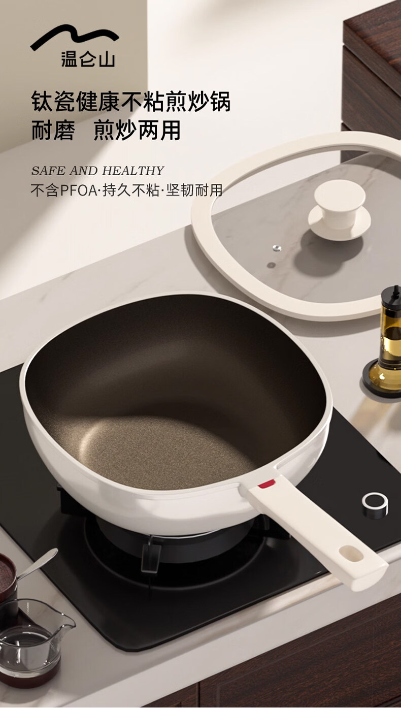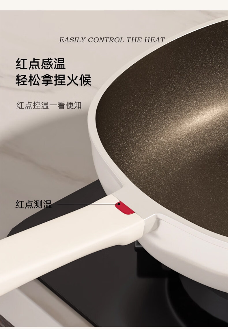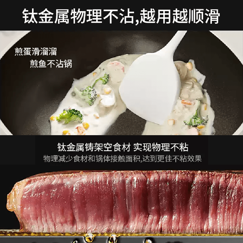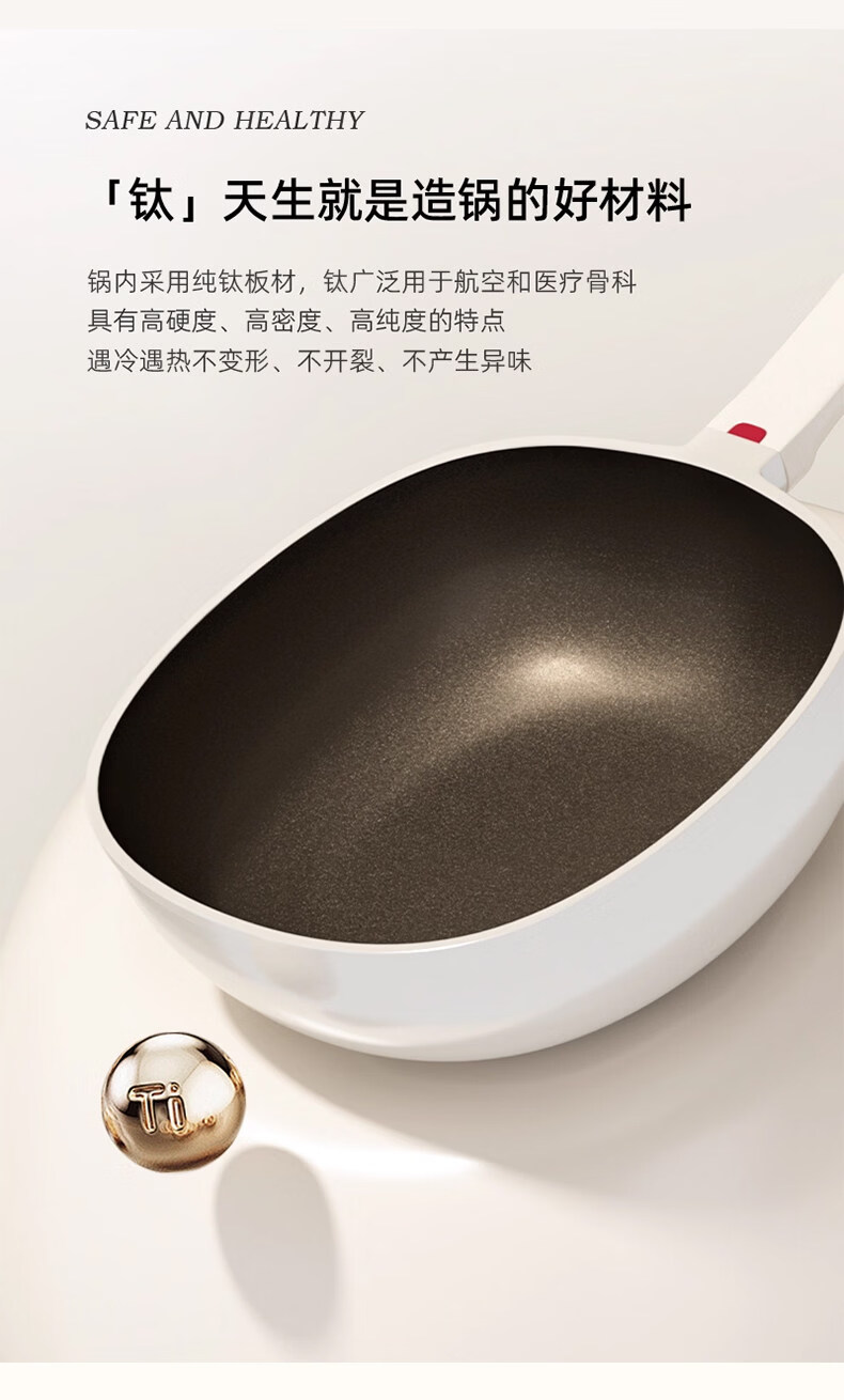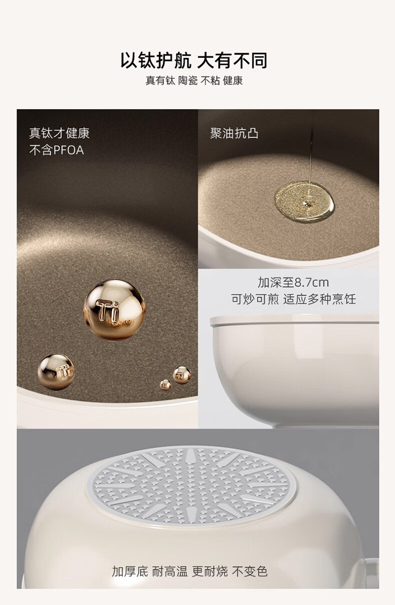 真钛无涂层,材质更安全;红点感温,轻松拿捏火候;煎炒两用,透明锅盖
