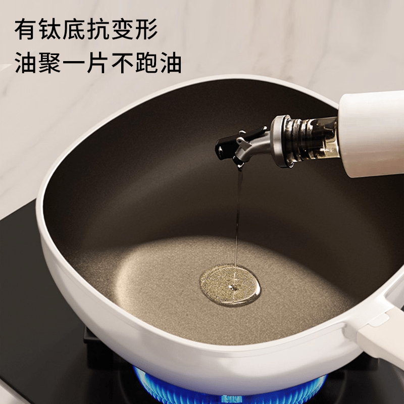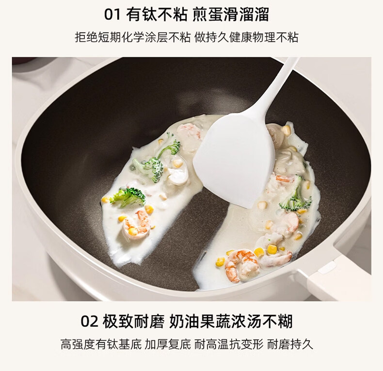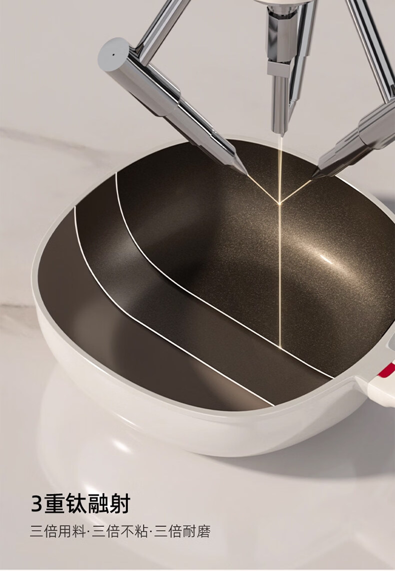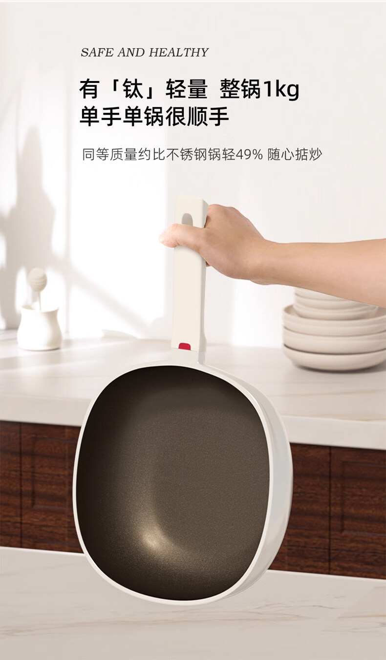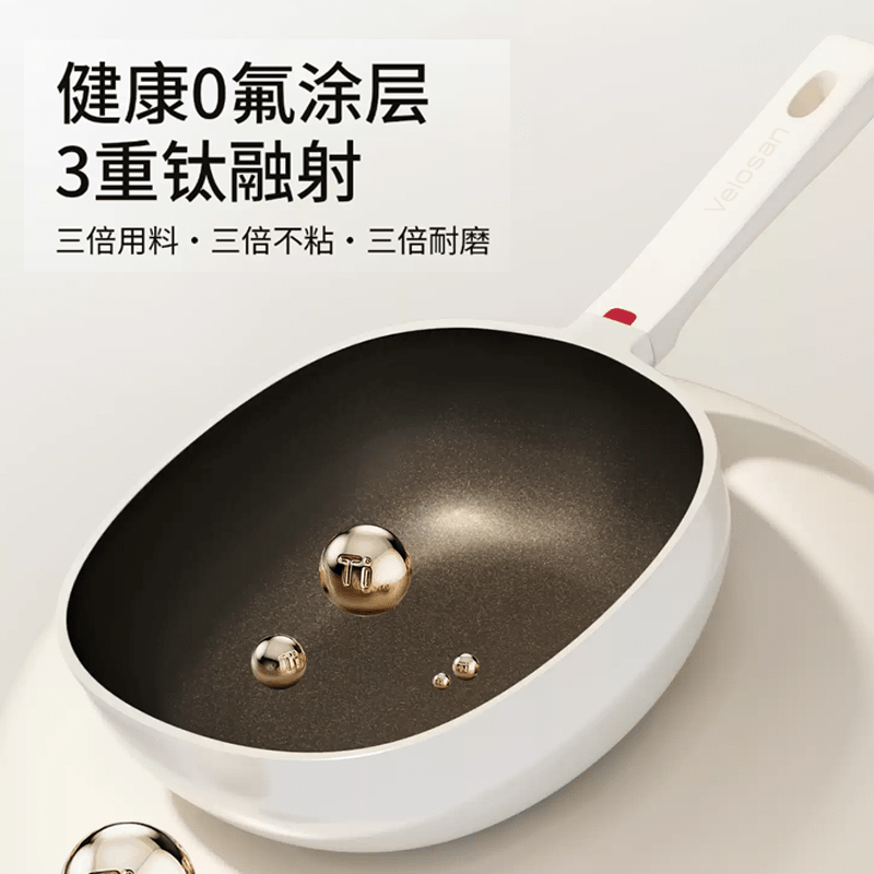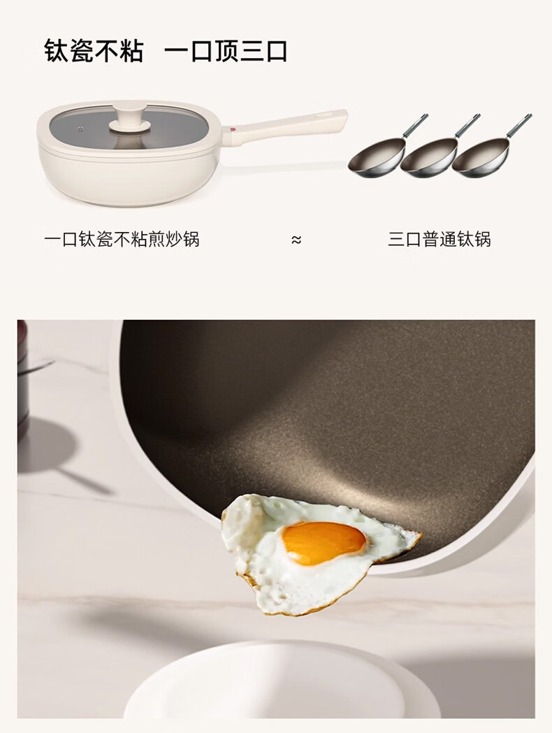 真钛无涂层,材质更安全;红点感温,轻松拿捏火候;煎炒两用,透明锅盖