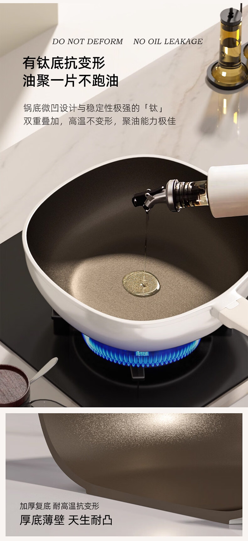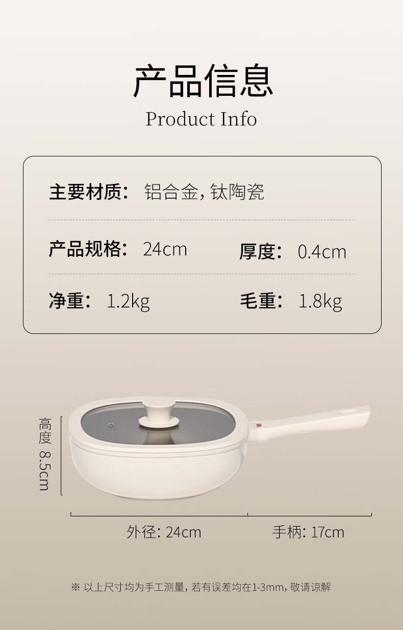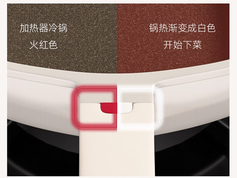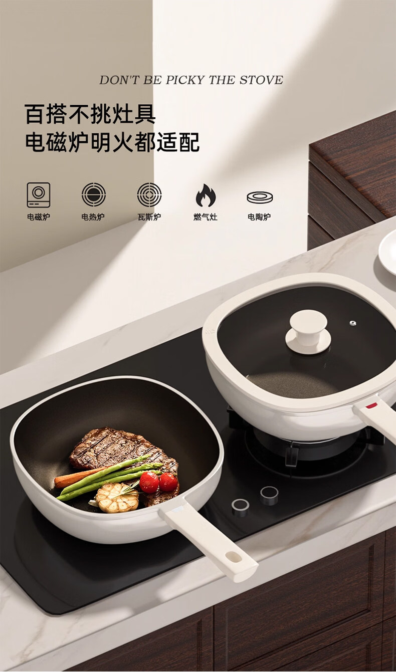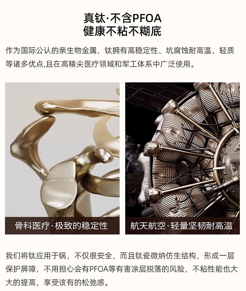 真钛无涂层,材质更安全;红点感温,轻松拿捏火候;煎炒两用,透明锅盖