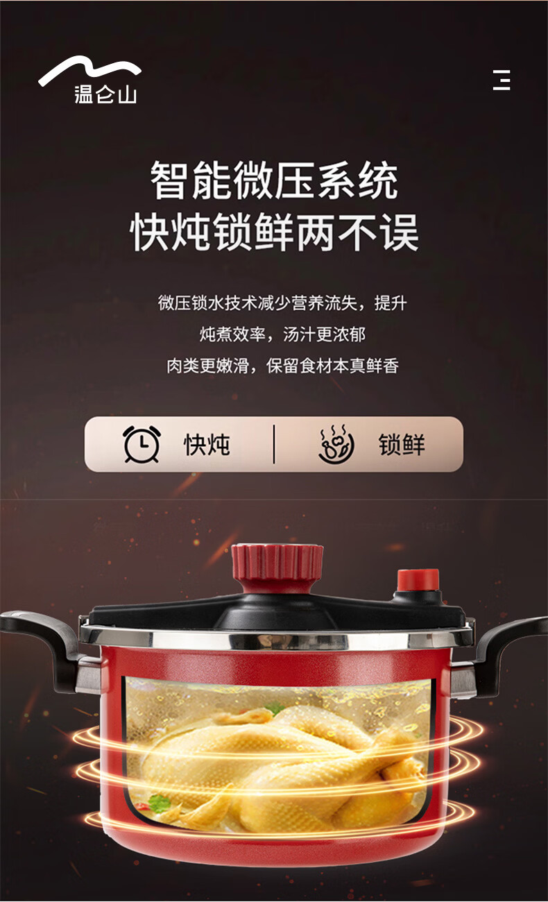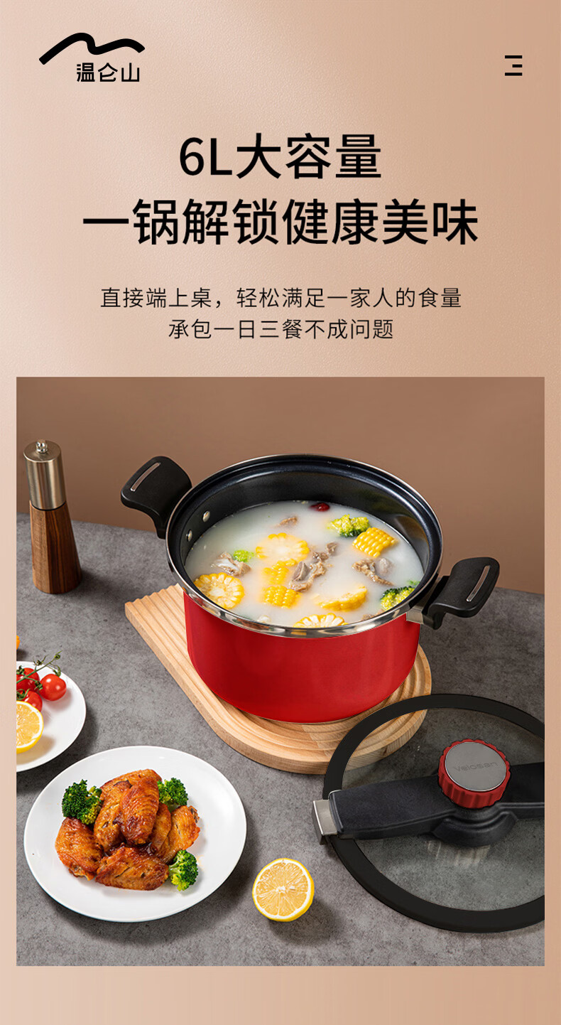 6L大容量,一锅解锁健康美味;智能微压系统,快炖锁鲜两不误;多层复合锅身,导热迅速