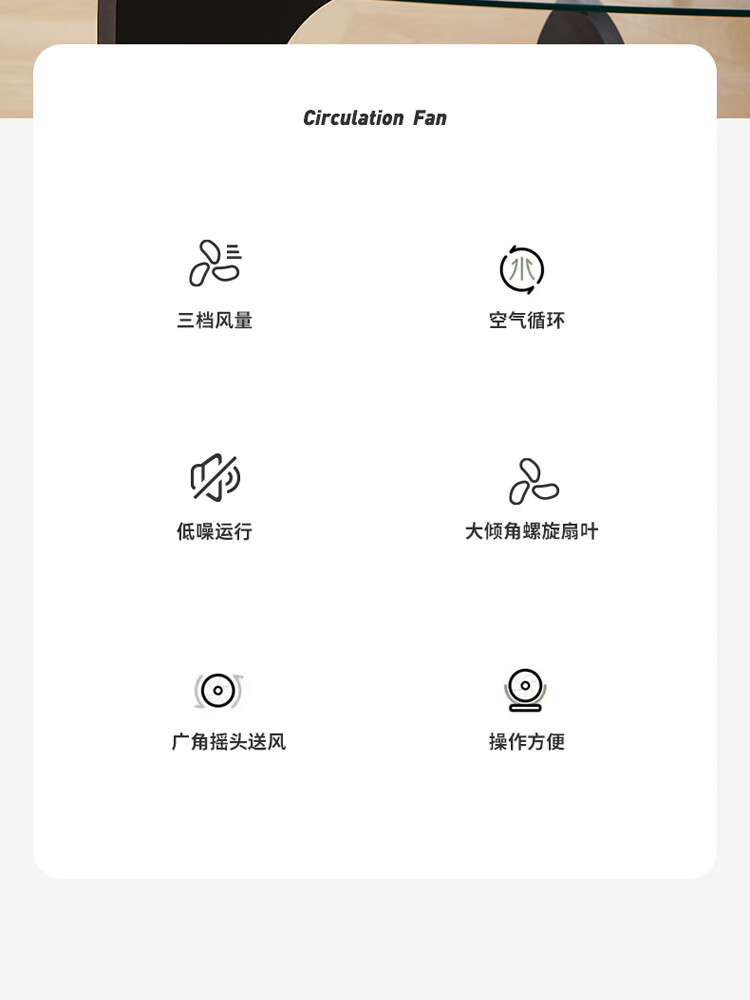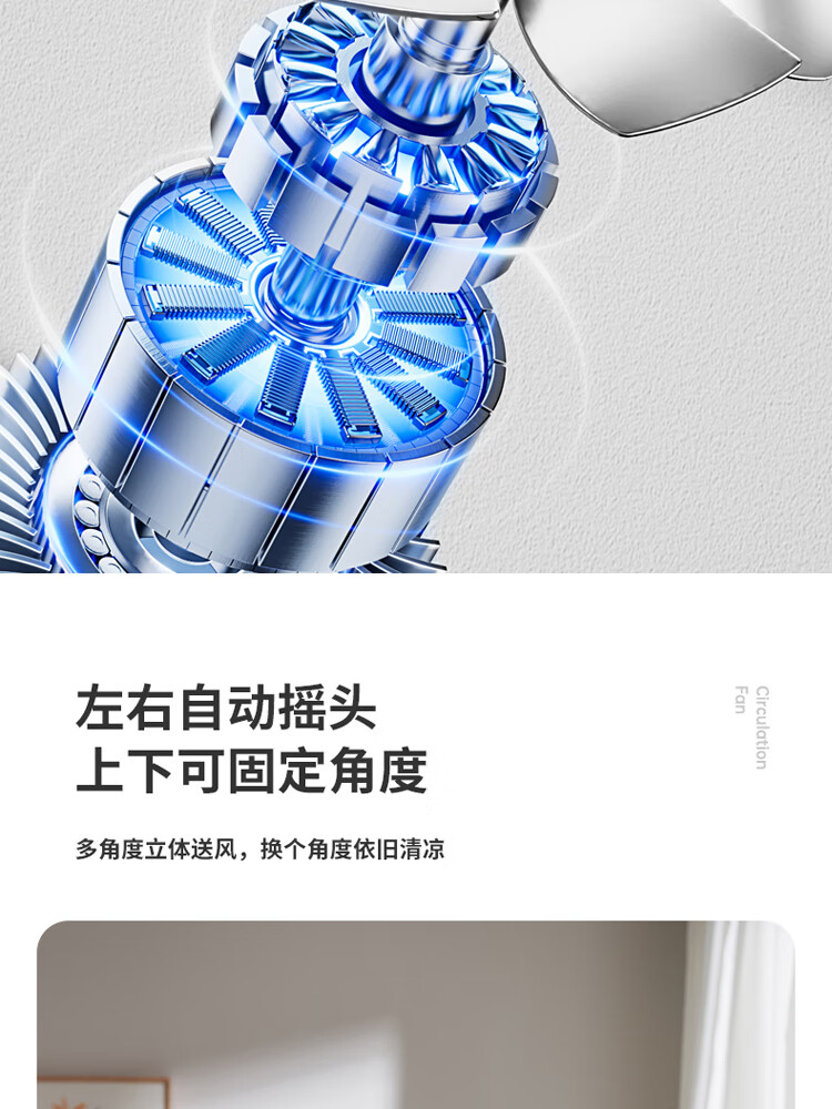 循环空气,风力强大,打造清凉舒适的夏季;三挡风速可调,匹配专属自己的适宜风量;左右自动摇头,上下90度手动摇头,大范围广角送风