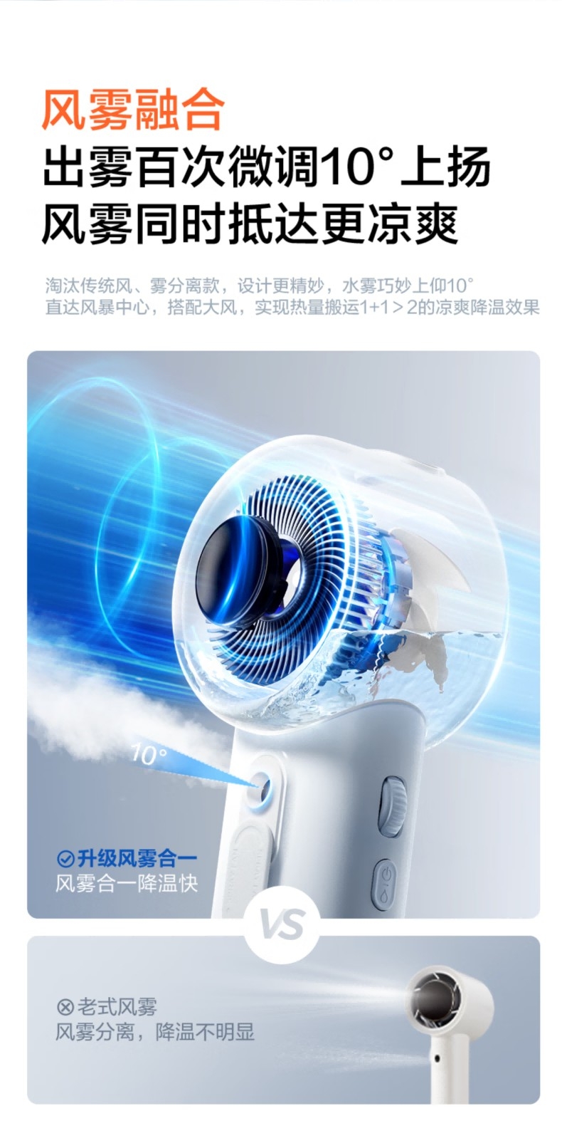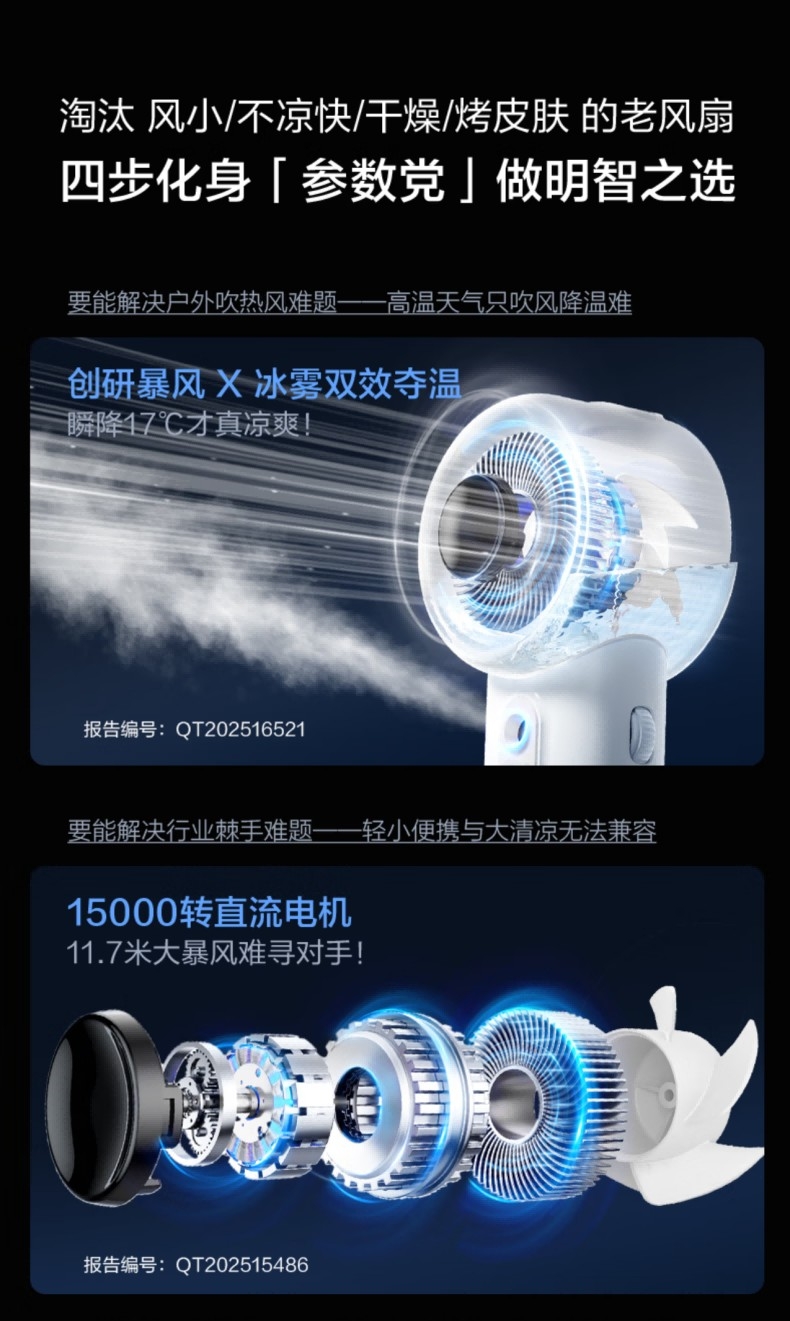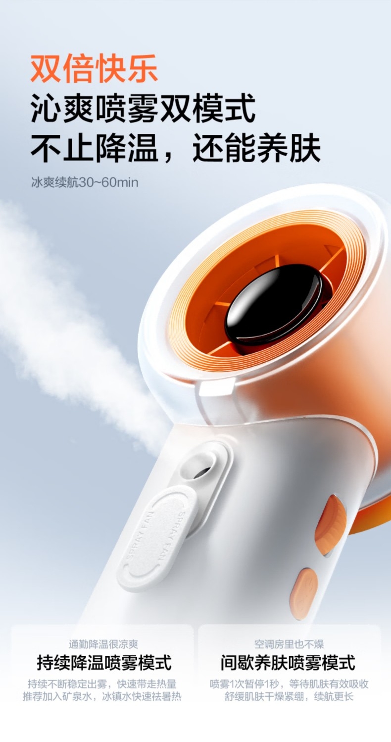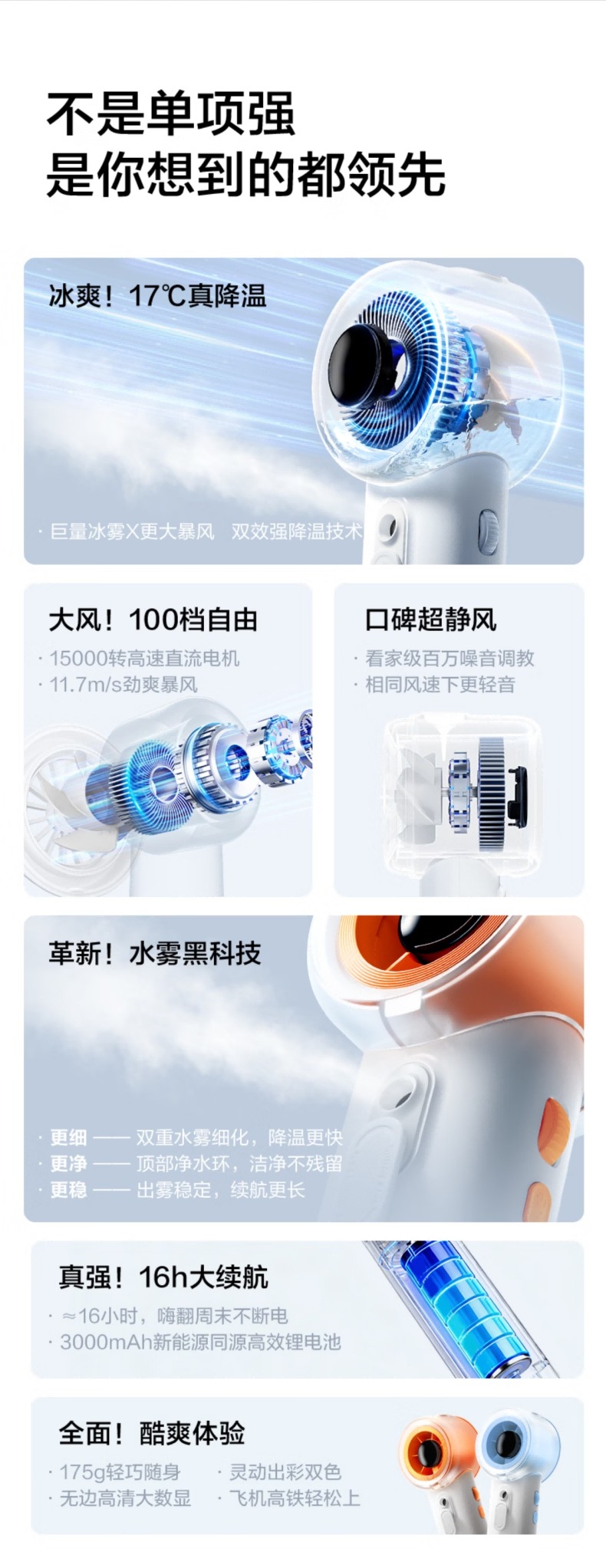 直流无刷电机,15000 转超高速;风雾双效,降温+补水二合一,纳米级精细喷雾;高清大数显,100档拨轮轻滚无极调;3000mAh高能锂电长续航+快充,最长续航16小;低噪运行,风量大噪音小