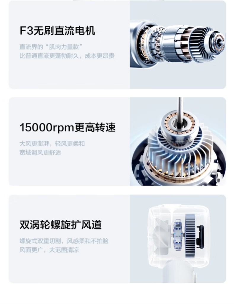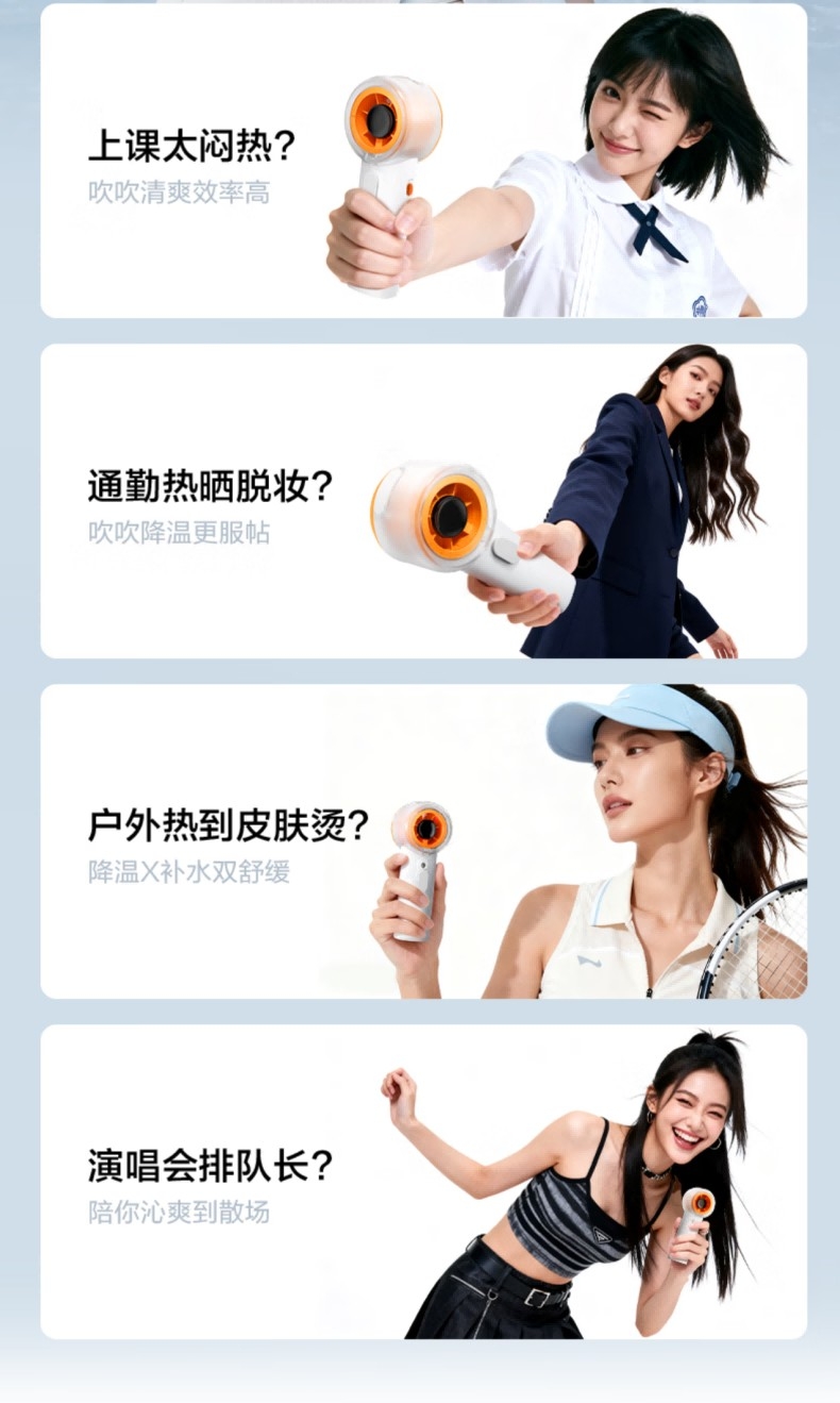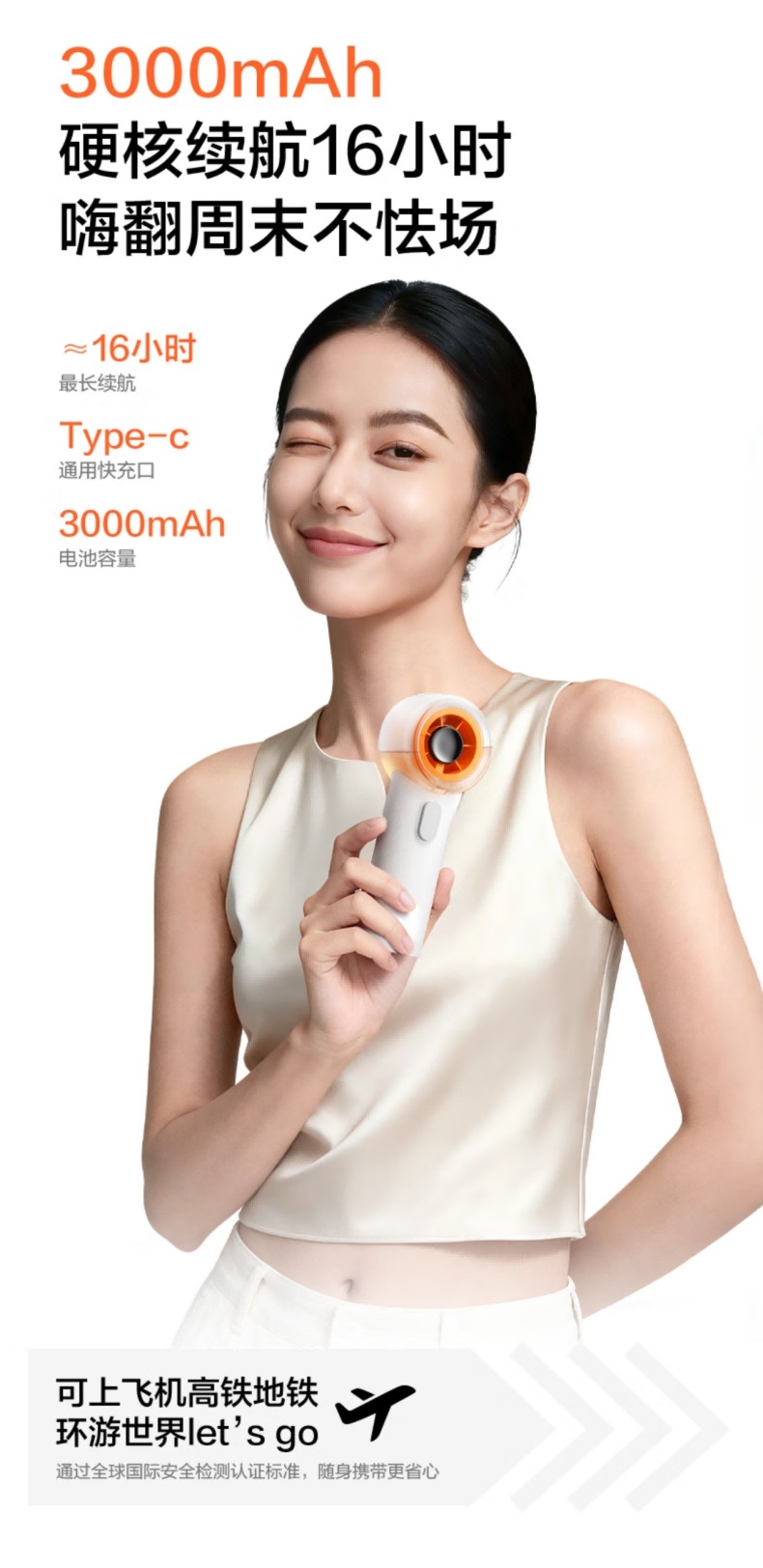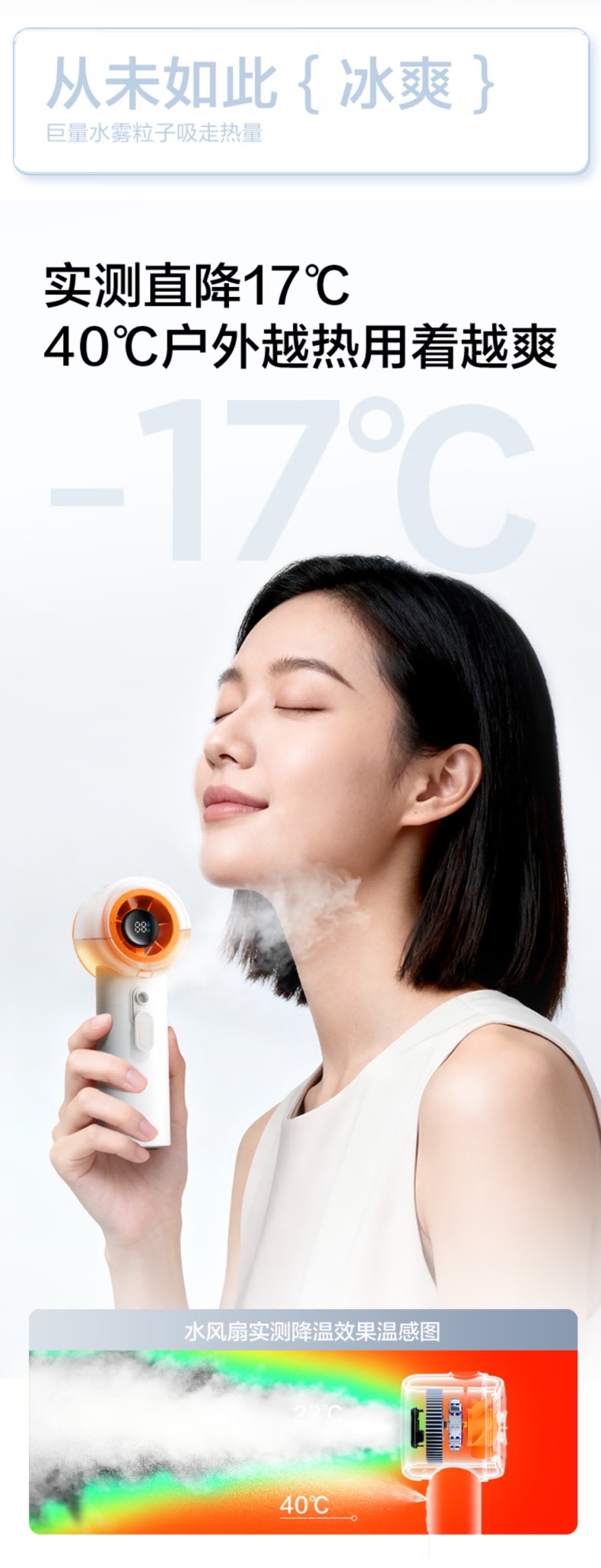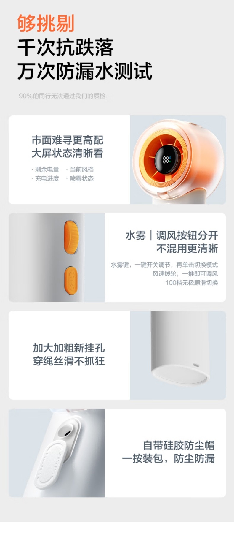 直流无刷电机,15000 转超高速;风雾双效,降温+补水二合一,纳米级精细喷雾;高清大数显,100档拨轮轻滚无极调;3000mAh高能锂电长续航+快充,最长续航16小;低噪运行,风量大噪音小