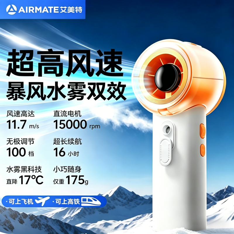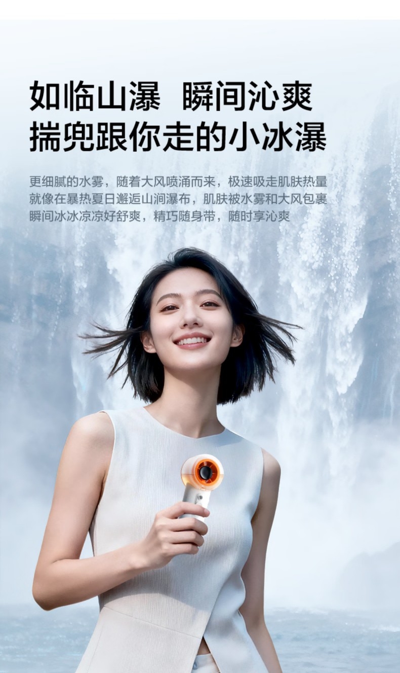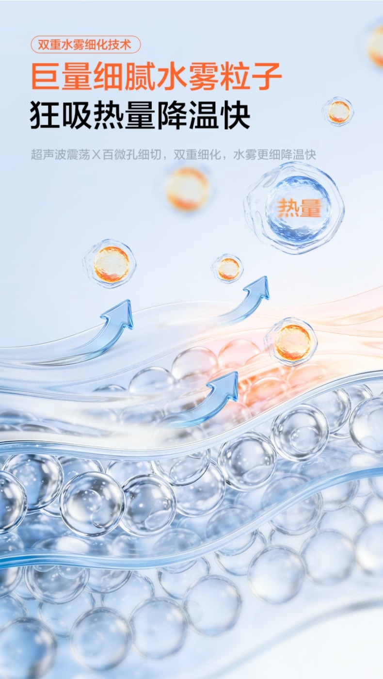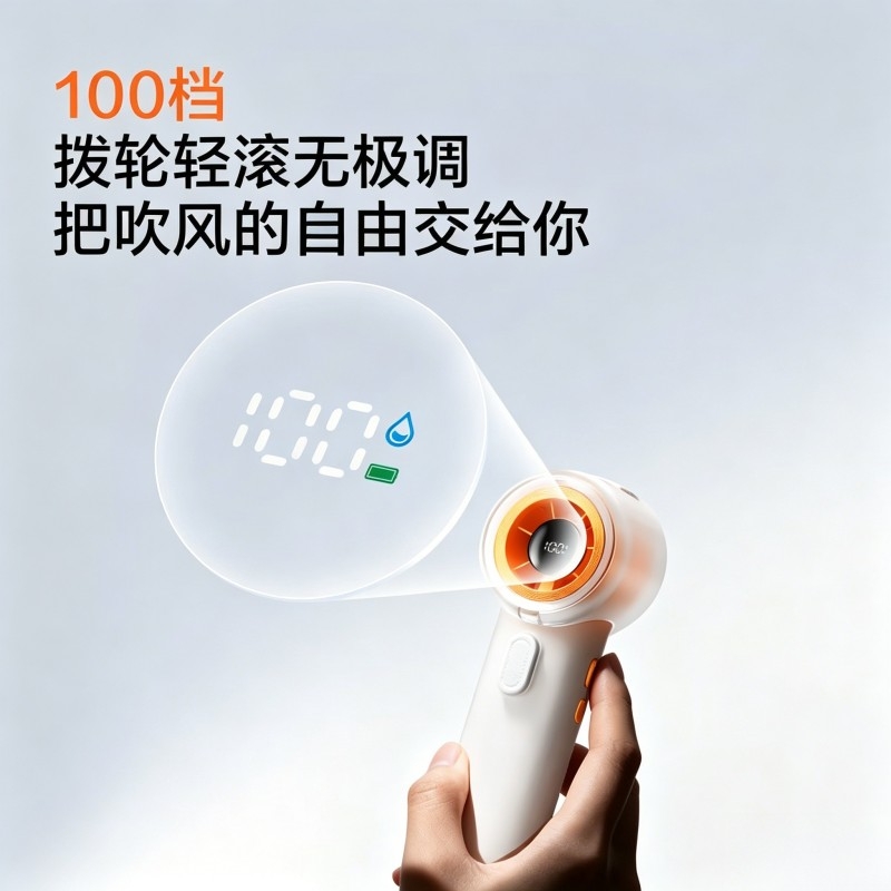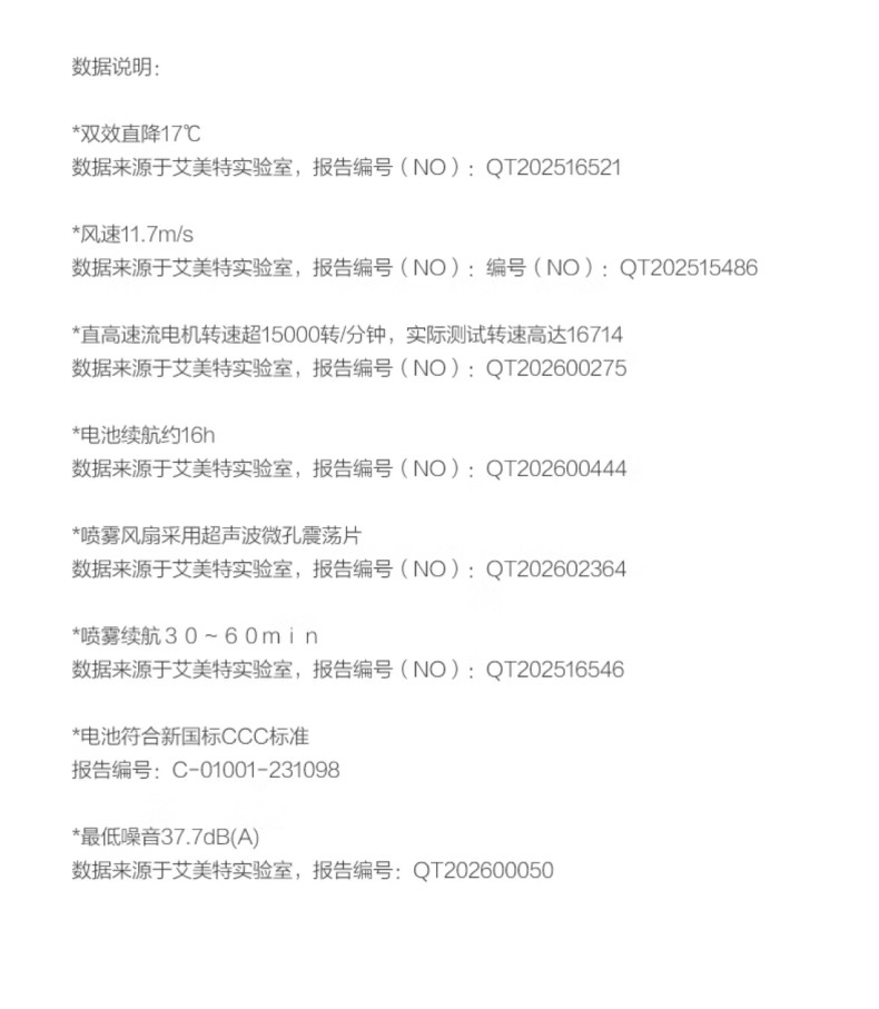 直流无刷电机,15000 转超高速;风雾双效,降温+补水二合一,纳米级精细喷雾;高清大数显,100档拨轮轻滚无极调;3000mAh高能锂电长续航+快充,最长续航16小;低噪运行,风量大噪音小
