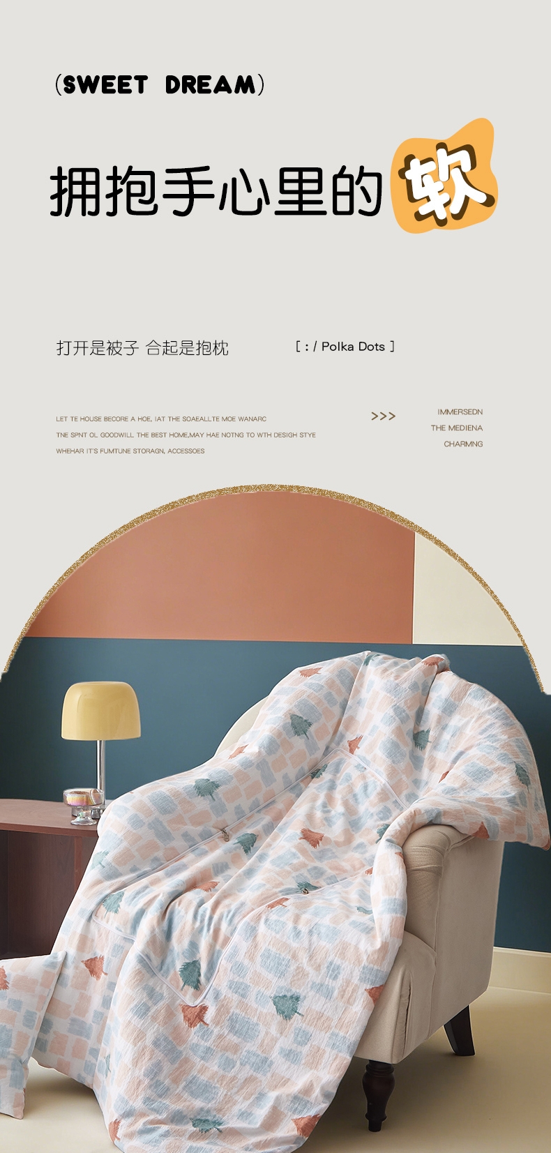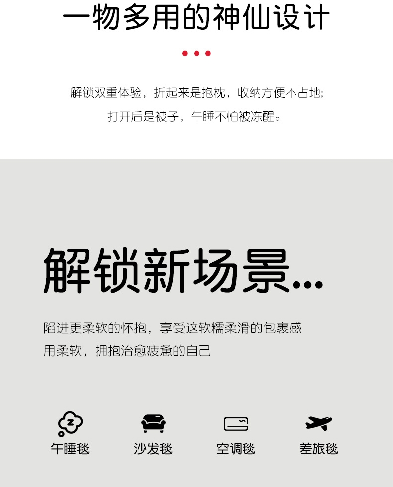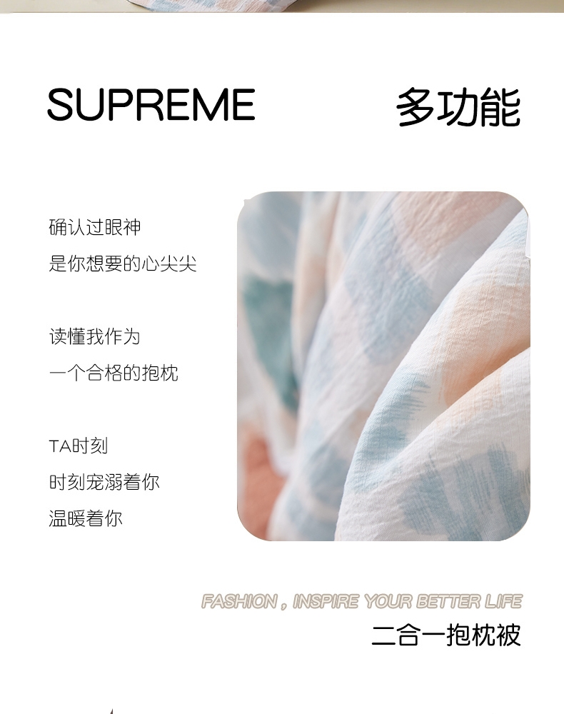 产品面料采用优质泡芙棉,软糯细腻,色泽靓丽;完美的产品用真实的柔软拥抱您的每一寸肌肤;枕、被子、披肩、垫被等多功能使用