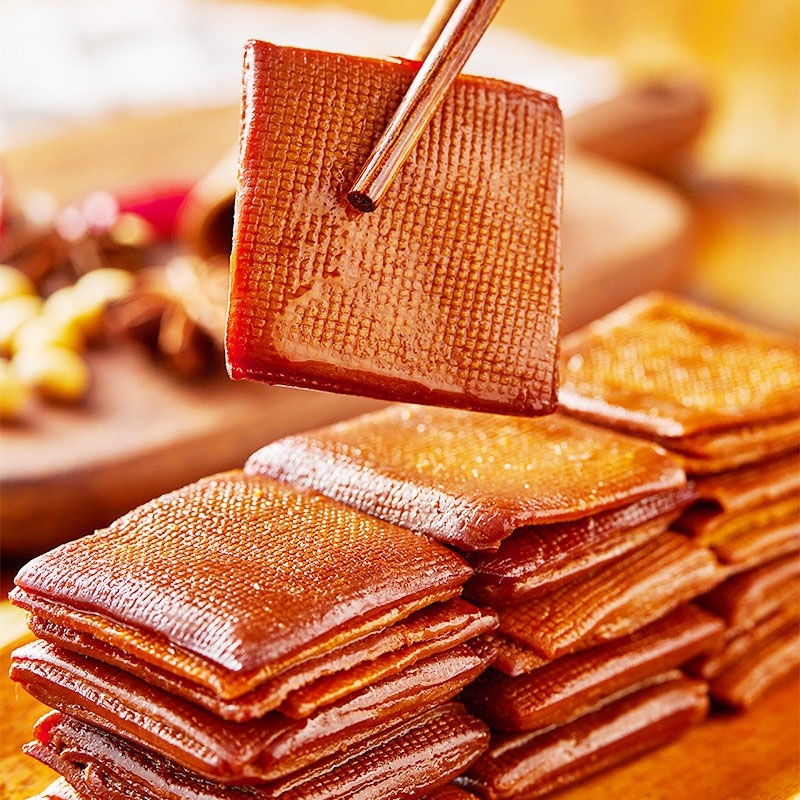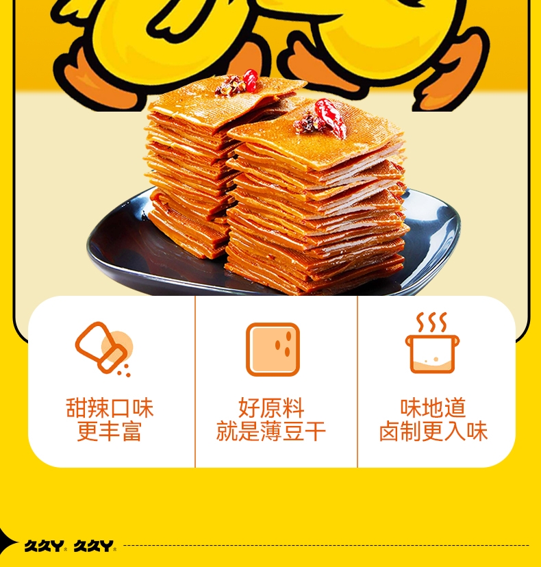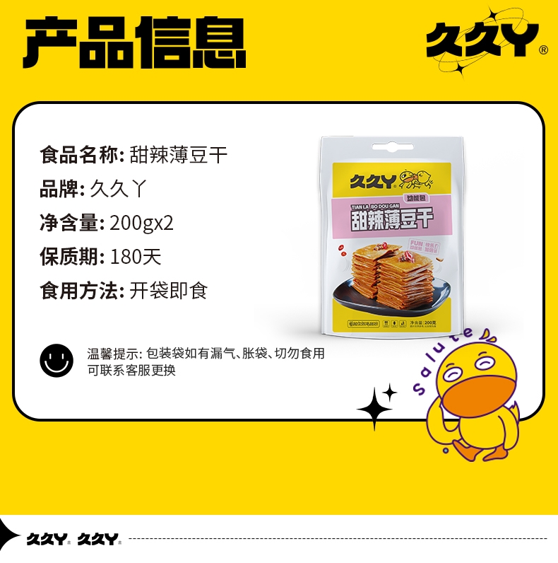 薄款片状豆干,口感紧实 Q 弹有嚼劲;甜辣卤香口味,甜辣均衡不呛辣;独立小包装 + 足量两袋
