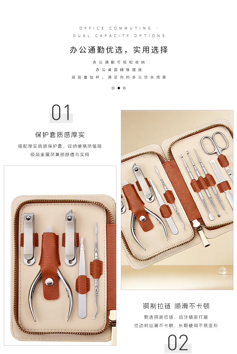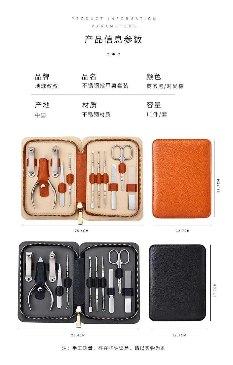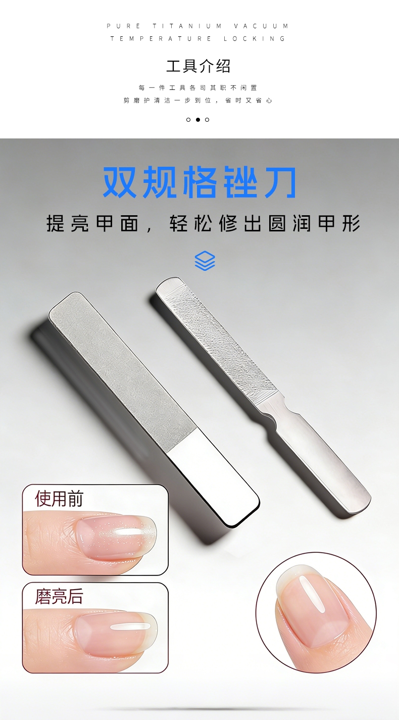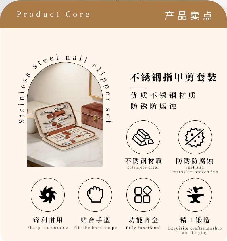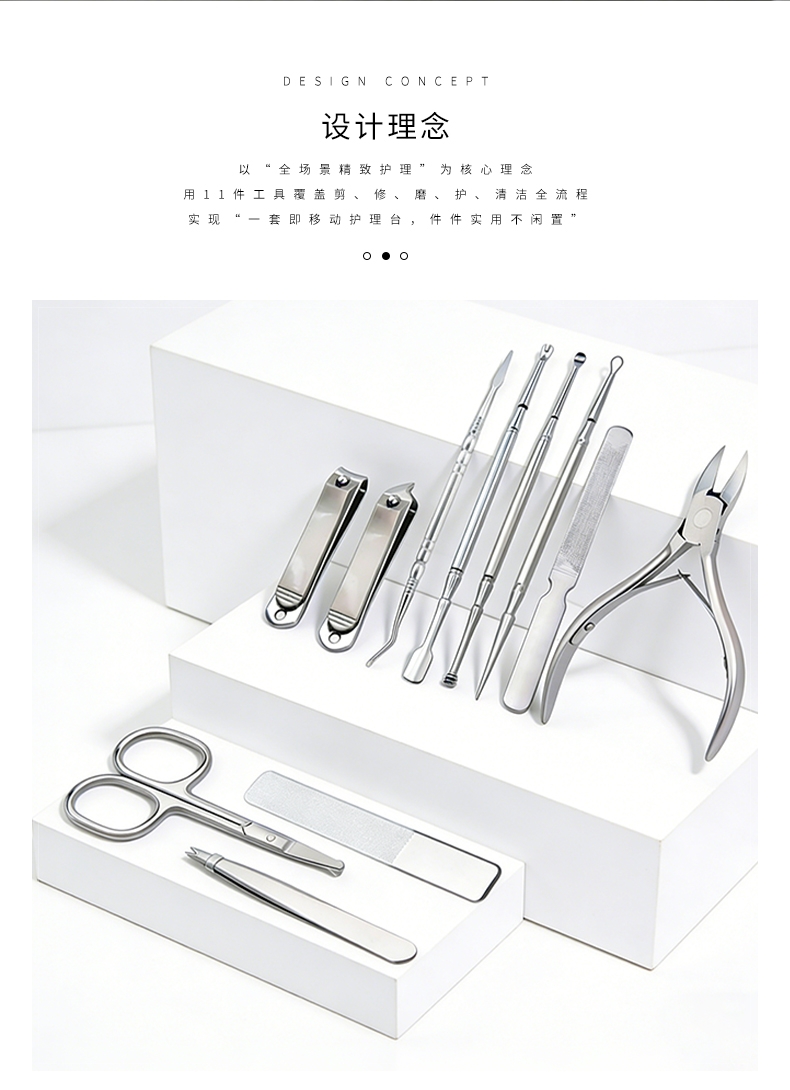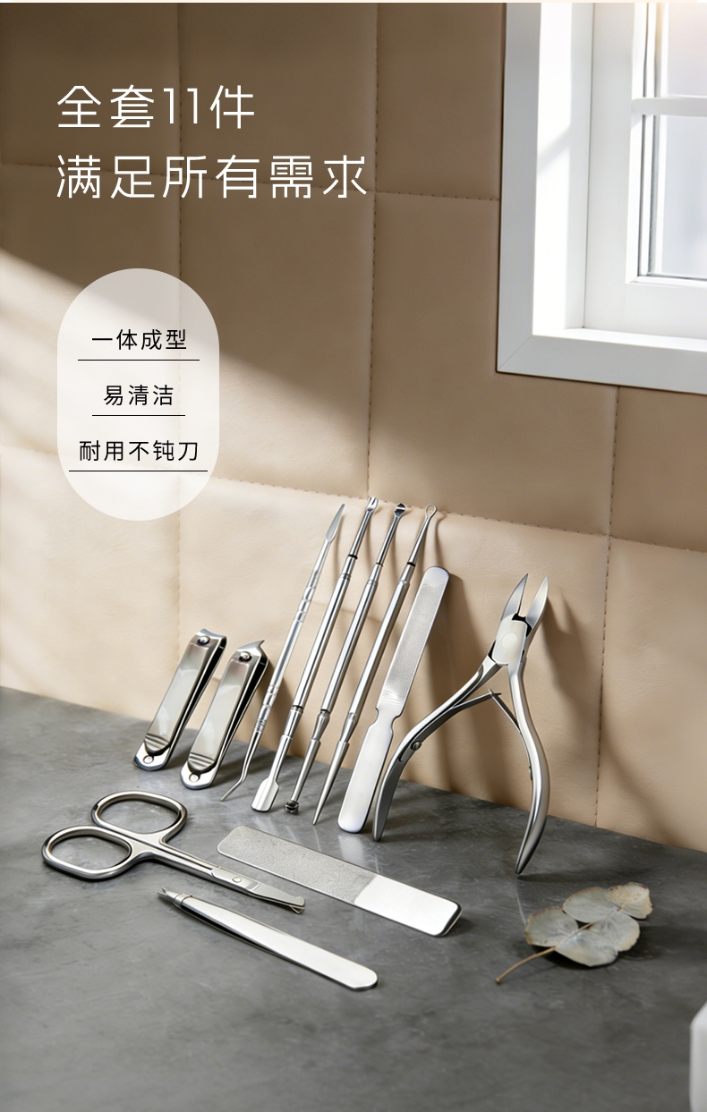 精选优质钢精工锻造,防锈耐腐蚀;锋利耐用不钝刀,贴合手型的设计让你久握不累;覆盖剪、修、磨、护、清洁,满足日常美甲修甲所需