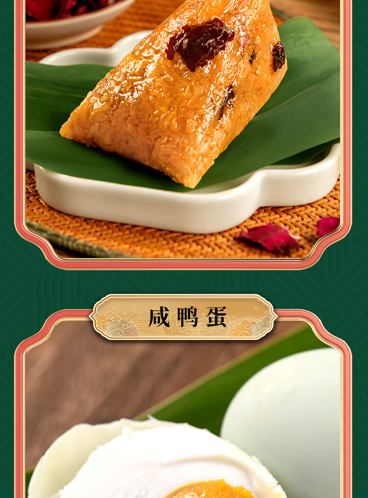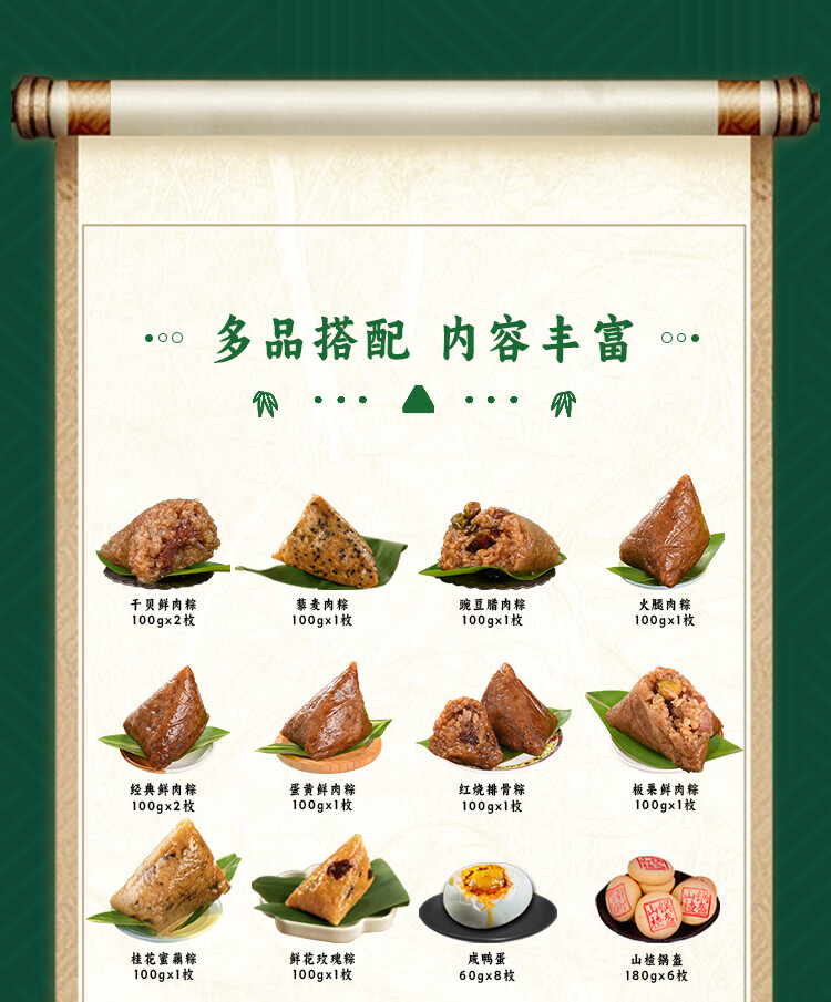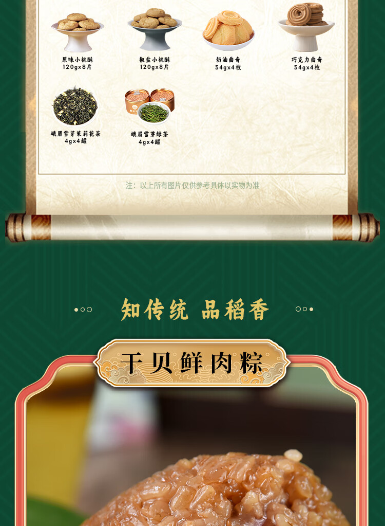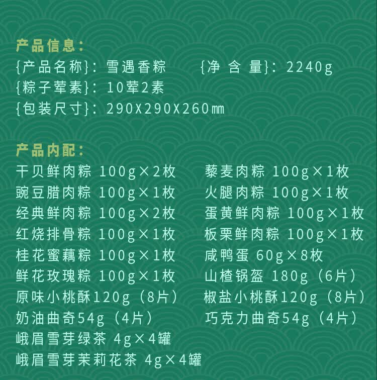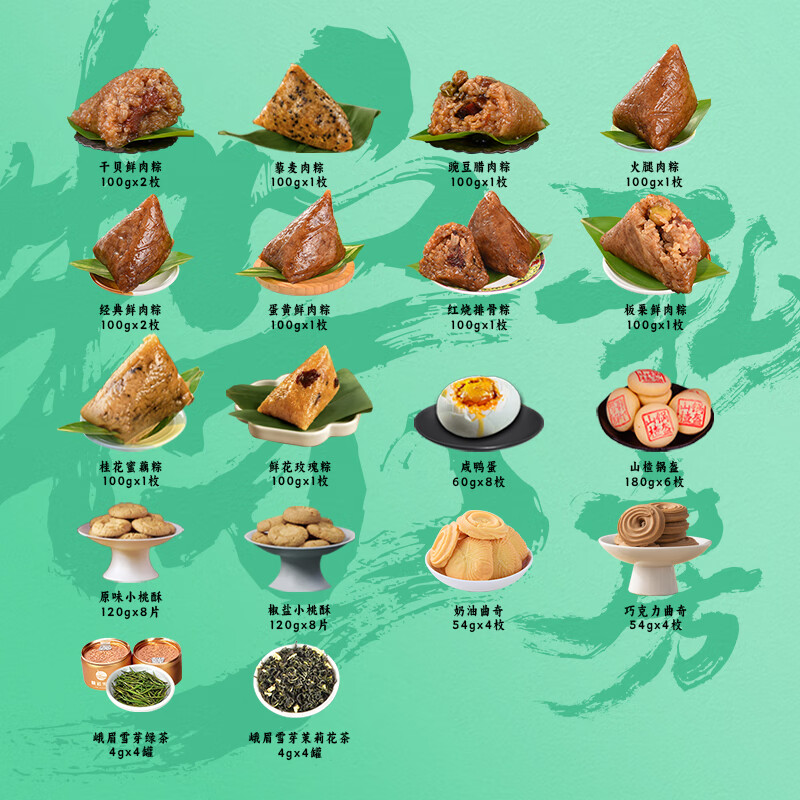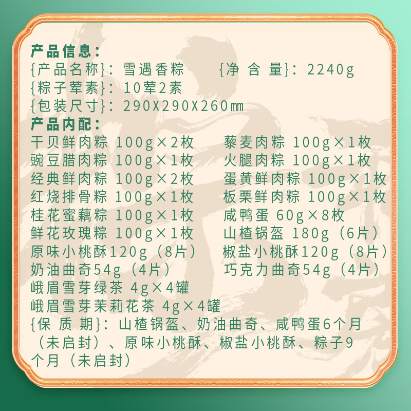 配置:干贝鲜肉粽 100g*2枚 藜麦肉粽100g*1枚 豌豆腊肉粽 100g*1枚 火腿肉粽100g*1枚 经典鲜肉粽 100g*2枚 蛋黄鲜肉粽100g*1枚 红烧排骨粽 100g*1枚 板栗鲜肉粽100g*1枚 鲜花玫瑰粽100g*1枚 桂花蜜藕粽100g*1枚 咸鸭蛋60g*8枚 山楂锅盔180g(6片) 原味小桃酥120g(8片)椒盐小桃酥120g(8片) 奶油曲奇54g(4片) 巧克力曲奇54g(4片) 峨眉雪芽绿茶4g*4罐 峨眉雪芽茉莉花茶4g*4罐