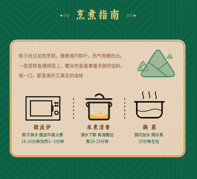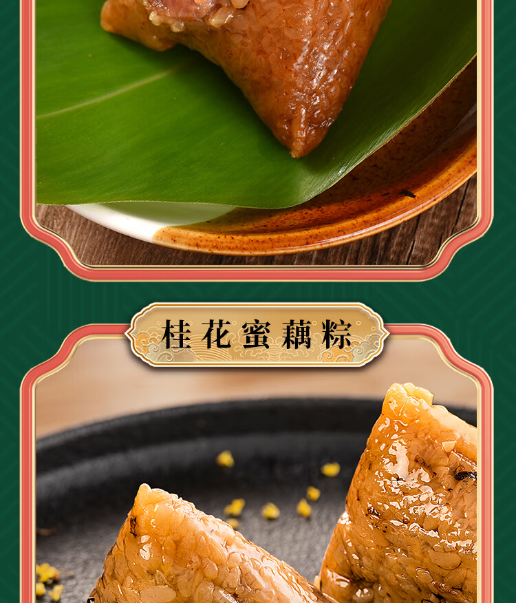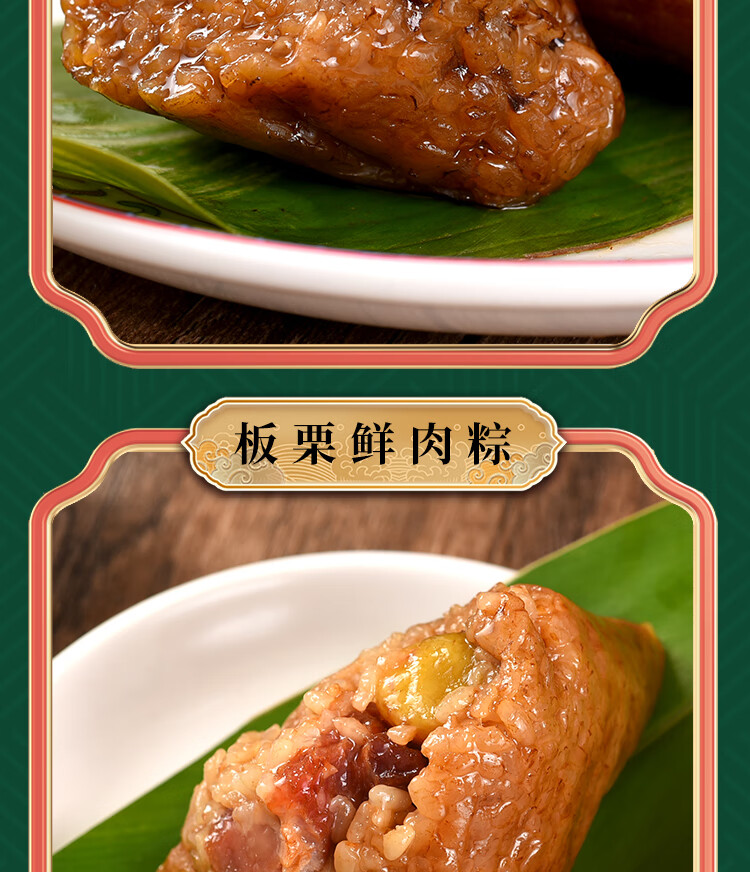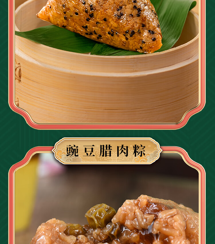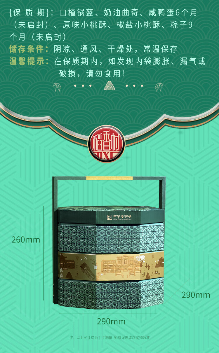 配置:干贝鲜肉粽 100g*2枚 藜麦肉粽100g*1枚 豌豆腊肉粽 100g*1枚 火腿肉粽100g*1枚 经典鲜肉粽 100g*2枚 蛋黄鲜肉粽100g*1枚 红烧排骨粽 100g*1枚 板栗鲜肉粽100g*1枚 鲜花玫瑰粽100g*1枚 桂花蜜藕粽100g*1枚 咸鸭蛋60g*8枚 山楂锅盔180g(6片) 原味小桃酥120g(8片)椒盐小桃酥120g(8片) 奶油曲奇54g(4片) 巧克力曲奇54g(4片) 峨眉雪芽绿茶4g*4罐 峨眉雪芽茉莉花茶4g*4罐