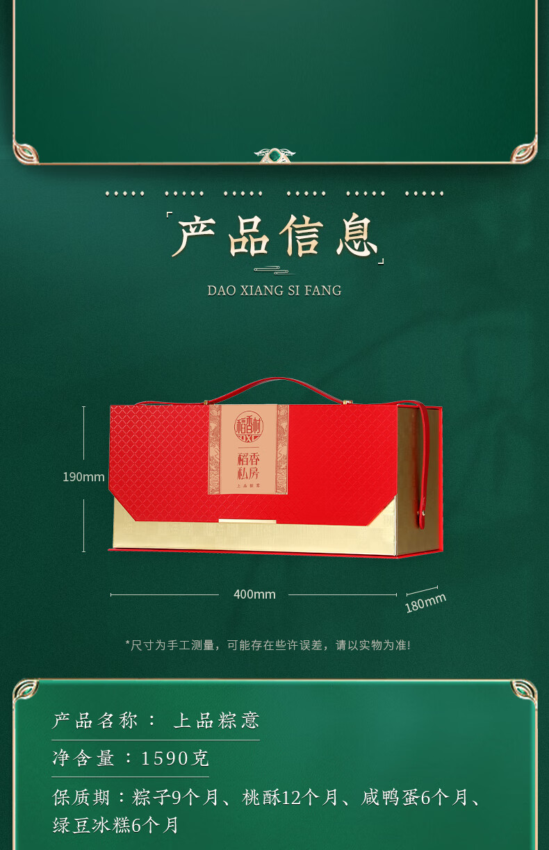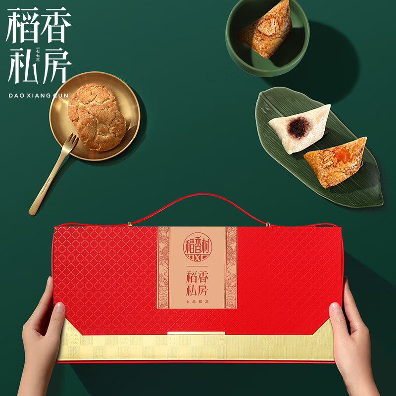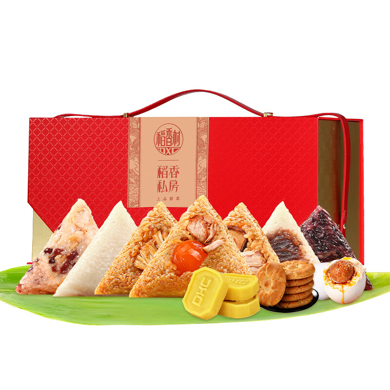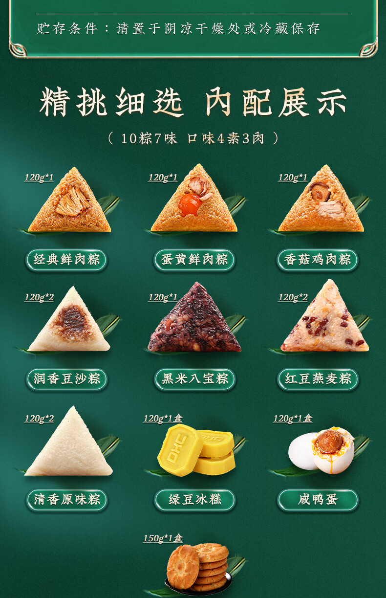 配置:蛋黄鲜肉粽 120g*1枚;经典鲜肉粽 120g*1枚 香菇鸡肉粽 120g*1枚;黑米八宝粽 120g*1枚 润香豆沙粽 120g*2枚;红豆燕麦粽 120g*2枚 清香原味粽 120g*2枚; 抹茶味水晶粽 70g*2枚 绿豆冰糕 120g*1盒; 咸鸭蛋 120g*1盒