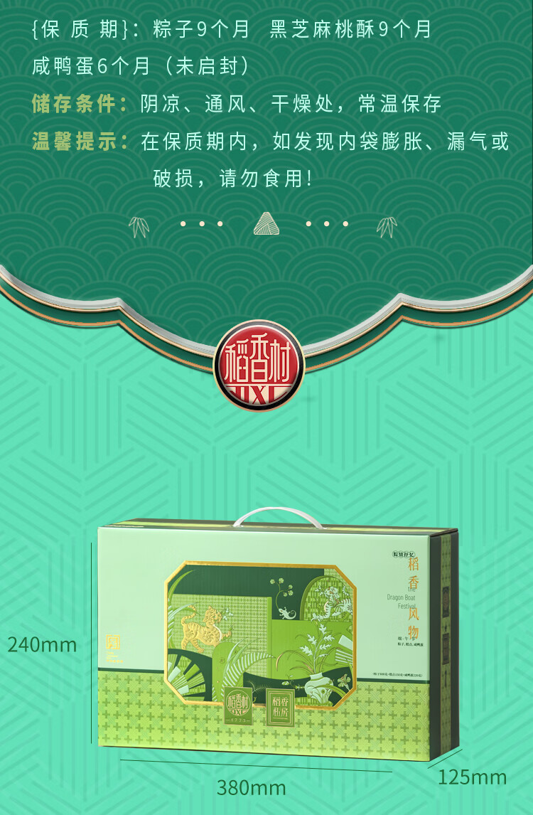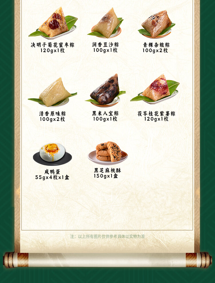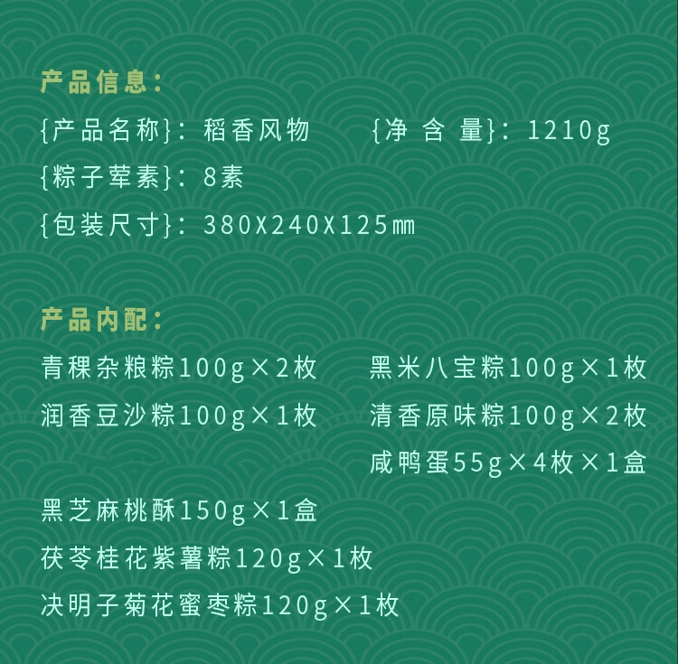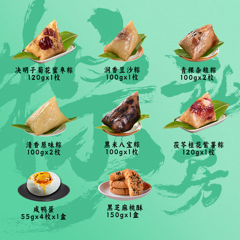 配置:茯苓桂花紫薯粽120g*1枚 决明子菊花蜜枣粽120g*1枚 青稞杂粮粽100g*2枚 黑米八宝粽100g*1枚 润香豆沙粽100g*1枚 清香原味粽100g*2枚 黑芝麻桃酥150g*1盒 咸鸭蛋55g*4枚*1盒
