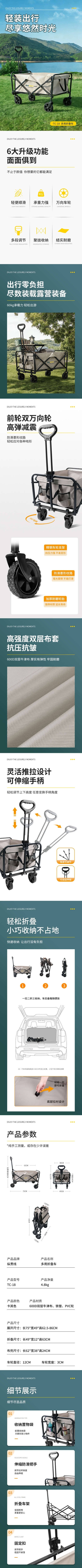 一车搞定,轻松搬运大物件;露营出游零负担 可调节拉杆把手;转向方便,前进更轻松