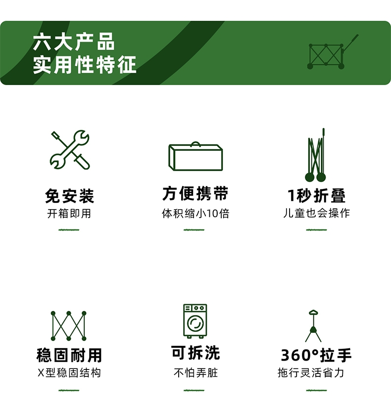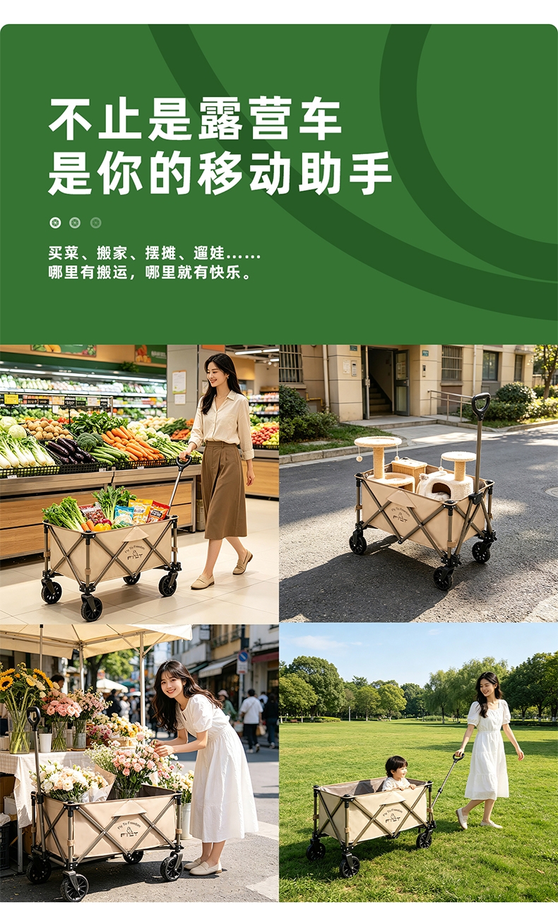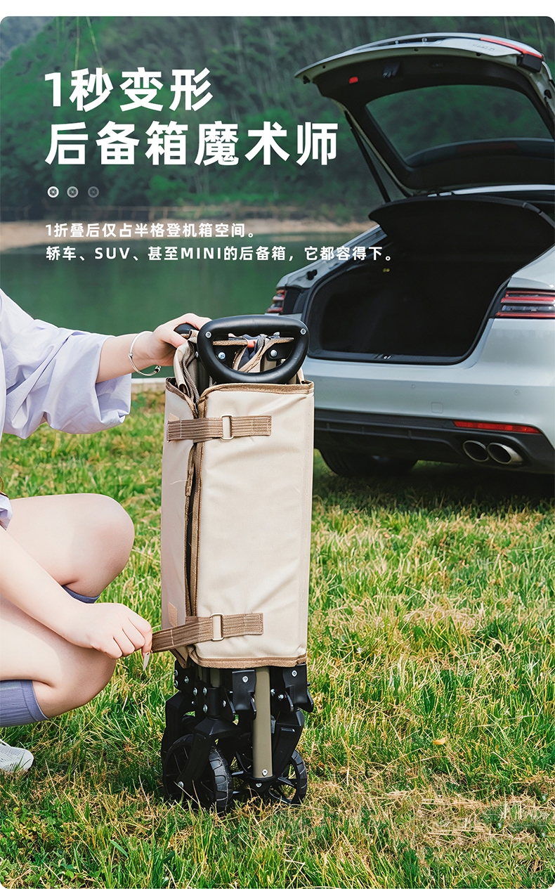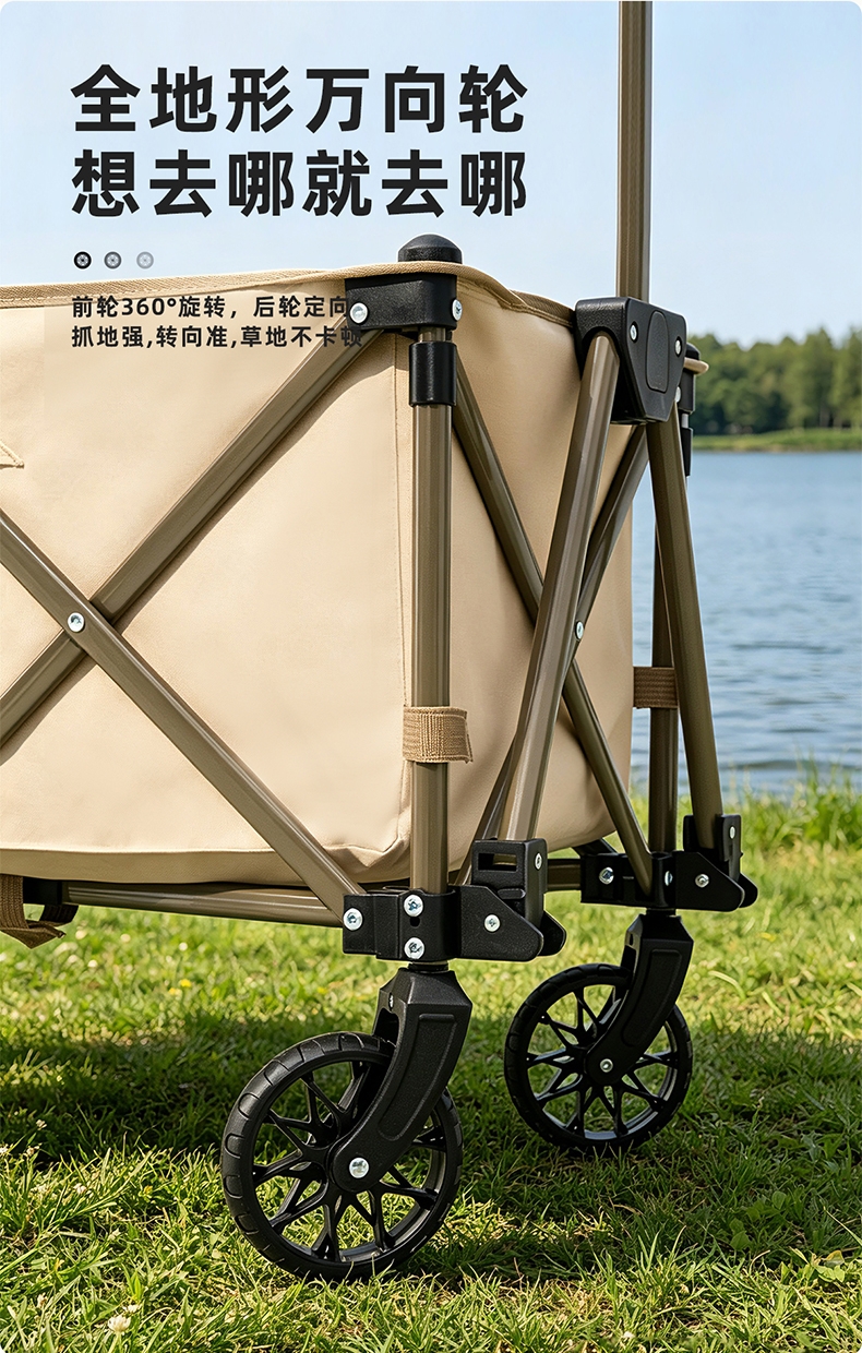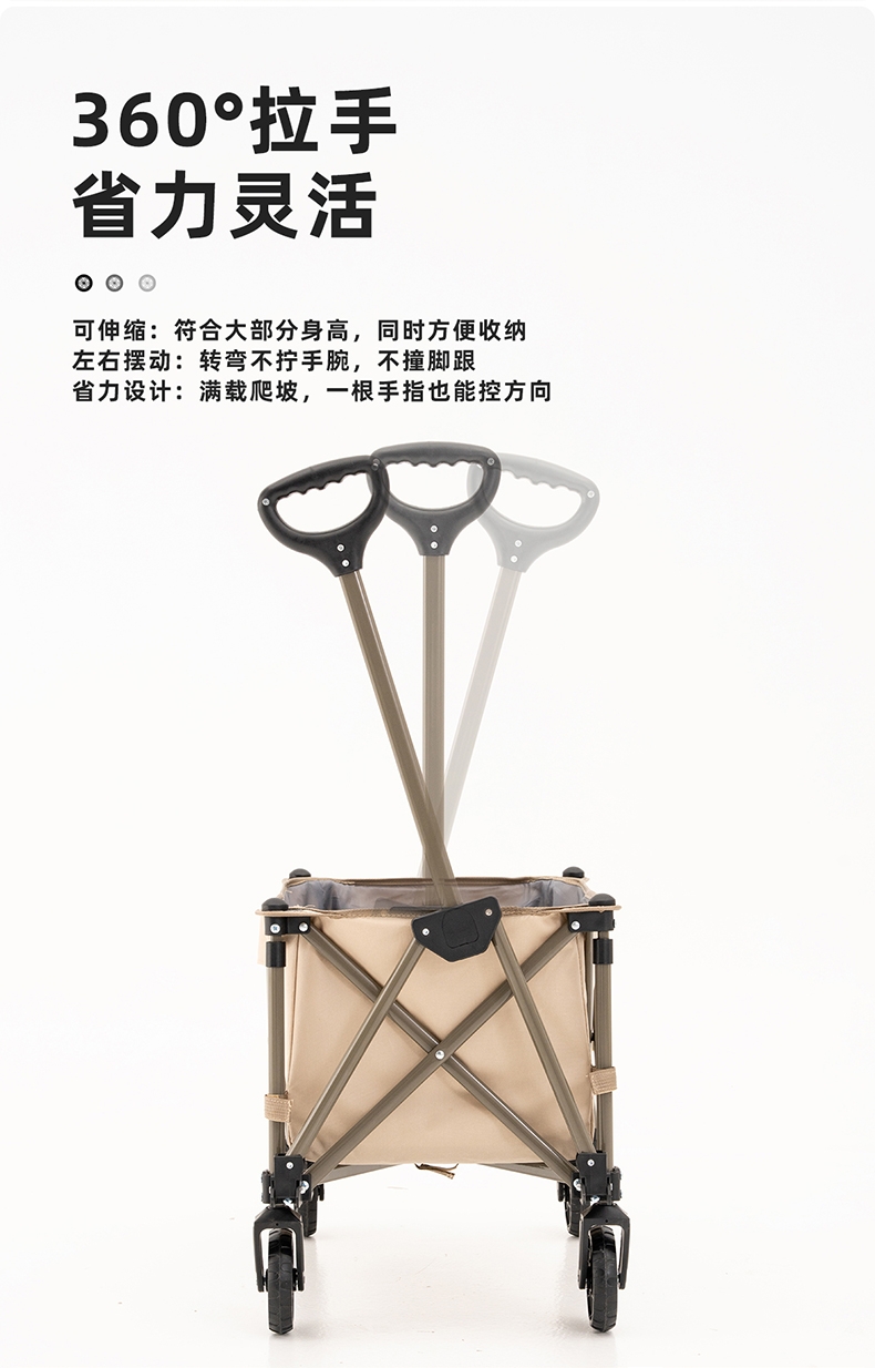 升级聚拢,竖立收纳,不占空间;;喷塑全钢车架,加密牛津布,高承重耐用;;360°万向轮设计,安全使用;可调节手拉、自由掌控、灵活顺手;