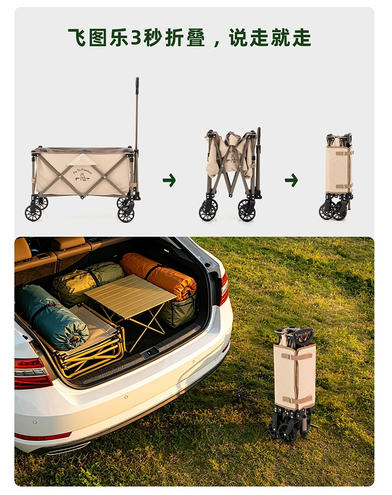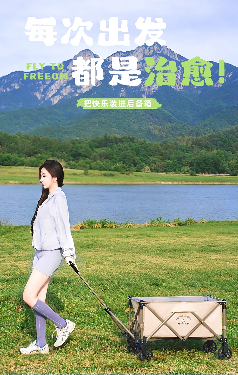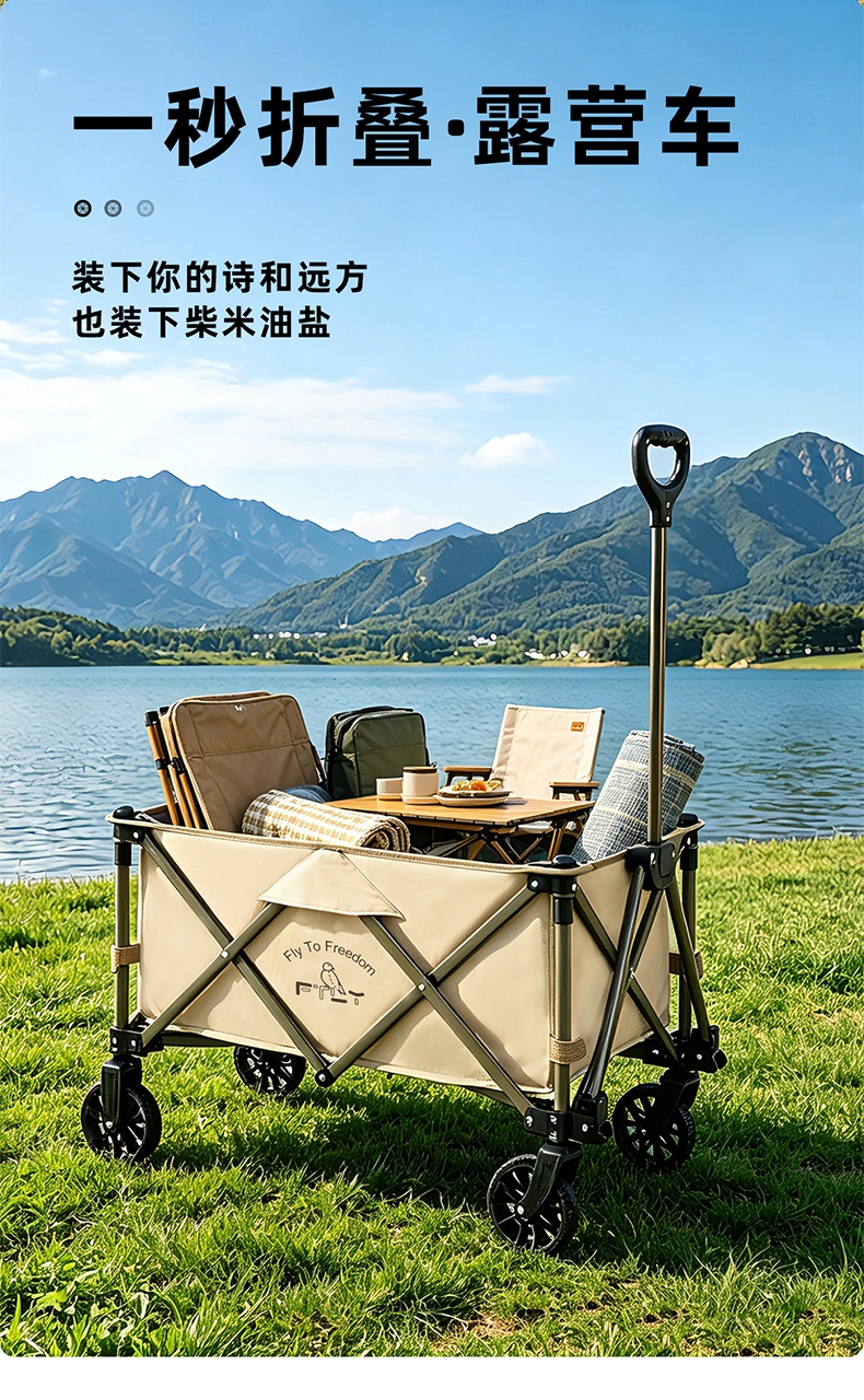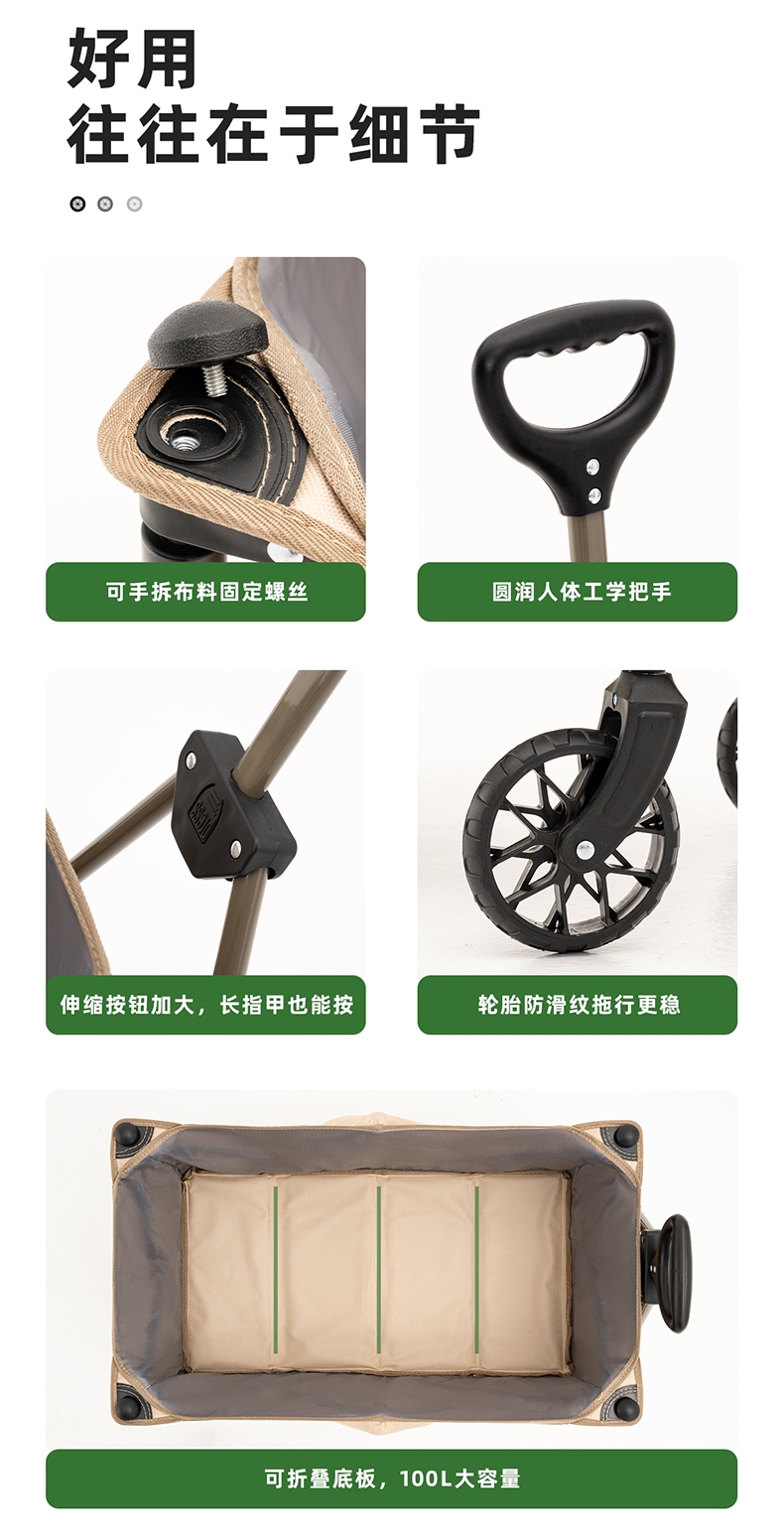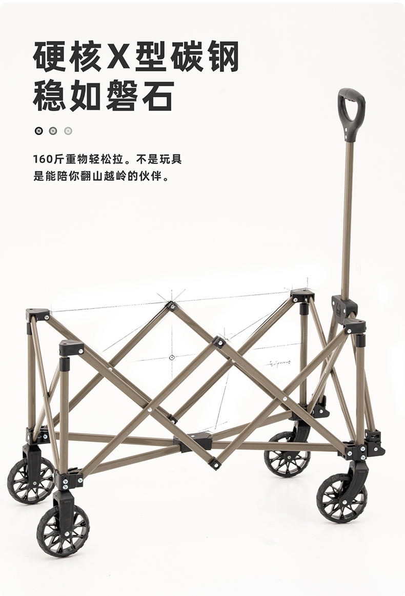 升级聚拢,竖立收纳,不占空间;;喷塑全钢车架,加密牛津布,高承重耐用;;360°万向轮设计,安全使用;可调节手拉、自由掌控、灵活顺手;